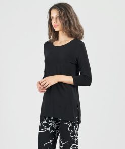 Tie you look up in a bow with our Back Tie Side Vent Tunic! This tunic features a scoop neckline, 3/4 length sleeves, a charming back tie detail with a shark bite hemline, and dual side vents that create a flattering silhouette. Carefree Travel Fabric – Soft Silky Knit Our signature poly blend fibers offer luxurious softness with lightweight, wrinkle-free comfort. This easy-care fabric is quick drying and cooler than linen or cotton, making it perfect for on-the-go wear.Wrinkle Free Travel Friendly Ultra Lightweight Soft Knit Fabric Breathable Jersey-Like Feel