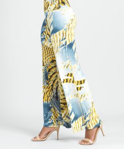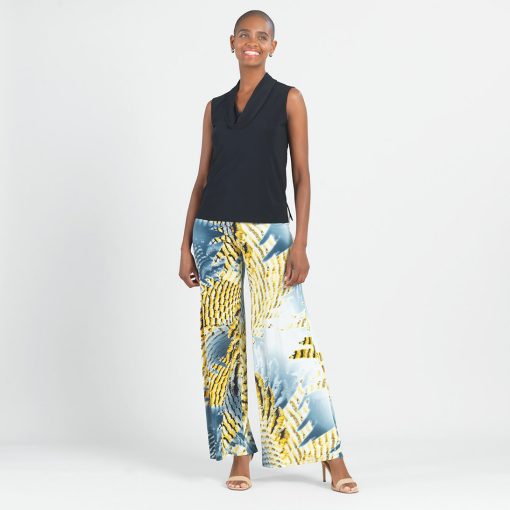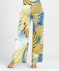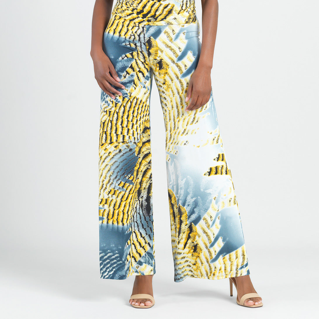 Spread your wings and soar to new fashion heights in our Palm Feather Palazzo Pant! Featuring a 3” pull-on soft waistband and ultra-flattering wide-leg silhouette that naturally flows against the body. A one-of-a-kind print, displaying graphic feathers comprised of yellow and black in palm leaf shapes, encompassed by an ivory and silver-grey gradient effect. ♥ Each piece is a unique, one-of-a-kind print and print placement will vary. An elegant, translucent fabric, inspired by luxe satin fibers. Designed to beautifully drape against the body, with the softest, velvety-silken-like finish, while being cool and smooth to the touch. Carefree Travel Fabric – Soft Silky Buttery Knit Our signature poly blend fibers create an ultra-soft, buttery feel that’s wrinkle-free and perfect for traveling. Enjoy the luxurious sensation and an indulgent touch of our fabric – you’ll never want to take it off!Wrinkle Free Travel Friendly Ultra Lightweight Soft Buttery Knit Fabric Breathable Jersey-Like Feel