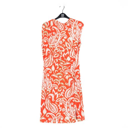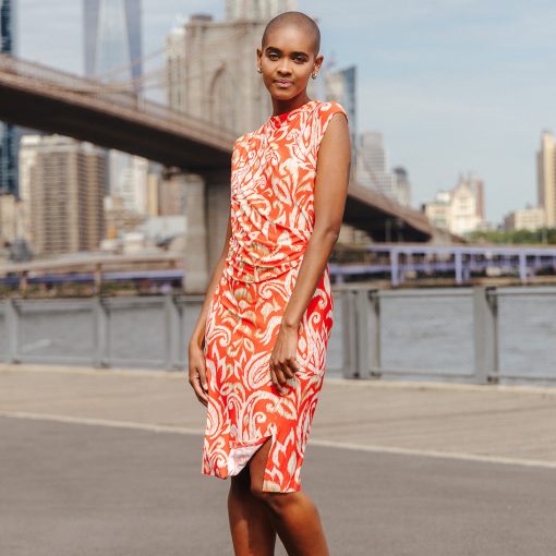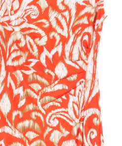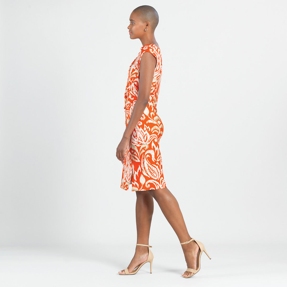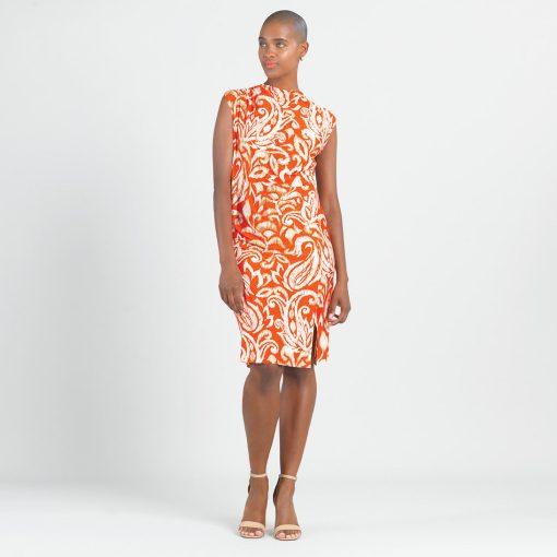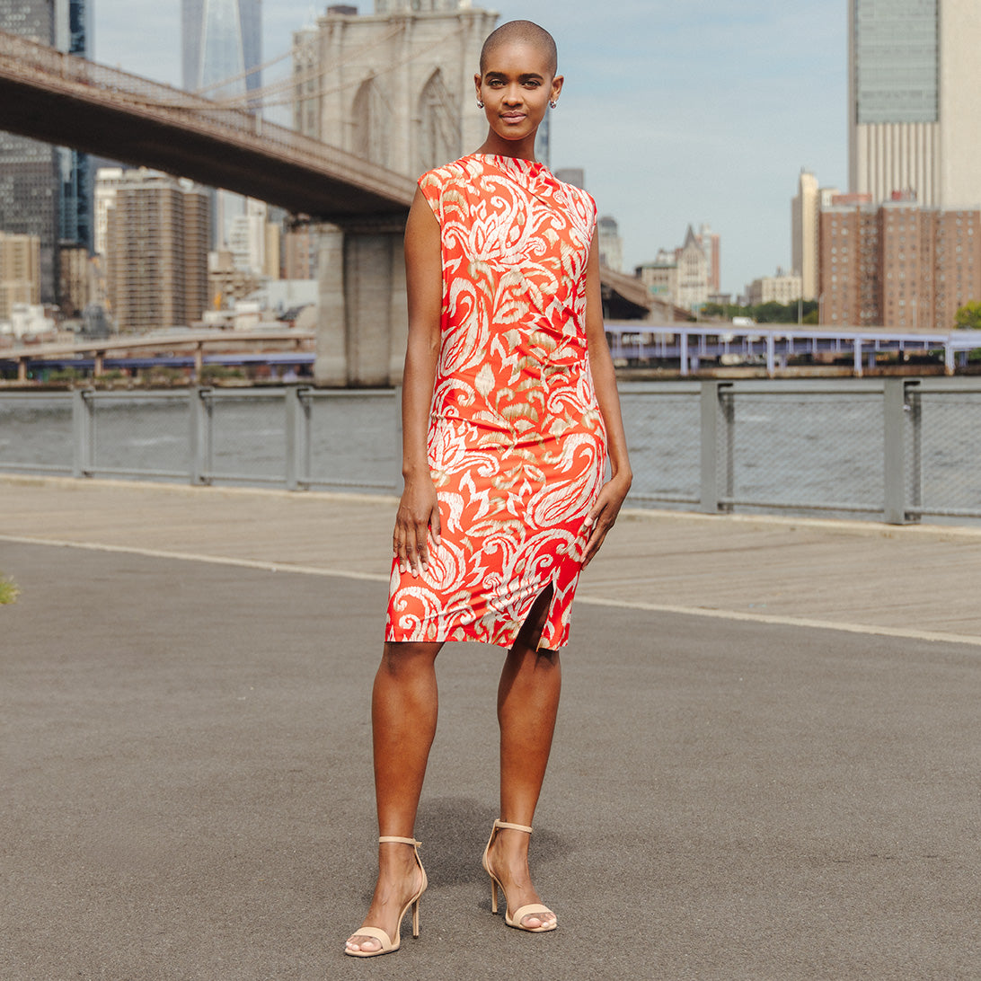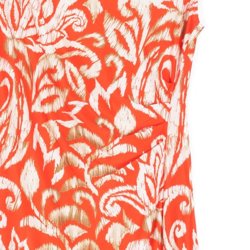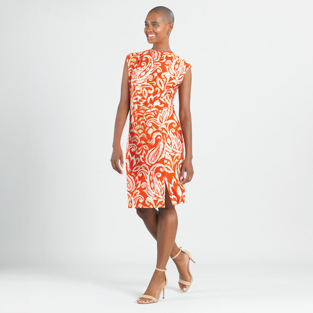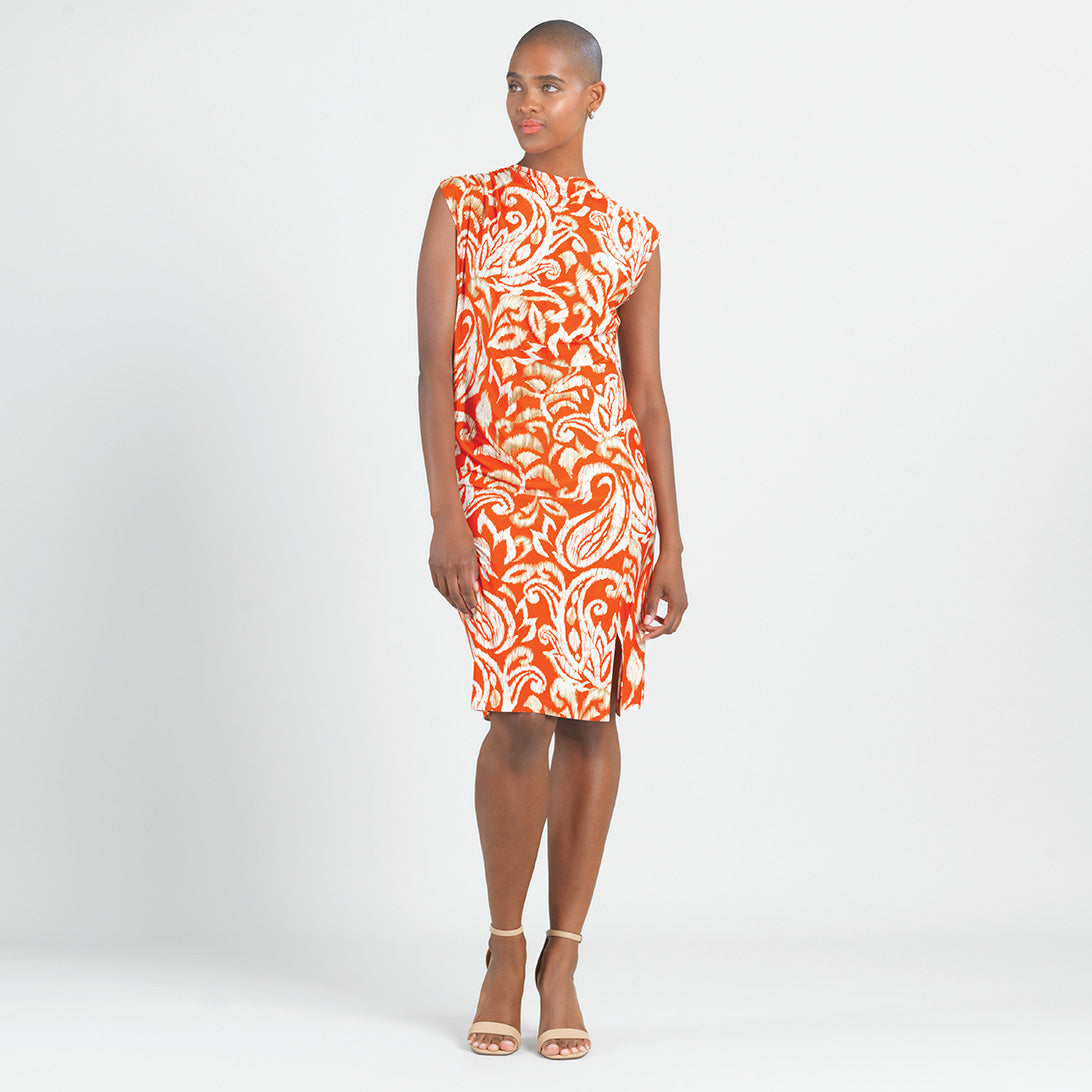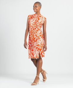 Are you looking for that perfect style that will instantly refresh your wardrobe? Well, our Paisley Lotus Butter Knit Side Slit Midi Dress is sure to breathe new life into it! This stunning dress features a high draped neckline, cap sleeves, a ruched side bodice that creates a flattering draped silhouette, and a 10″ left side slit with a midi hemline.An elegantly feminine print displaying a large-scale paisley design in lotus flower shapes, comprised of a warm, orange-toned coral, ivory, and shades of tan. ♥ Each piece is a unique, one-of-a-kind print and print placement will vary. An elegant, translucent fabric, inspired by luxe satin fibers. Designed to beautifully drape against the body, with the softest, velvety-silken-like finish, while being cool and smooth to the touch. Carefree Travel Fabric – Soft Silky Buttery Knit Our signature poly blend fibers create an ultra-soft, buttery feel that’s wrinkle-free and perfect for traveling. Enjoy the luxurious sensation and an indulgent touch of our fabric – you’ll never want to take it off!Wrinkle Free Travel Friendly Ultra Lightweight Soft Buttery Knit Fabric Breathable Jersey-Like Feel 10″ Side Left Slit