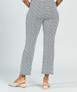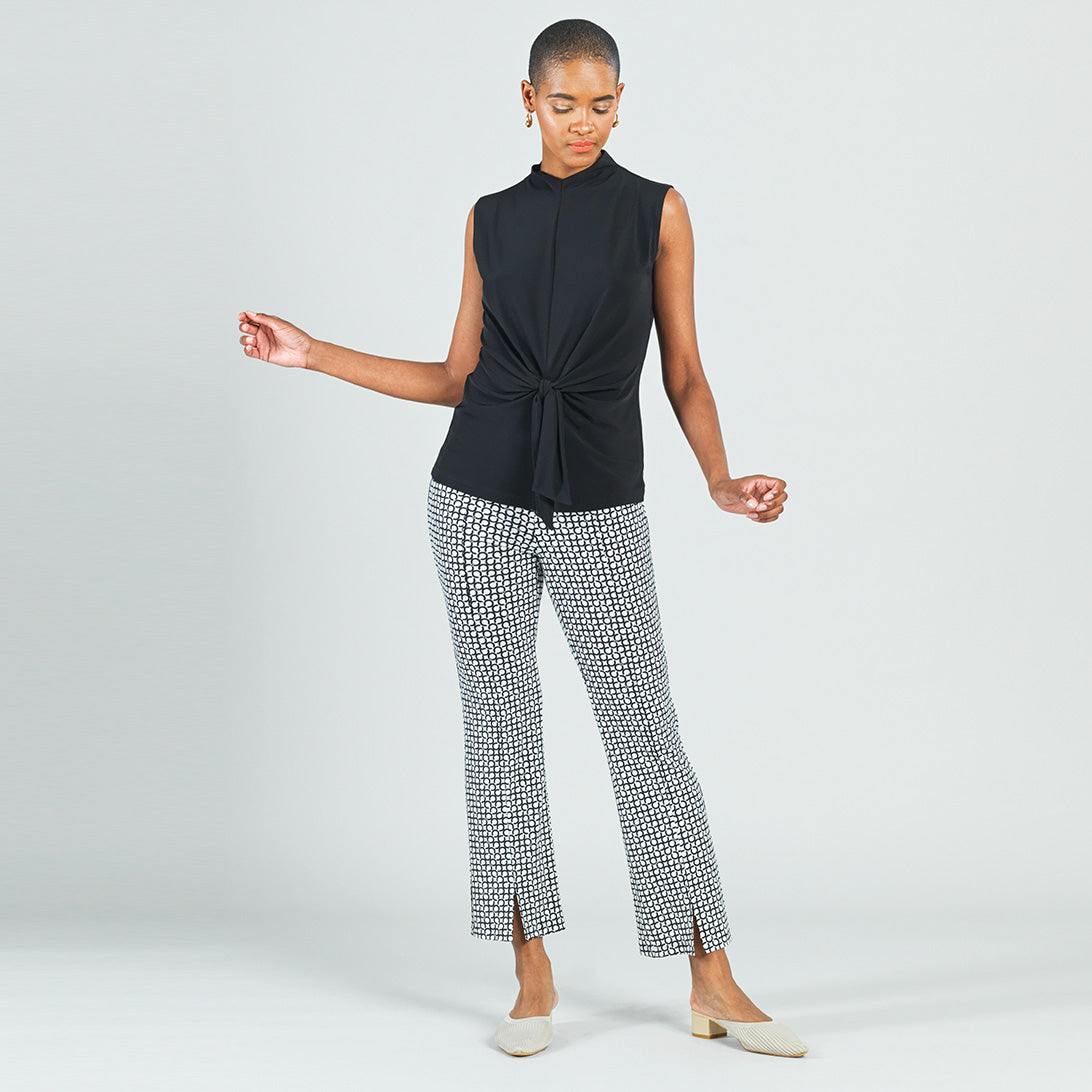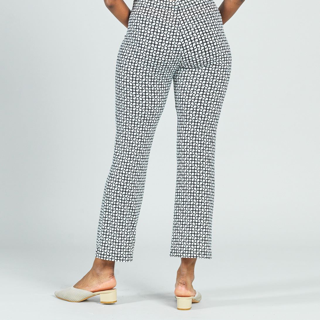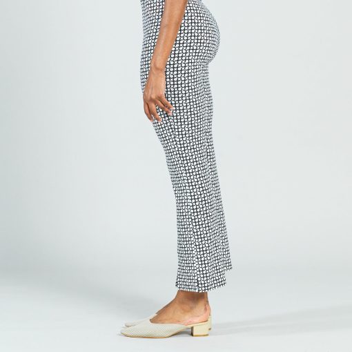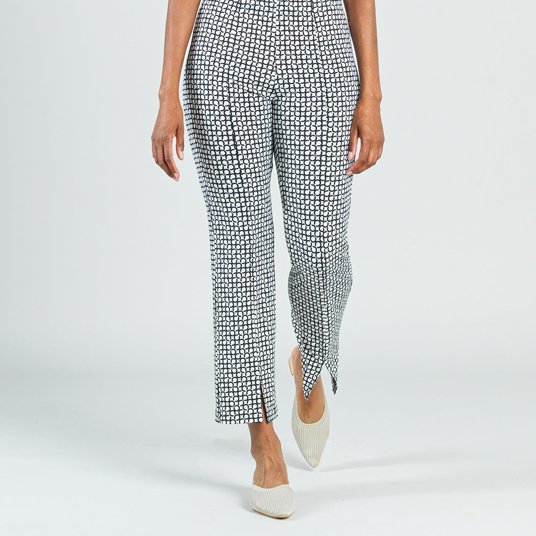 Our Chain Ring Center Seam Front Slit Ankle Pant is definitely the missing link to updating your wardrobe! This stylish pant features a 1” pull-on elastic waistband, vertical center leg seam with a flared ankle-length hem, and sleek front leg slit. Made to provide a slimming silhouette in the hip and thigh area while gradually flaring towards the hem. A graphic ivory and black pattern, displaying a cluster of mini chain rings. ♥ Each piece is a unique, one-of-a-kind print and print placement will vary. Carefree Travel Fabric – Soft Silky Knit Our signature poly blend fibers offer luxurious softness with lightweight, wrinkle-free comfort. This easy-care fabric is quick drying and cooler than linen or cotton, making it perfect for on-the-go wear.1″ Elastic Waistband 4.5″ to 5″ Front Slit Flared Opening Center Seam Detail Wrinkle Free Travel Friendly Ultra Lightweight Soft Knit Fabric Breathable Jersey-Like Feel