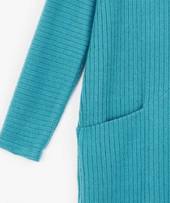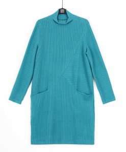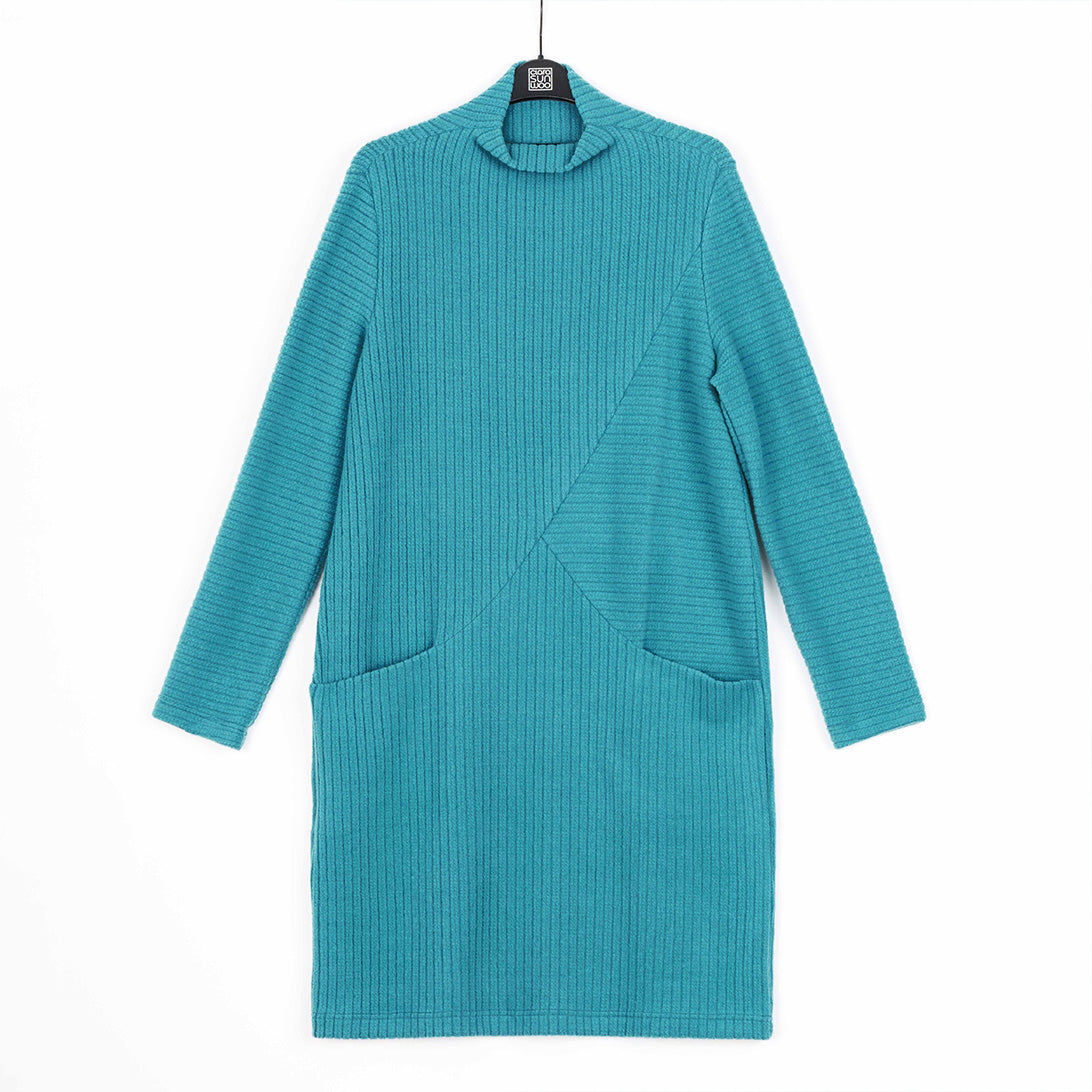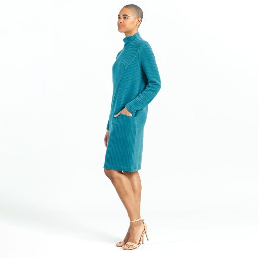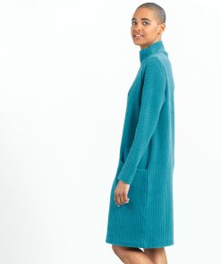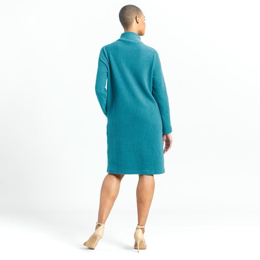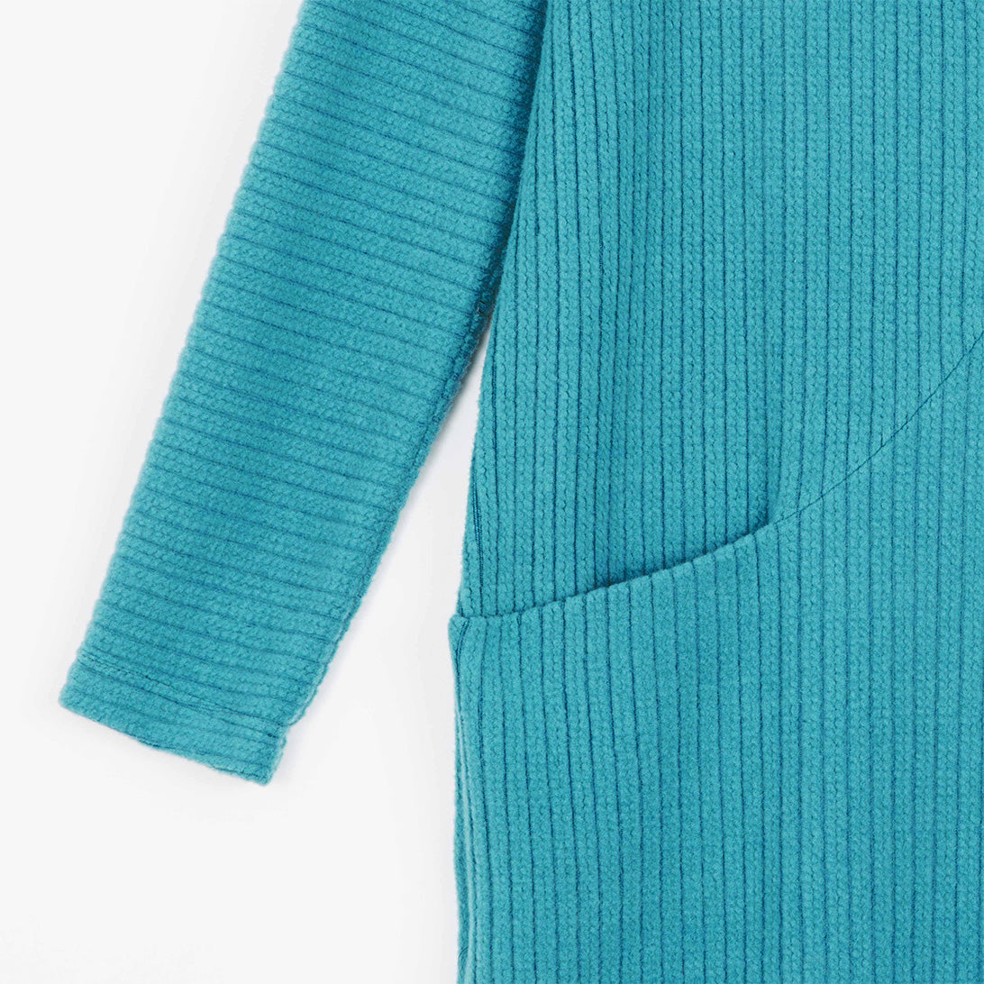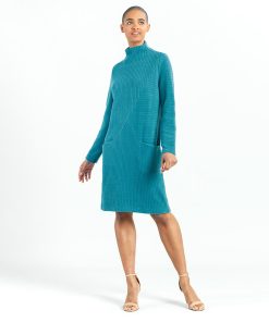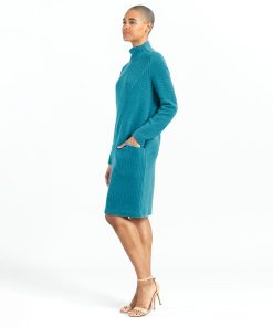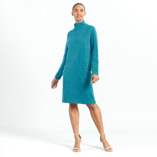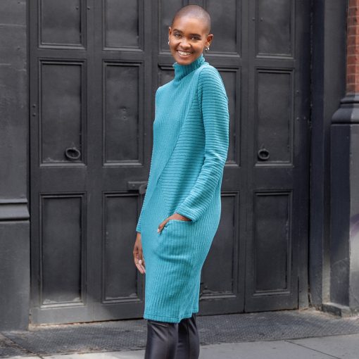 Our Chunky Ribbed Tunic Pocket Sweater Dress is perfect for the woman on the go who doesn’t want to sacrifice style during those cooler months! This sweater dress features a funnel neckline, long sleeves, a diagonal chest-to-bodice princess seam that transitions into standard cross-stitched pockets, and a straight hemline.Our Teal color is a warm, light teal shade with blue-aquamarine undertones.Chunky Cotton-Ribbed Sweater Knit Our Poly-Cotton Blend sweater knit is constructed from a thicker, mid-heavy weight fabric. Its sturdy ribbed texture is meant to provide substantial warmth and a heavy drape, with a chunky structure that retains its shape for long-lasting use. Known to get softer with each wear while maintaining exceptional durability that is easy to care for and travel-friendly!Travel Friendly Chunky Ribbed Texture Thicker, Mid-Heavy Weight Fabric