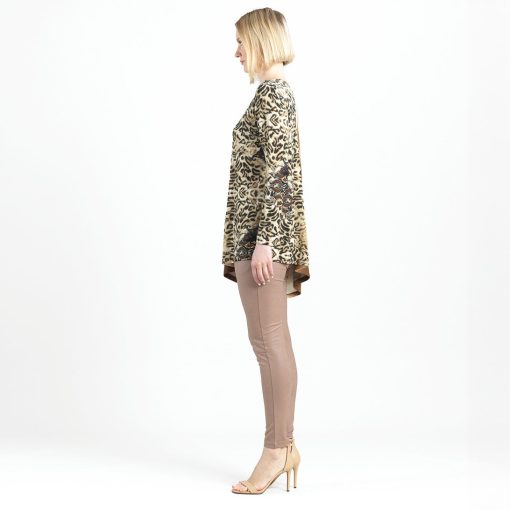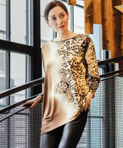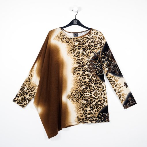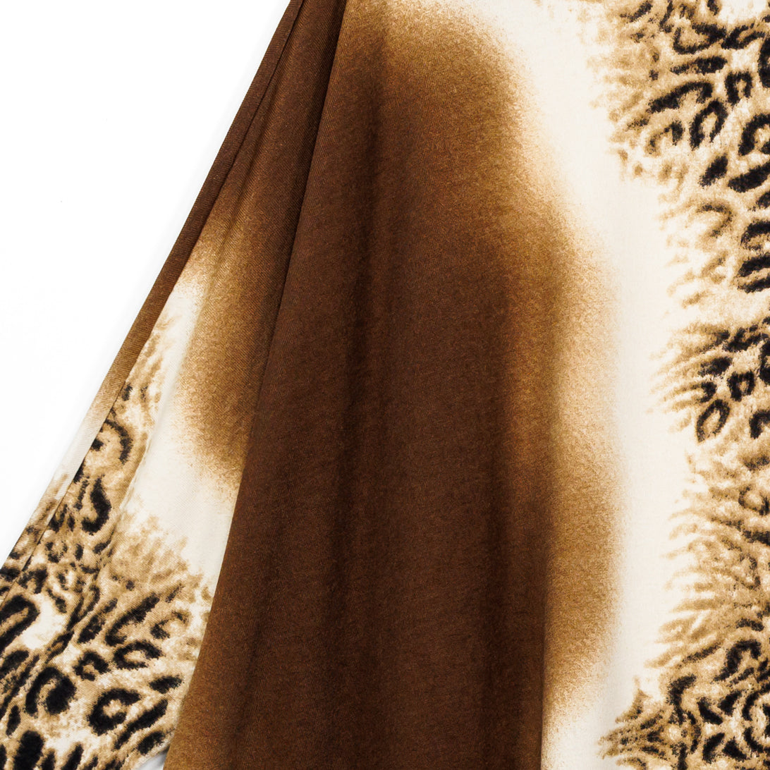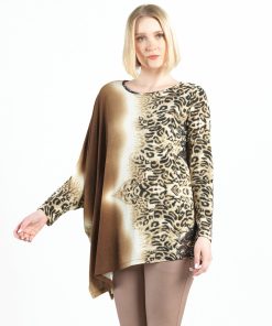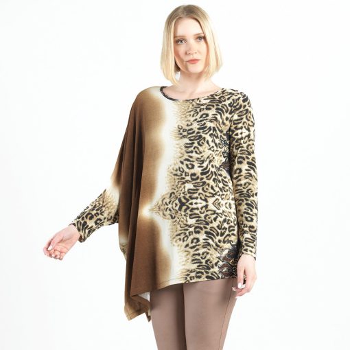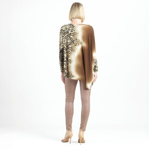 You’re sure to get spotted in our Animal Ombré Cozy Knit Poncho Sleeve Sweater Tunic! This innovative style features a wide, round neckline, and long sleeves which display a left standard sleeve, and a right poncho sleeve that beautifully cascades an ample amount of fabric into a long-vented, draped angle hemline. An ombré print that displays a beautiful cluster of animal spots in shades of cream, ivory, and black, which fade into a gradient against warm shades of tawny and tortilla brown, with subtle hints of paisley shapes, that blend beautifully to create a three-dimensional color story. ♥ Each piece is a unique, one-of-a-kind print and print placement will vary. Cozy Sweater KnitOur cozy sweaters are designed for optimal comfort and convenience. Made from lightweight soft plush knit and Poly-Blend fibers, they are the perfect addition to any wardrobe. Ideal for layering and is travel-friendly but still breathable enough to keep you from getting too warm. Travel Friendly Lightweight Sweater Knit Soft Plushy Texture