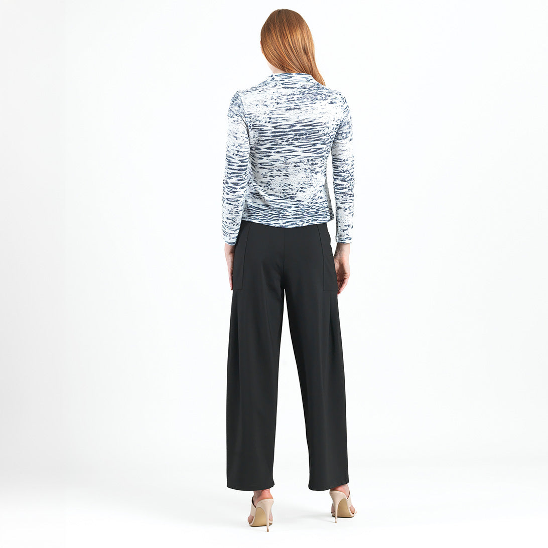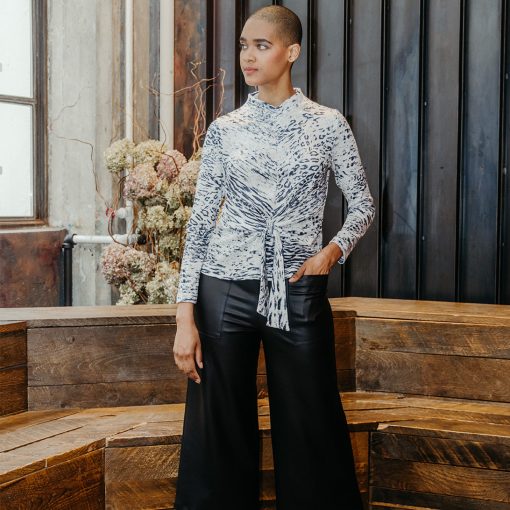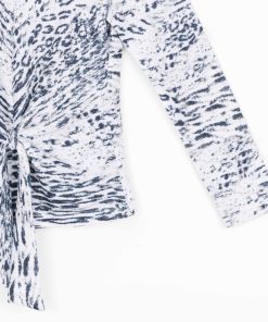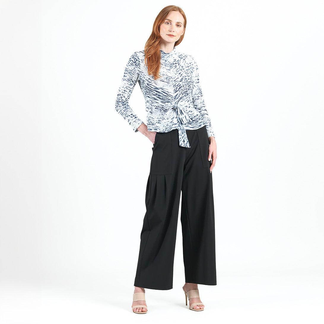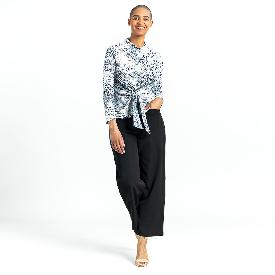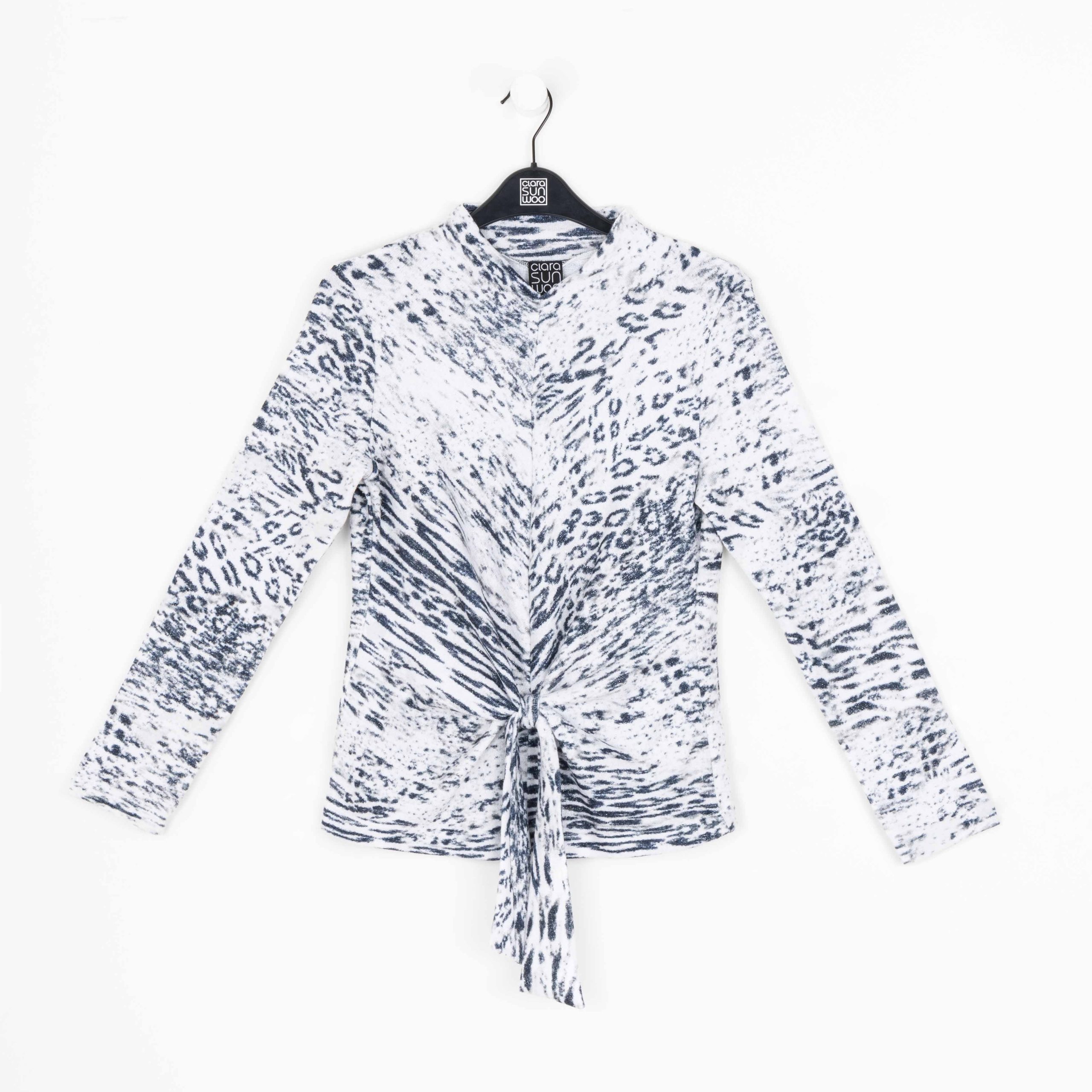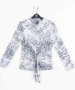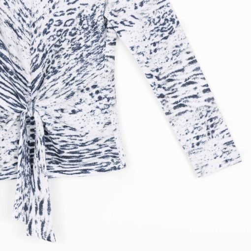 Our Snow Leopard Cozy Shimmer Texture Sweater Center Front Tie Top gives new meaning to the word “spotlight”! This flattering top features a v-bottle neckline, a neck-to-hem seam, long sleeves, and a front-center waist tie that creates a beautiful draped effect that accentuates your natural figure. A medium-scale cluster of leopard spots encompassed by subtle tiger stripes in shades of soft black against a winter white background, with textured silver shimmer specks, woven within the fabric. ♥ Each piece is a unique, one-of-a-kind print and print placement will vary. Lightweight Cozy-Texture Sweater Knit with Shimmer SpecksOur cozy sweaters are designed for optimal comfort and convenience. Made from lightweight soft plush knit and Poly-Blend fibers that feature woven shimmer speck details. Ideal for layering and is travel-friendly but still breathable enough to keep you from getting too warm. Travel Friendly Lightweight Breathable Sweater Knit Delicate Finish Cozy Textured Fibers Woven Shimmer Speck Details