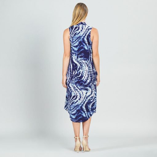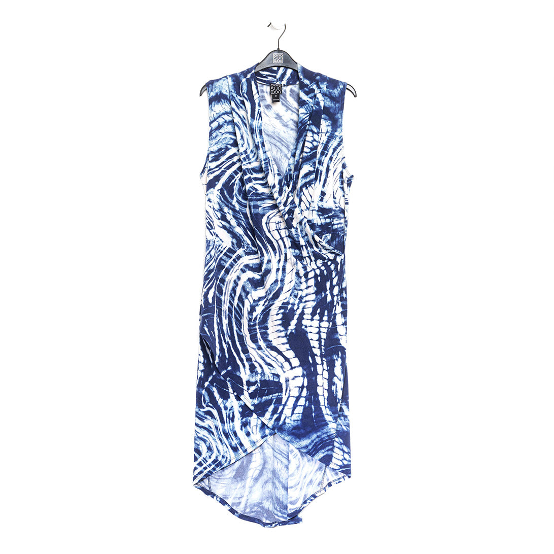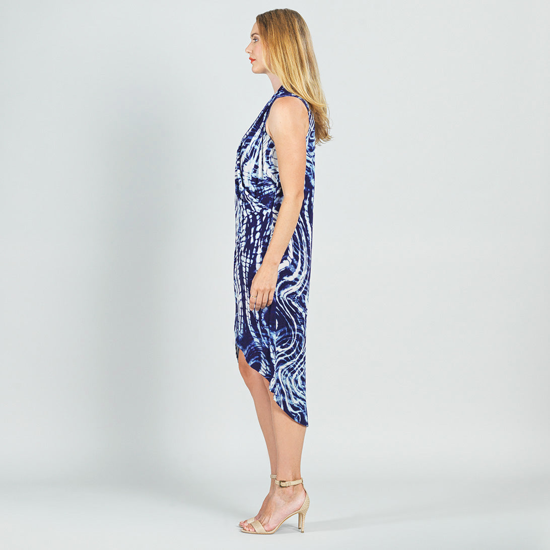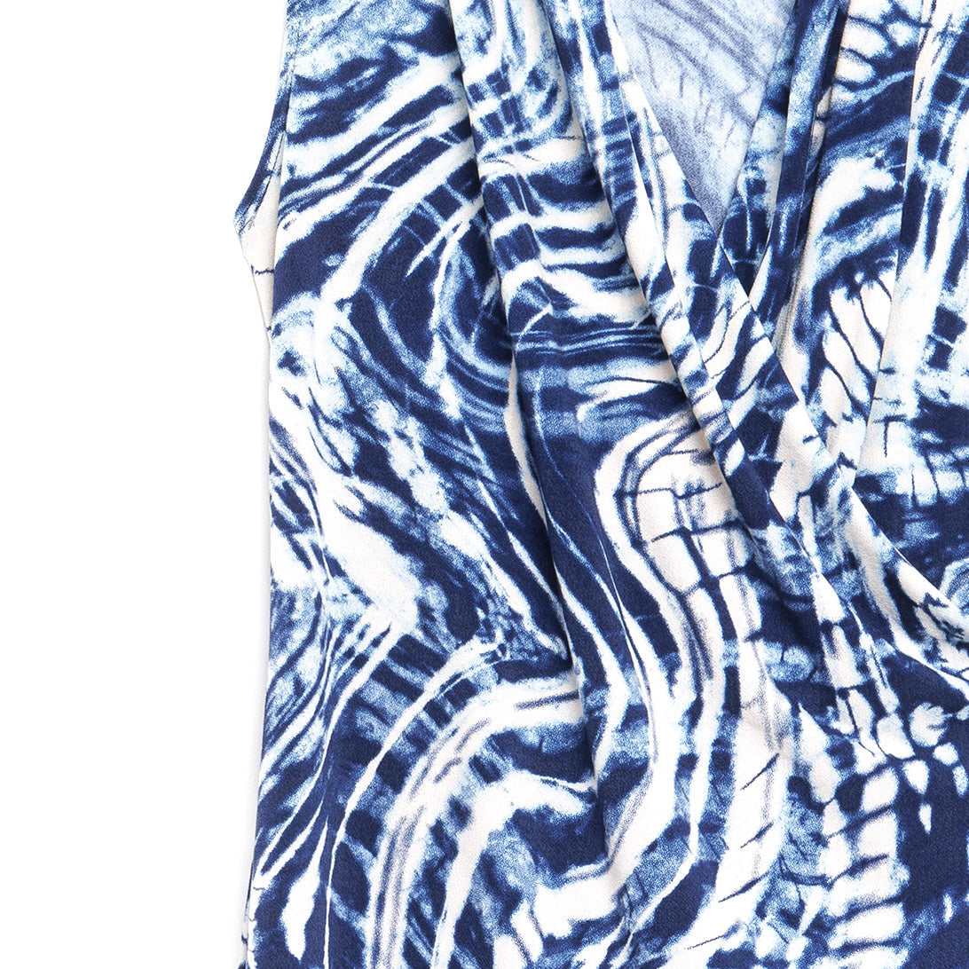 Our Swirl Wave Crepe Knit Crossover Tulip Hem Dress is as stunning as the eye can sea! This sleeveless dress features a crossover surplice neckline that beautifully drapes against the bodice to accentuate your natural contours, and transitions into a softly draped, tulip hemline. A beautiful print of oceanic waves in swirl-like shapes, encompassed by sea foam-like splatters, in shades of navy and soft, off-white, and subtle hints of black. ♥ Each piece is a unique, one-of-a-kind print and print placement will vary. A unique knit, with an airy, open weave texture. Made with a delicate, soft, grainy finish. This fabric is designed to have a sophisticated, 3D-like effect, and is lightweight enough to catch any cool breeze. Textured Crepe Knit Fabric This signature product is crafted from luxurious and comfortable soft stretch poly blend fibers. Its unique textured crepe knit fabric offers excellent breathability and is extremely lightweight in feel.Wrinkle Free Travel Friendly Crepe Textured Knit Fabric Airy, Open Weave Texture