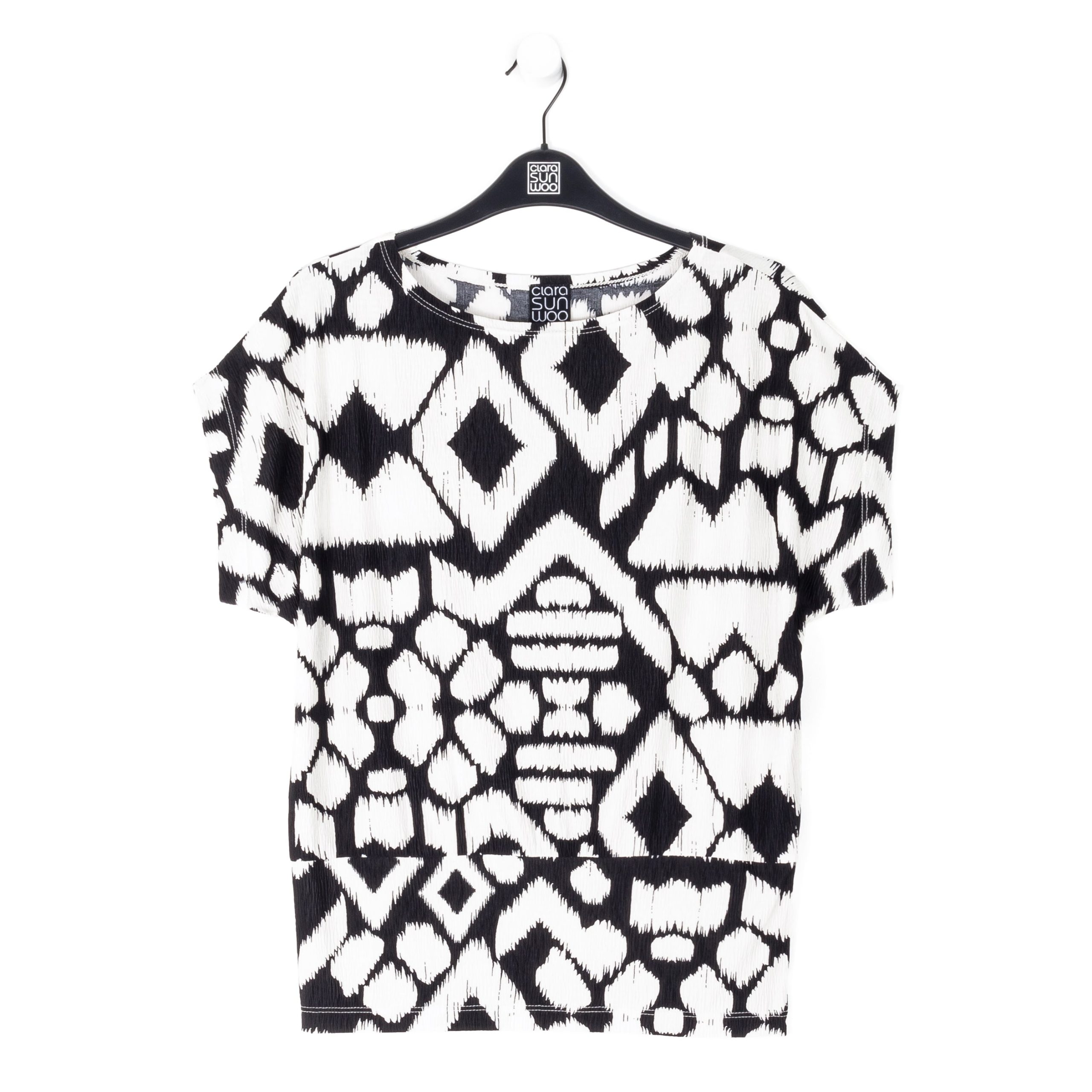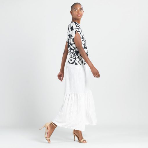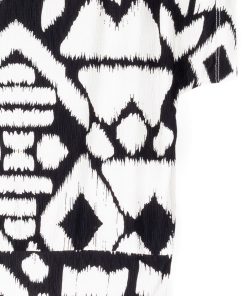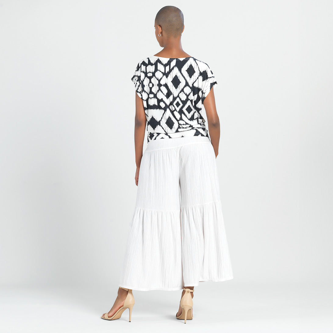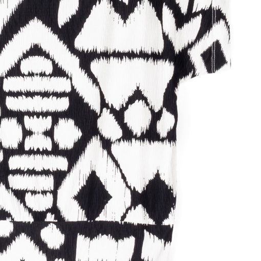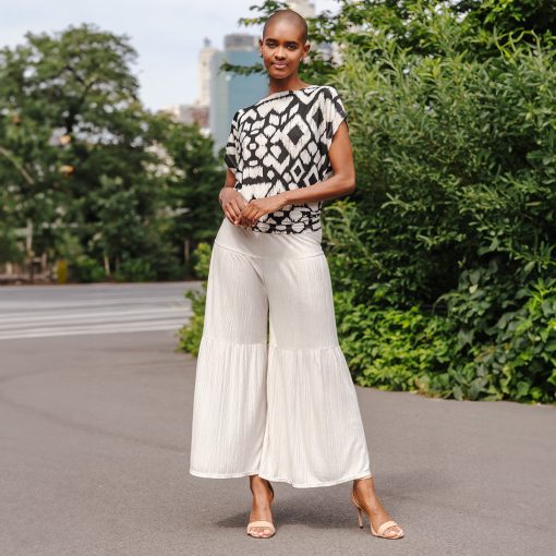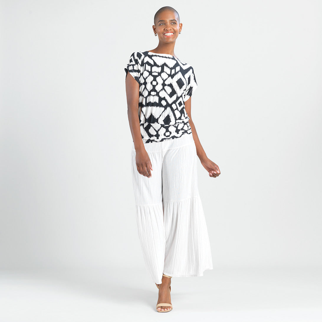 When art and fashion combine, they create our Aztec Crinkle Pleat Dolman Short Sleeve Top! Featuring a wide neckline, short dolman sleeves with a waist-hugging hemline, that displays an elegant blouson silhouette. A graphic, black geometric pattern displayed against a creamy bone background, that resembles an Aztec-like textile which creates a symmetrical formation that is appealing to the eyes. A new, high-quality fabric inspired by crinkle-pleat fibers. Designed with a distinct texture thanks to its lusciously soft ridges. It is durable, retains its shape, and creates a beautiful drape with a luxurious finish, and pleasant breathability.Carefree Travel Fabric – Soft Crinkle Pleat Knit Our signature poly-spandex blend fabric provides a finish that is rich in texture while being soft, providing lightweight stretch and is breathable with quick-drying properties. This delicate fabric offers refined durability with crinkled dimension for visual interest. Perfect for warm or transitional weather, you can pack it up and go with ease!Wrinkle Free Travel Friendly Durable and Lightweight Soft Crinkle-Texture
