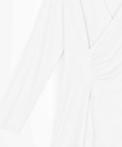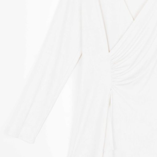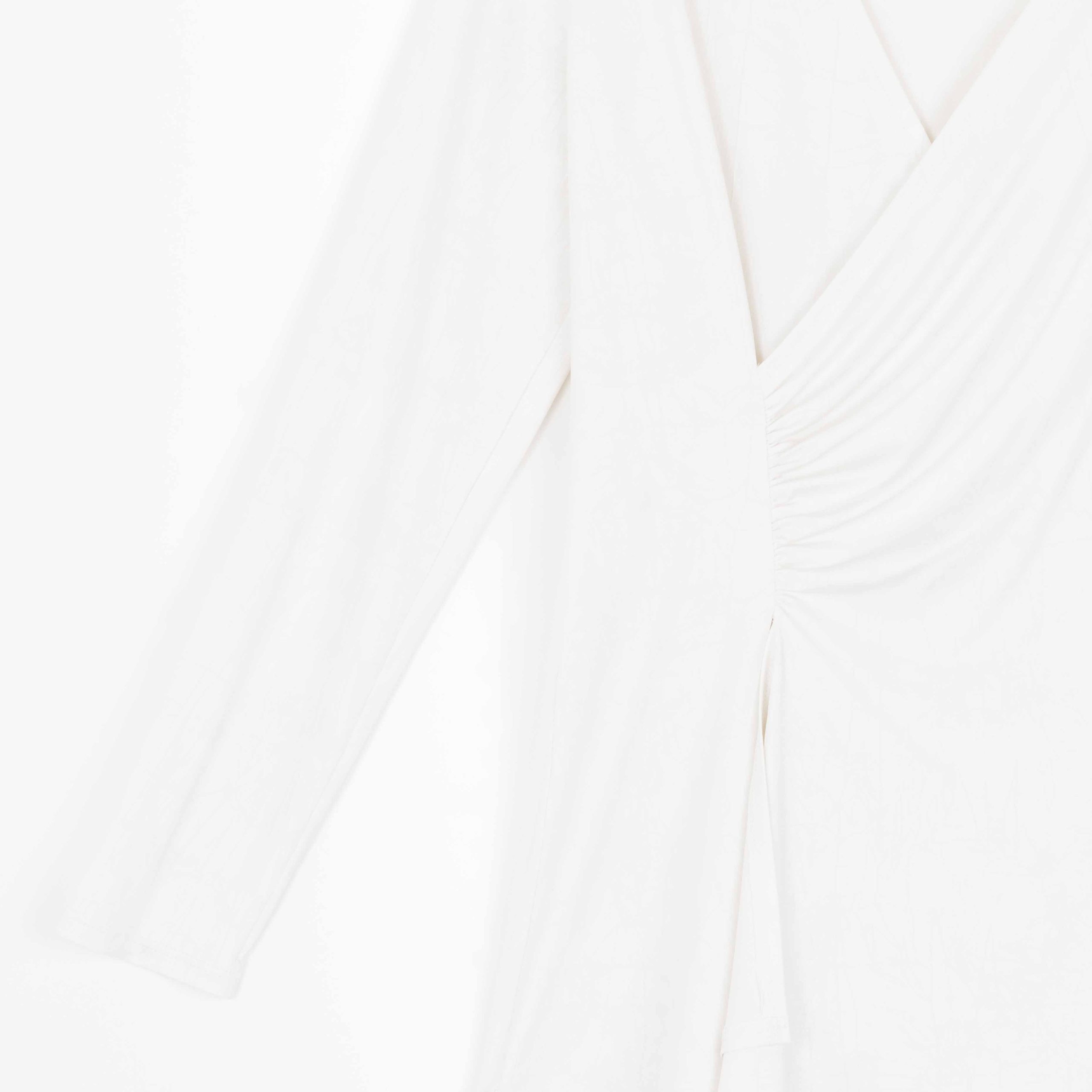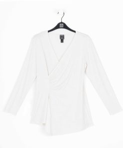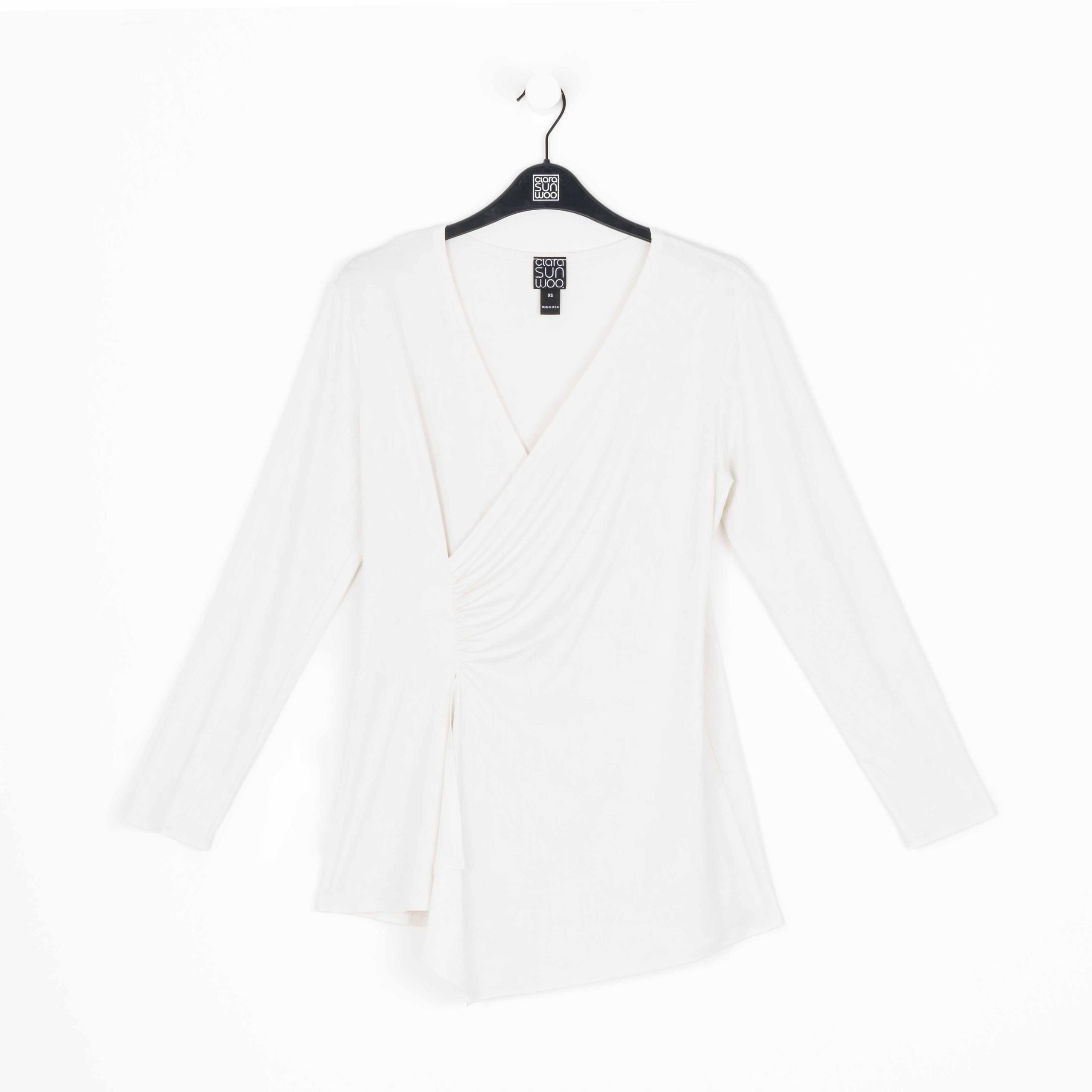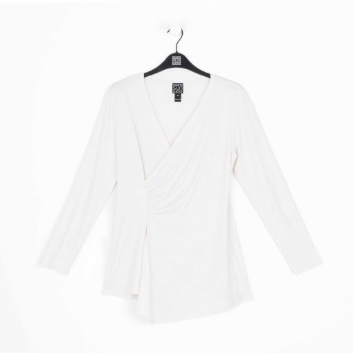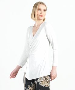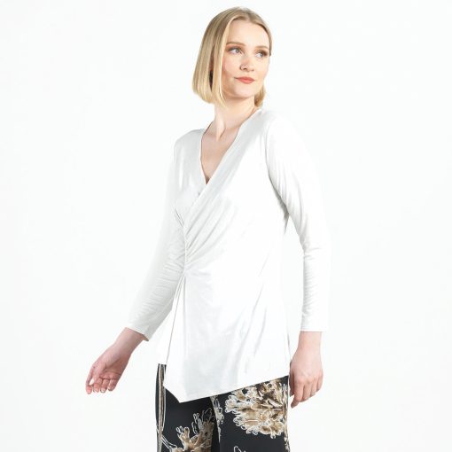 Embrace the queen inside of you with our Crushed Silk Long Sleeve Side Gathered Drape Tunic! This stunning tunic features a surplice neckline, long sleeves, and a side gathered detail seam, which cascades into a beautifully draped angled hemline.Our crushed silk Ivory shade is a pearlescent color with creamy undertones and a sheen finish. A new, luxuriously romantic fabric, inspired by delicate dupioni-silk fibers. Designed with a distinct, soft crushed texture, that gives off a sheen-like radiance, while being cool and smooth to the touch.Carefree Travel Fabric – Crushed-Silk Knit Our signature soft stretch poly blend mimics the texture of crushed silk, providing a lightweight and breathable fabric with easy care and quick-drying properties. This fabric is more breathable and cool to the touch compared to linen and cotton, perfect for warm-weather clothing. Pack it up and go with ease!Wrinkle Free Travel Friendly Ultra Lightweight Soft Knit Fabric Crushed Silky Texture