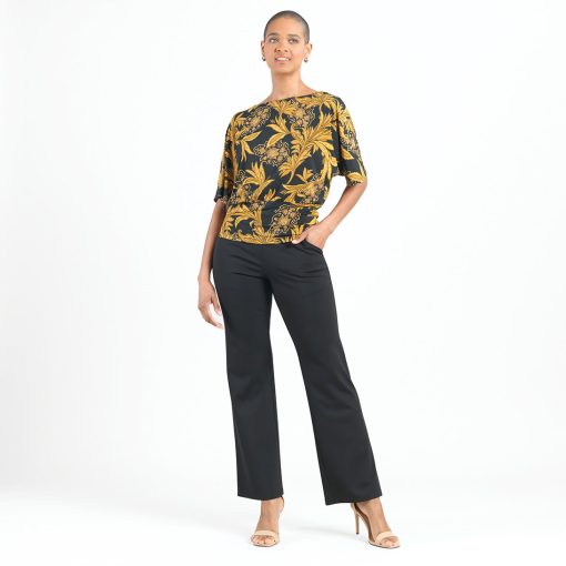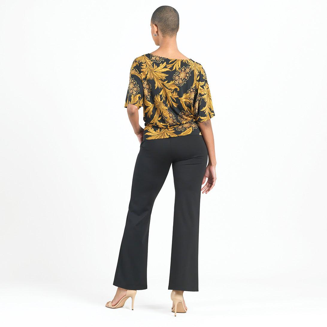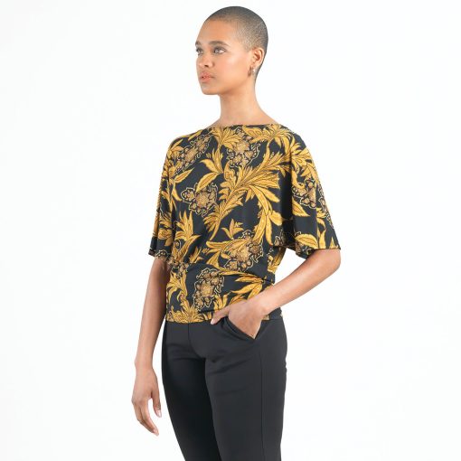 Looking for a luxurious, ornate pattern reminiscent of classical art? Well, look no further than our Baroque Paisley Dolman Half Sleeve Top! Featuring a wide neckline, dolman half sleeves, and a waist-hugging hemline, that displays an elegant blouson silhouette. An opulent print that features intricate baroque motifs intertwined by dynamic paisley shapes in rich shades of gold and black, which evoke a sense of regal sophistication. ♥ Each piece is a unique, one-of-a-kind print and print placement will vary.Carefree Travel Fabric – Soft Silky Knit Our signature poly blend fibers offer luxurious softness with lightweight, wrinkle-free comfort. This easy-care fabric is quick drying and cooler than linen or cotton, making it perfect for on-the-go wear.Wrinkle Free Travel Friendly Ultra Lightweight Soft Knit Fabric Breathable Jersey-Like Feel