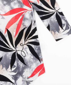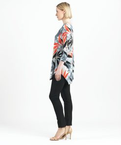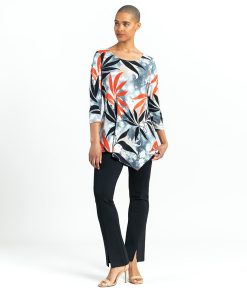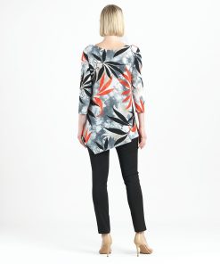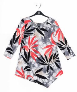 Add our Leaf Scatter Kerchief Angle Hem Tunic to your closet and watch your wardrobe bloom with style! This tunic features a scoop neckline, 3/4 length sleeves, and a kerchief-angled hemline that creates a modern, asymmetrical silhouette. A take-notice print, in bold leaf shapes of black and coral-red, encompassed by shades of beige-taupe and white, underlaid by a cool-grey cloud print effect with subtle hints of pale pink. ♥ Each piece is a unique, one-of-a-kind print and print placement will vary, Carefree Travel Fabric – Soft Silky Knit Our signature poly blend fibers offer luxurious softness with lightweight, wrinkle-free comfort. This easy-care fabric is quick drying and cooler than linen or cotton, making it perfect for on-the-go wear.Wrinkle Free Travel Friendly Ultra Lightweight Soft Knit Fabric Breathable Jersey-Like Feel
