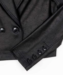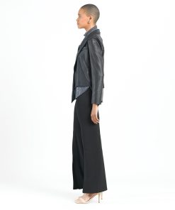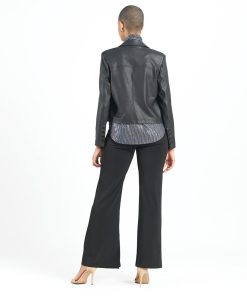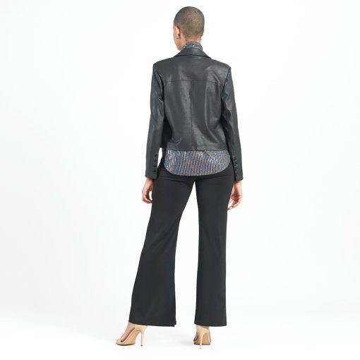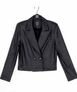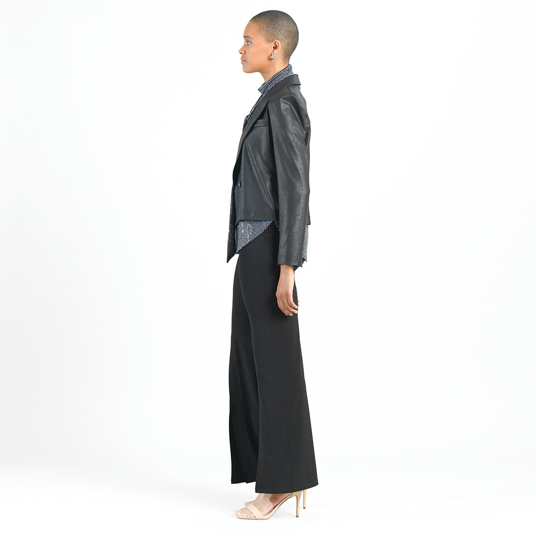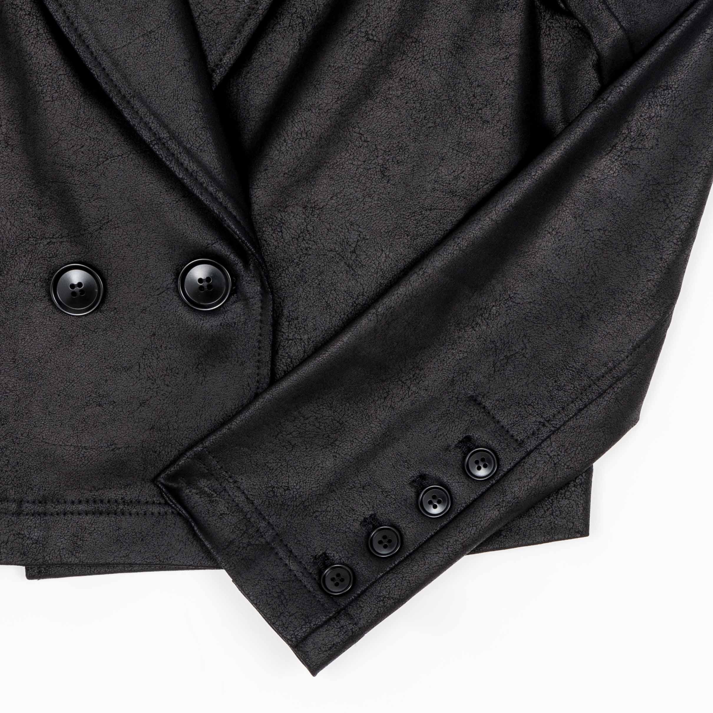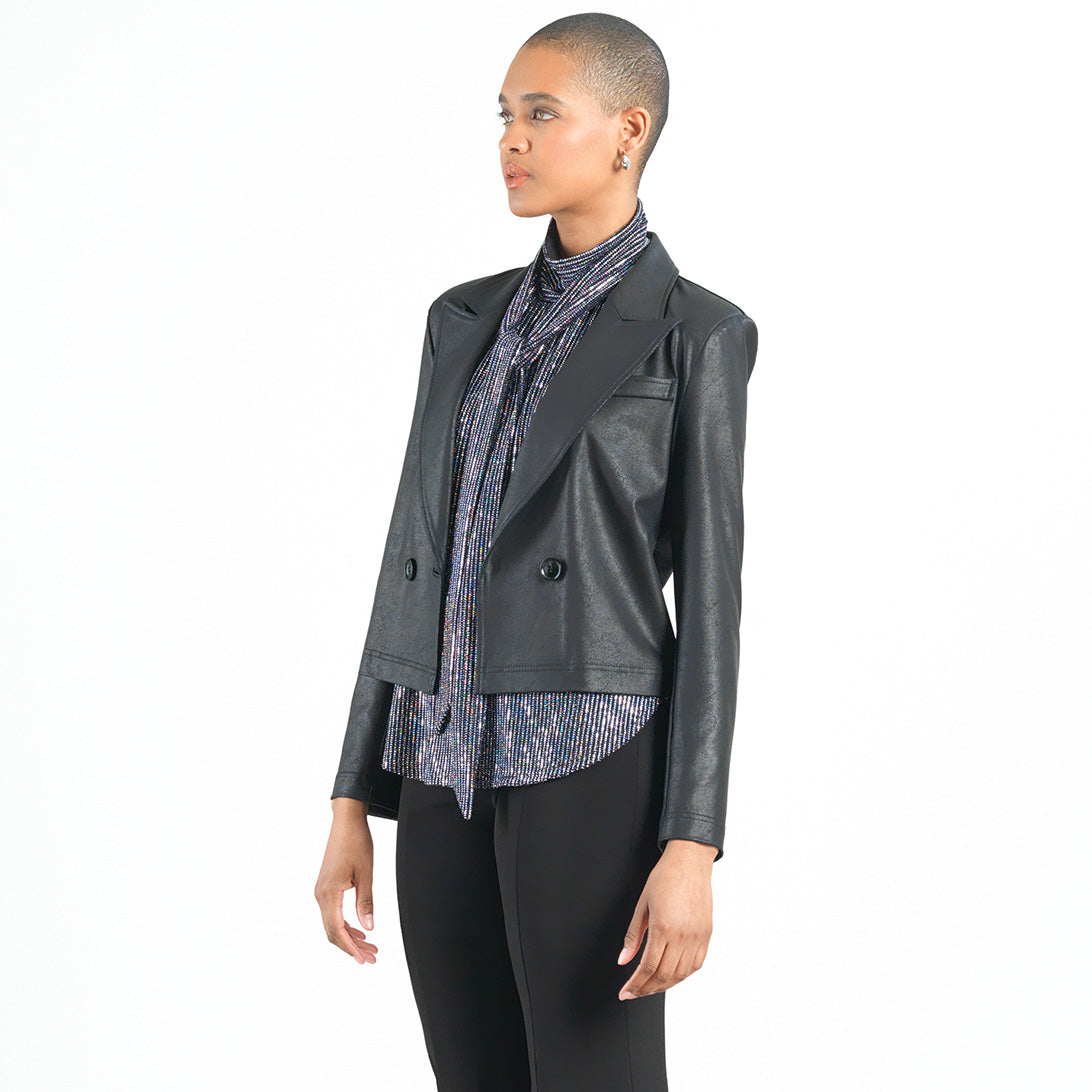 Feel a sense of empowerment and confidence in our Liquid Leather Cropped Tuxedo Blazer! Made from our beautiful signature stretch knit, extremely lightweight soft “lambskin feel” fabric with an antique-like textured matte finish. This blazer features a fold-over collar with a peak lapel, a single button closure with duo-button details, a left faux pocket square, inner shoulder pads, long sleeves with a 4-button cuff closure, with back yoke and vertical center back seam details. Designer Style Tip: we suggest wearing this cropped blazer unbuttoned to showcase its unique shape. The interior is made from soft knit giving it the right amount of stretch with superb breathable wear that conforms to your body and provides you with a figure-flattering silhouette, best of all it’s vegan-friendly!Liquid Leather Knit This vegan-friendly fabric offers superior comfort and style. Crafted from our signature flexible polyester blend and coated in a faux leather-like matte finish, it’s cool to the touch, quick-drying, and easy to maintain. Enjoy the look and feel of leather without the guilt.Travel Friendly Ultra Lightweight Soft Knit Fabric – Faux Leather Matte Finish Vegan Friendly!