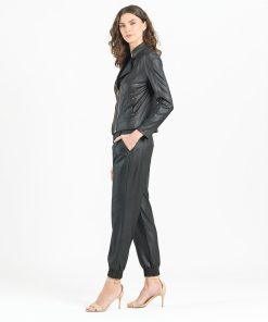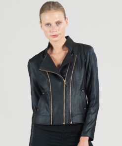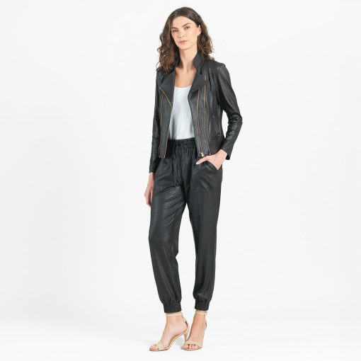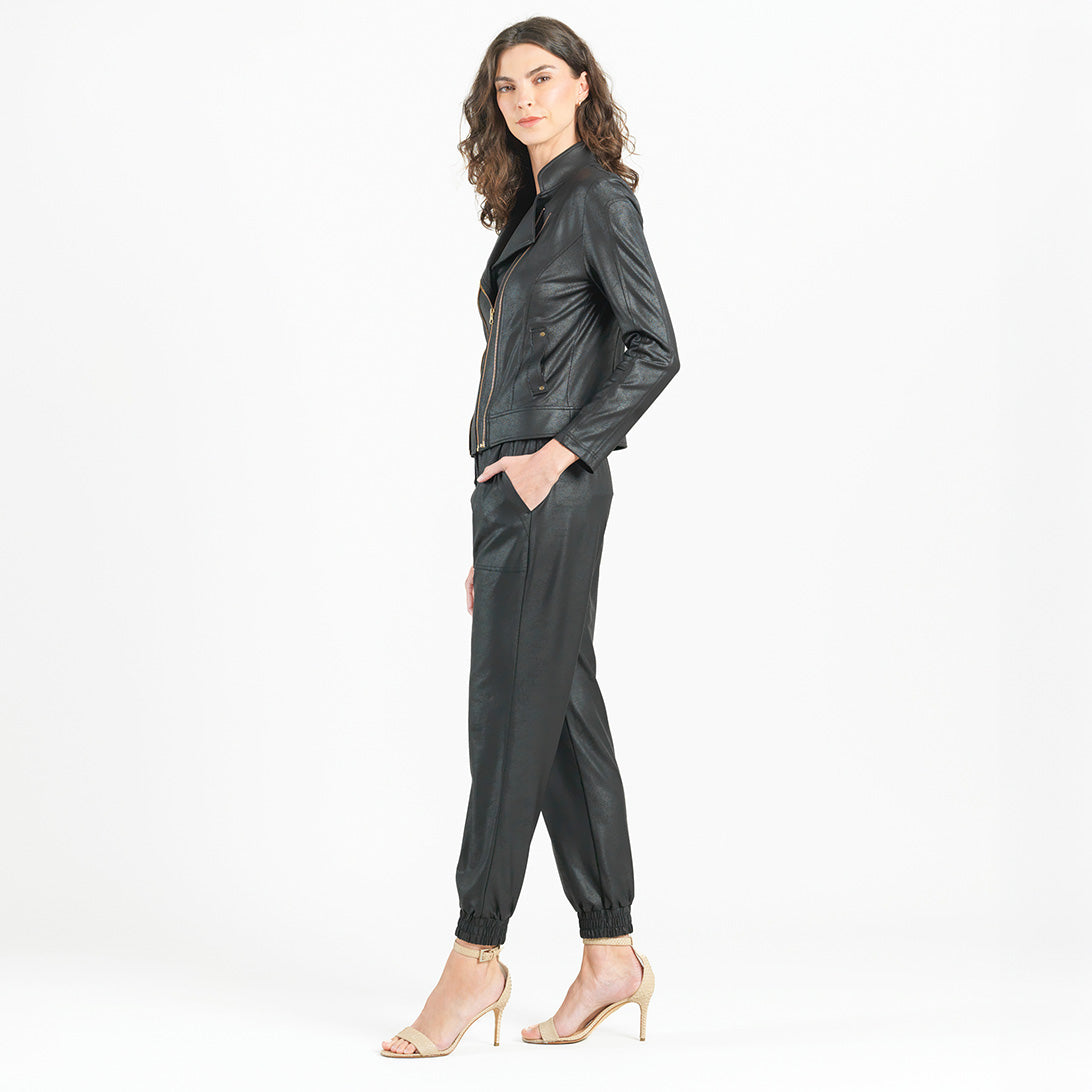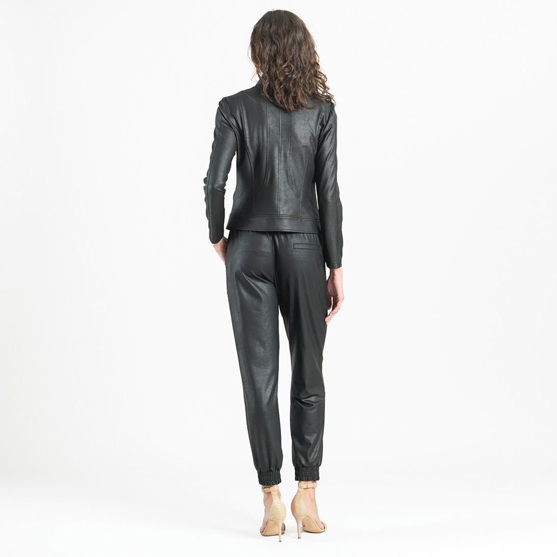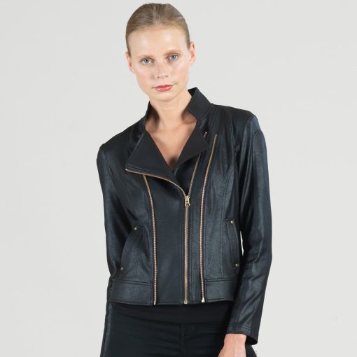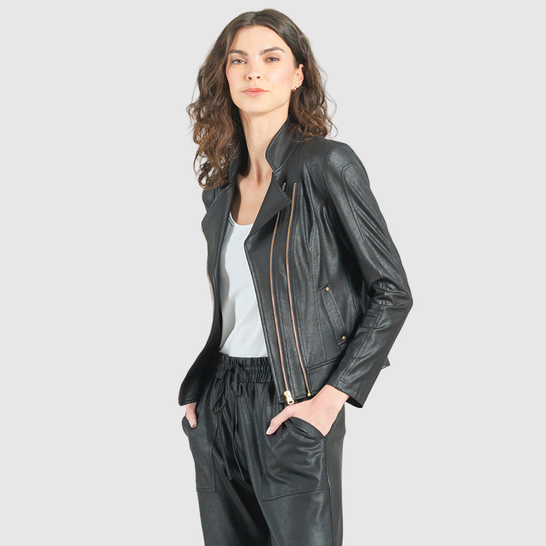 Up your fashion game in our Liquid Leather Double Zip Pocket Jacket! Featuring a notched lapel with upright collar, a rustic gold vertical zip closure with a double zipper detail allowing for a customized silhouette, long sleeves, side pockets with snap details, and beautiful pipe stitching throughout the jacket. Made from our beautiful signature stretch knit, extremely lightweight soft “lambskin feel” fabric with a soft matte finish. The interior is made from soft knit giving it the right amount of stretch and providing you with breathable superb wear and best of all it’s vegan friendly! Clara Sunwoo | Favorite Things from CS on Vimeo. #CLARASUNWOO INFLUENCERSLiquid Leather KnitThis vegan-friendly fabric offers superior comfort and style. Crafted from our signature flexible polyester blend and coated in a faux leather-like matte finish, it’s cool to the touch, quick-drying, and easy to maintain. Enjoy the look and feel of leather without the guilt.Travel Friendly Ultra Lightweight Soft Knit Fabric – Faux Leather Matte Finish Double Zip Detail Vegan Friendly!