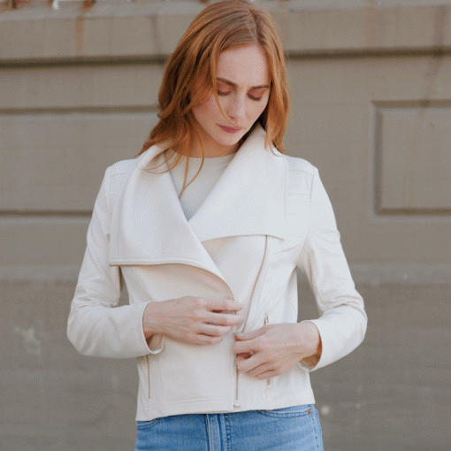 Transform your look with a single zip in our Liquid Leather Drape Neck Zip Jacket! This innovative, soft-matte finish jacket features detailed stitching that contours the shape, long sleeves, vertical-center back seam with a back yoke, gold side zip-pocket closures, and a unique asymmetrical zip-closure that extends to the top of the neck, allowing you to transform the silhouette to a high neck, classic fold-over collar, or draped open collar. Our Ivory shade is a pearlescent ivory color with beige-eggshell undertones. Inspired by the dynamic needs of women on the go, our designers created this jacket for those who require versatile and adaptable clothing. Coated with extremely lightweight, vegan-friendly leather and an interior that is made from soft knit giving it the right amount of stretch with breathable superb wear that conforms to your body and provides you with the utmost comfort. Clara Sunwoo | Favorite Things from CS on Vimeo.Liquid Leather KnitThis vegan-friendly fabric offers superior comfort and style. Crafted from our signature flexible polyester blend and coated in a faux leather-like matte finish, it’s cool to the touch, quick-drying, and easy to maintain. Enjoy the look and feel of leather without the guilt.Travel Friendly Ultra Lightweight Soft Knit Fabric – Faux Leather Matte Finish Vegan Friendly!