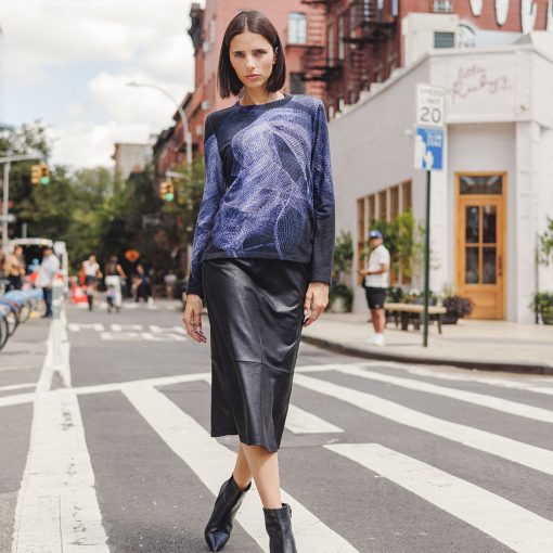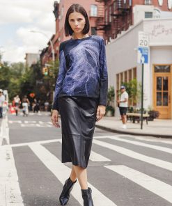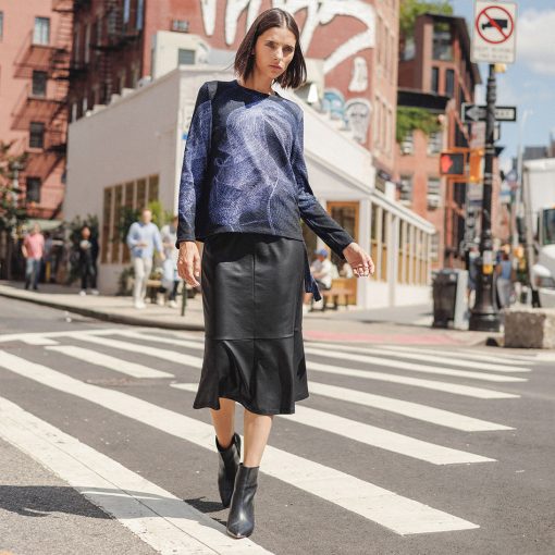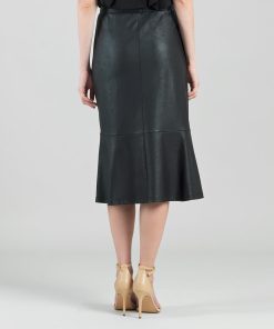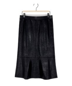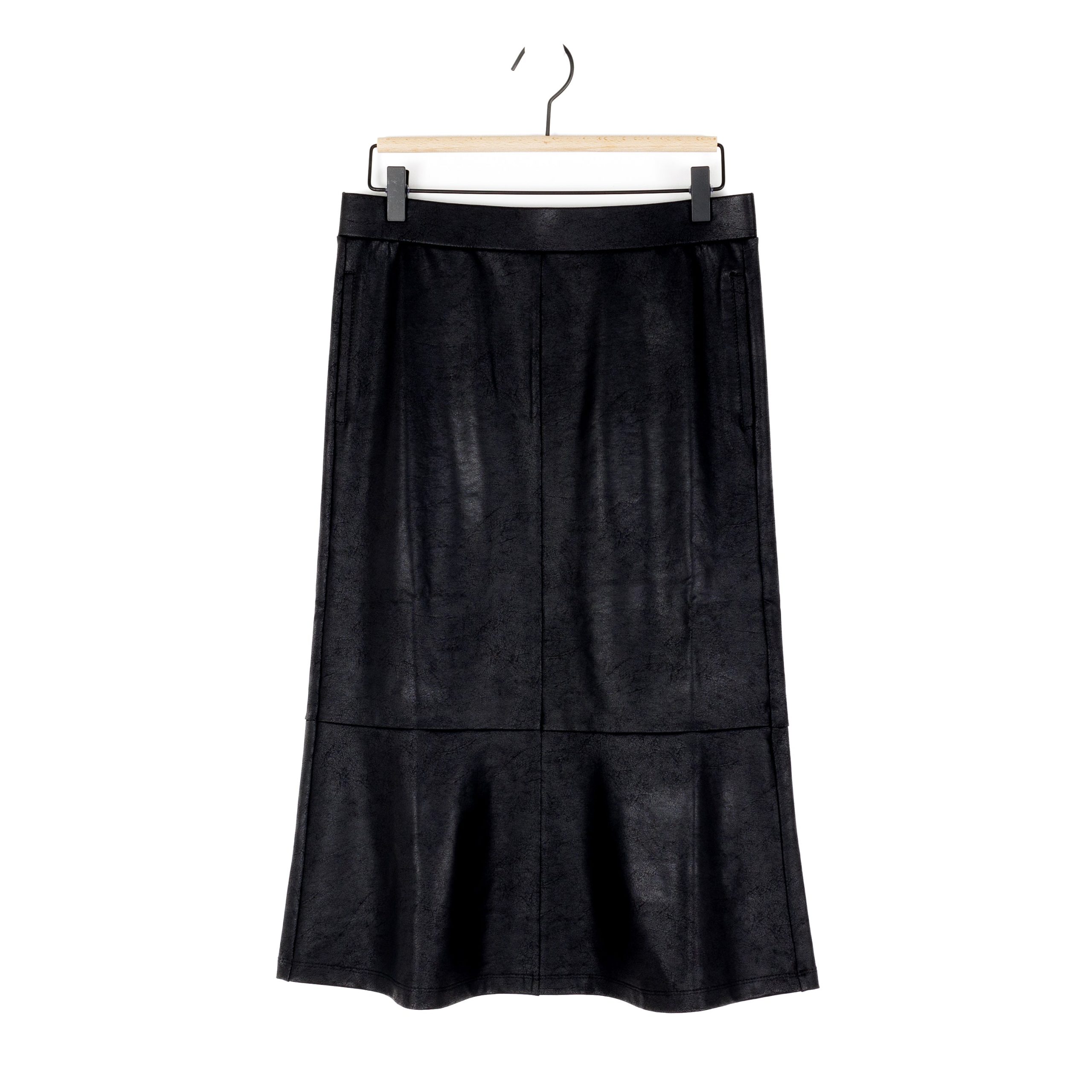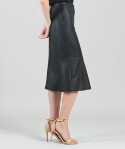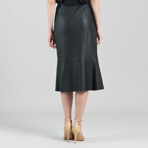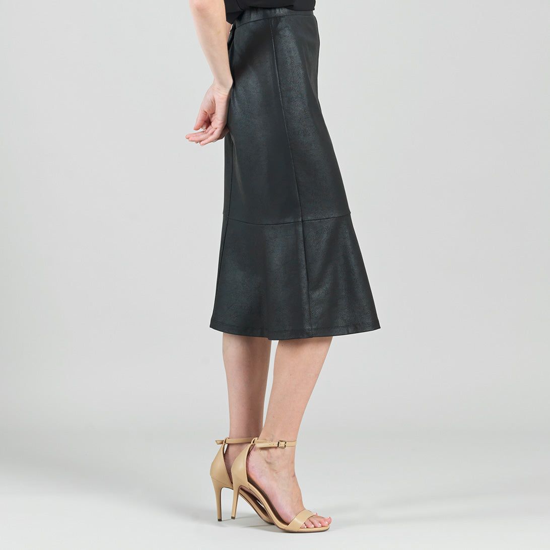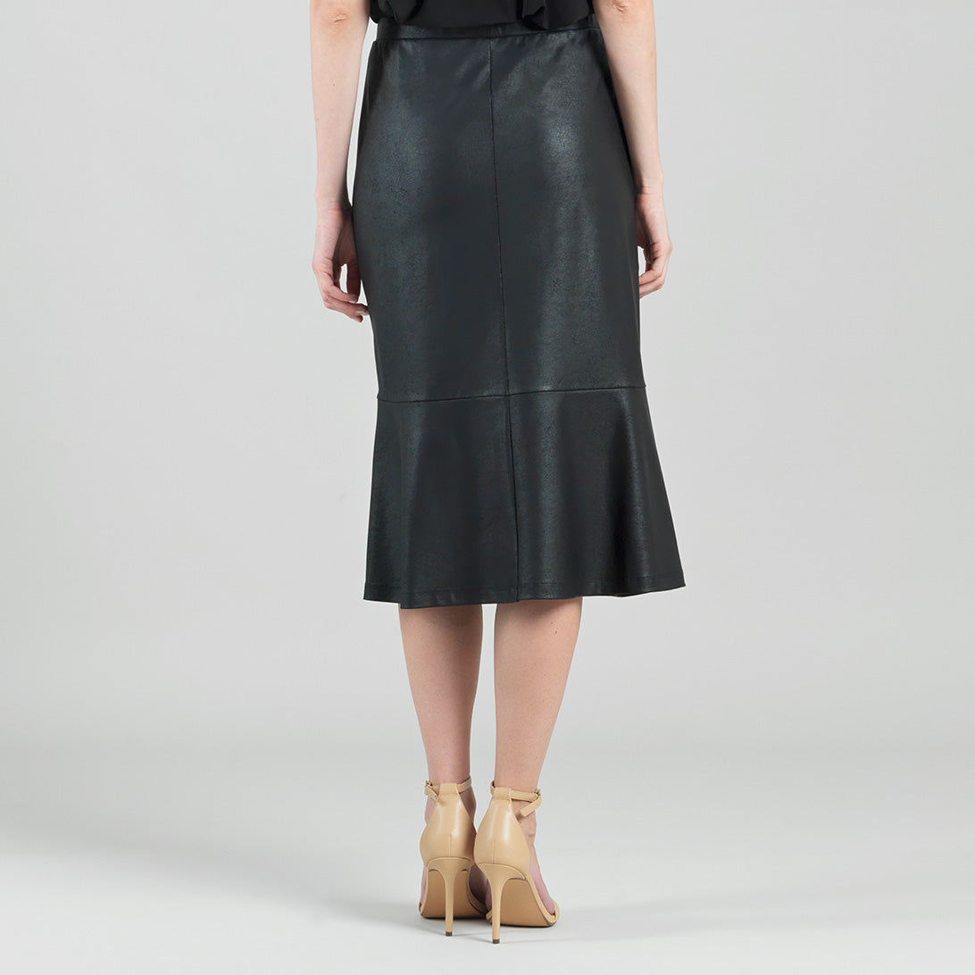 Put some fashion bounce in your step with our Liquid Leather Flounce Midi Skirt! This charming skirt features our beautiful, signature soft-matte finish, a 1.5” pull-on elastic waistband, a vertical center front and back seam, and a horizontal mid-way seam that displays a feminine flounce hemline. Liquid Leather KnitThis vegan-friendly fabric offers superior comfort and style. Crafted from our signature flexible polyester blend and coated in a faux leather-like matte finish, it’s cool to the touch, quick-drying, and easy to maintain. Enjoy the look and feel of leather without the guilt. 1.5″ Pull-On Elastic Waistband Travel Friendly Ultra Lightweight Soft Knit Fabric – Faux Leather Matte FinishVegan Friendly!