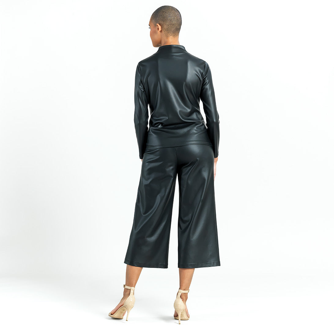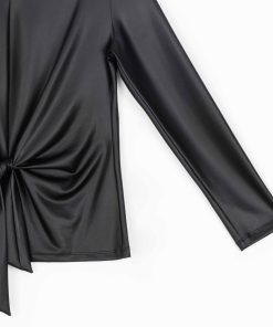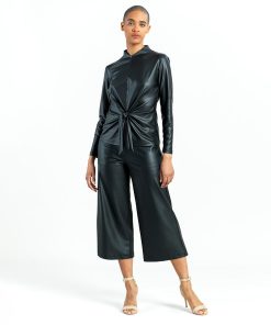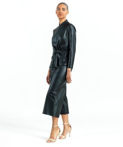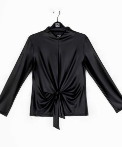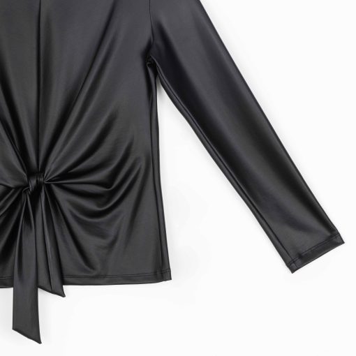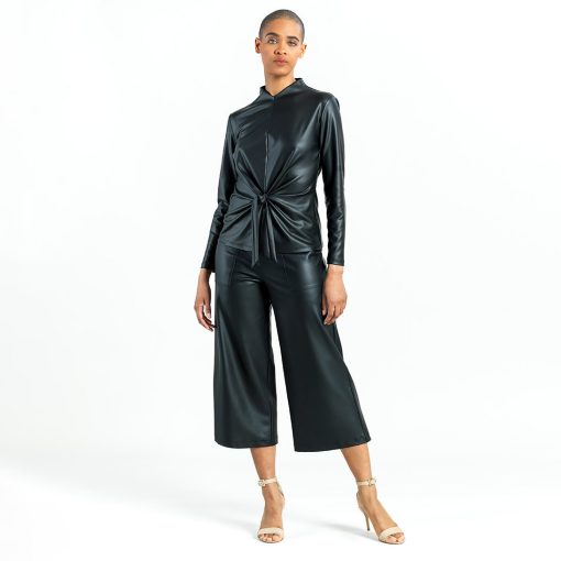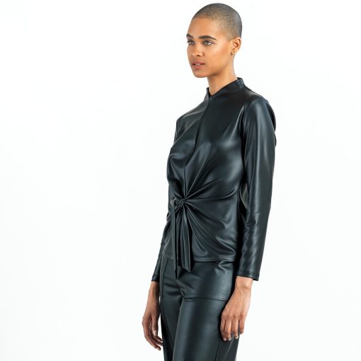 Our Liquid Leather Sheen Center Front Tie Top is in a class of its own! With a flattering shape and modernized edge, this top features a v-bottle neckline, a beautiful soft-sheen finish, a neck-to-hem seam, long sleeves, and a front-center waist tie that creates a beautiful draped effect that accentuates your natural figure.Liquid Leather KnitThis vegan-friendly fabric offers superior comfort and style. Crafted from our signature flexible polyester blend and coated in a faux leather-like soft sheen finish, it’s cool to the touch, quick-drying, and easy to maintain. Enjoy the look and feel of leather without the guilt. Ultra Lightweight Soft Knit Fabric – Faux Leather Soft-Sheen Finish Vegan Friendly!
