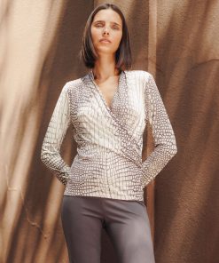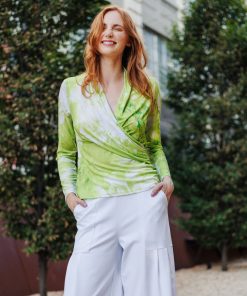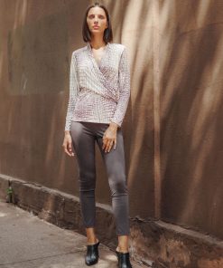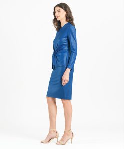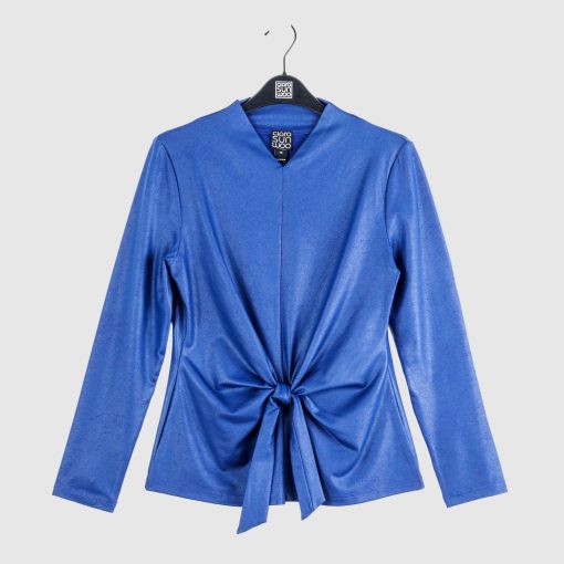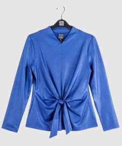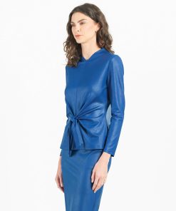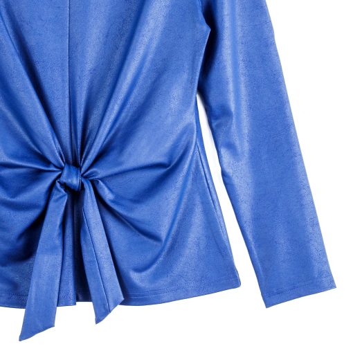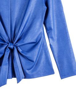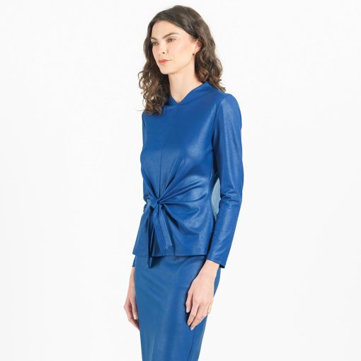 Our Liquid Leather Signature Center Front Tie Top is in a class of its own! With a flattering shape and modernized edge, this top features a v-bottle neckline, a beautiful signature soft-matte finish, a neck-to-hem seam, long sleeves, and a front-center waist tie that creates a beautiful draped effect that accentuates your natural figure. Our Cobalt shade is a true royal blue color with deep vivid undertones.Liquid Leather KnitThis vegan-friendly fabric offers superior comfort and style. Crafted from our signature flexible polyester blend and coated in a faux leather-like matte finish, it’s cool to the touch, quick-drying, and easy to maintain. Enjoy the look and feel of leather without the guilt. Ultra Lightweight Soft Knit Fabric – Faux LeatherMatte FinishVegan Friendly!