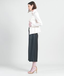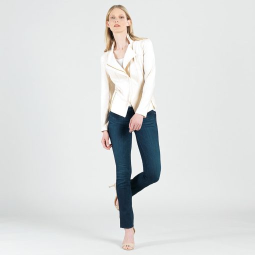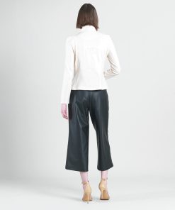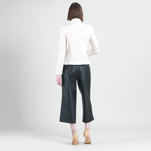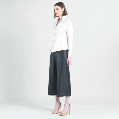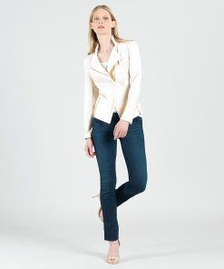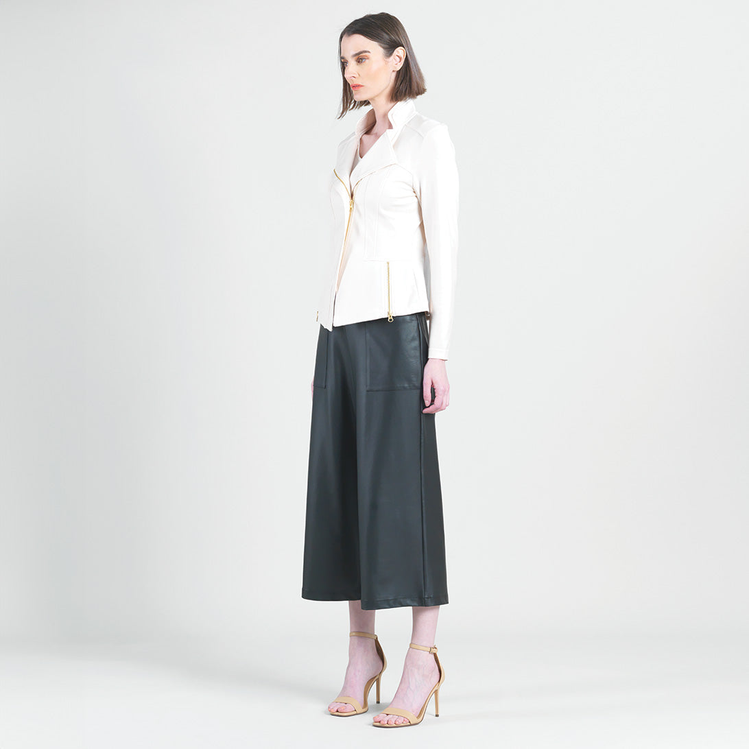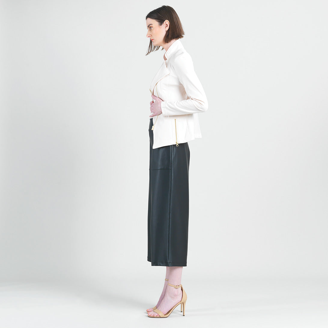 Your browser does not support our video.Know your worth and exude modern sophistication wearing our Liquid Leather Signature Jacket! Made from our beautiful signature stretch knit, extremely lightweight soft “lambskin feel” fabric with a soft matte finish. This jacket features a notched lapel with upright collar, long sleeves, gold a-symmetrical zip closure, faux pocket zipper slits as well as complimentary detailed front and backstitching. Our Ivory shade is a pearlescent ivory color with beige-eggshell undertones. The interior is made from soft knit giving it the right amount of stretch with breathable superb wear that conforms to your body and provides you with a figure-flattering silhouette and best of all it’s vegan friendly! For a casual look, pair this stunning jacket with your favorite pair of blue jeans! Clara Sunwoo | Favorite Things from CS on Vimeo.Liquid Leather KnitThis vegan-friendly fabric offers superior comfort and style. Crafted from our signature flexible polyester blend and coated in a faux leather-like matte finish, it’s cool to the touch, quick-drying, and easy to maintain. Enjoy the look and feel of leather without the guilt.Travel Friendly Ultra Lightweight Soft Knit Fabric – Faux Leather Smooth Matte Finish Vegan Friendly!