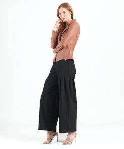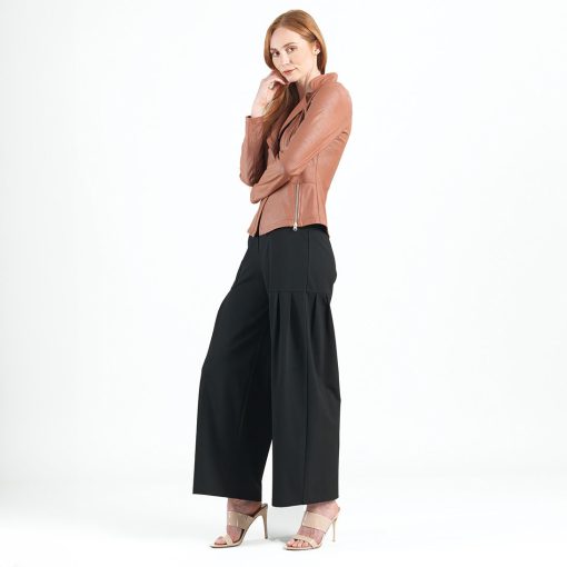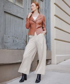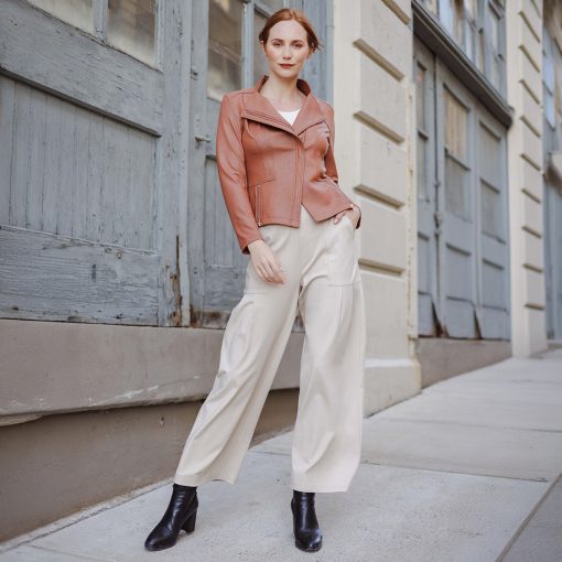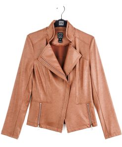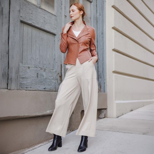 Spice up your wardrobe with a touch of earthy elegance in our Liquid Leather Signature Jacket! Made from our beautiful signature stretch knit, extremely lightweight soft “lambskin feel” fabric with a soft matte finish. This jacket features a notched lapel with upright collar, long sleeves, silver asymmetrical zip closure, faux pocket zipper slits as well as complimentary detailed front and back stitching. Our Tan shade is a true terracotta color with sienna brown-orange undertones. The interior is made from soft knit giving it the right amount of stretch with breathable superb wear that conforms to your body and provides you with a figure-flattering silhouette and best of all it’s vegan friendly!Clara Sunwoo | Favorite Things 2021 from CS on Vimeo.Liquid Leather KnitThis vegan-friendly fabric offers superior comfort and style. Crafted from our signature flexible polyester blend and coated in a faux leather-like matte finish, it’s cool to the touch, quick-drying, and easy to maintain. Enjoy the look and feel of leather without the guilt.Travel Friendly Ultra Lightweight Soft Knit Fabric – Faux Leather Matte Finish Vegan Friendly!