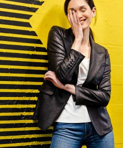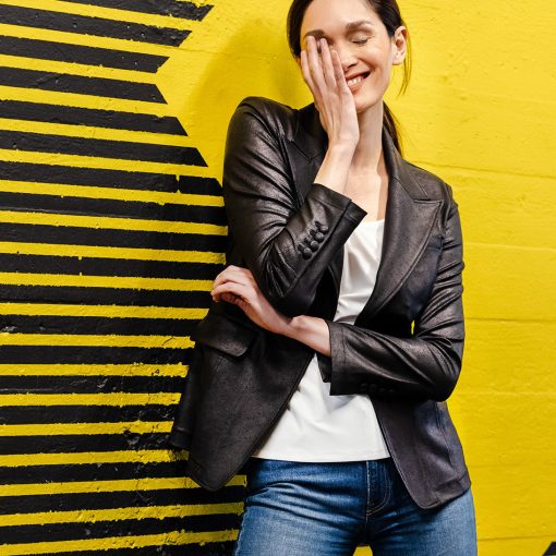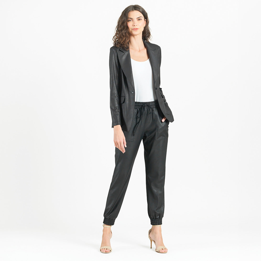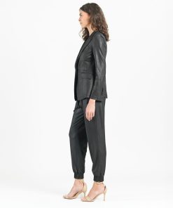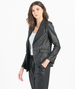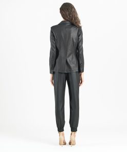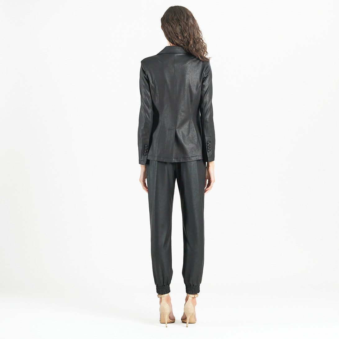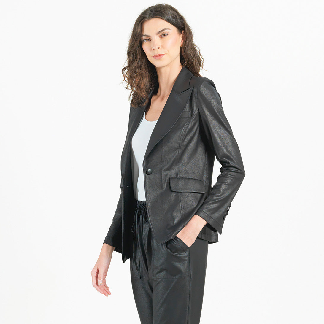 Blaze your own fashion trail in our Liquid Leather Signature Pocket Blazer, which is tailored to perfection! Made from our beautiful signature stretch knit, extremely lightweight soft “lambskin feel” fabric with an antique-like textured matte finish. This blazer features a fold-over collar with a peak lapel, inner shoulder pads, long sleeves with 4-button cuff detail, single button closure, two standard front pockets, one mini chest pocket, and a center back seam with a vented hemline. The interior is made from soft knit giving it the right amount of stretch with breathable superb wear that conforms to your body and provides you with a figure-flattering silhouette and best of all it’s vegan-friendly! Liquid Leather KnitThis vegan-friendly fabric offers superior comfort and style. Crafted from our signature flexible polyester blend and coated in a faux leather-like matte finish, it’s cool to the touch, quick-drying, and easy to maintain. Enjoy the look and feel of leather without the guilt.Travel Friendly Ultra Lightweight Soft Knit Fabric – Faux Leather Matte Finish Vegan Friendly!