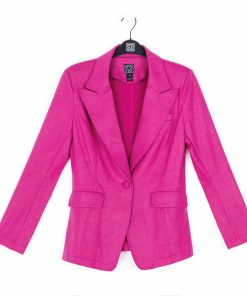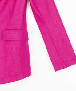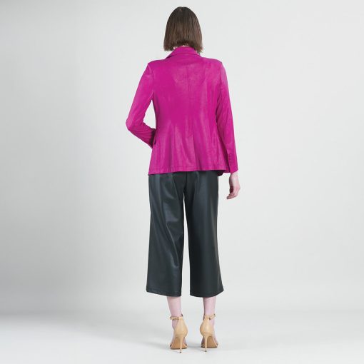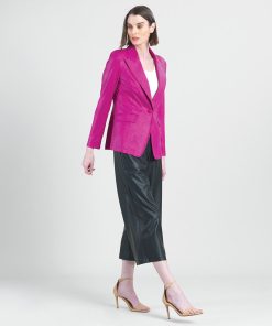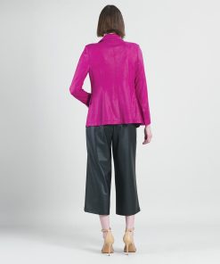Blaze your own fashion trail in our Liquid Leather Signature Pocket Blazer, which is tailored to perfection! Made from our beautiful signature stretch knit, extremely lightweight soft “lambskin feel” fabric with an antique-like textured matte finish. This blazer features a fold-over collar with a peak lapel, inner shoulder pads, long sleeves with 4-button cuff detail, single button closure, two standard front pockets, one mini chest pocket, and a center back seam with a vented hemline. Our Magenta color is a warm, vibrant, mid-tone pink shade with plum undertones. The interior is made from soft knit giving it the right amount of stretch with breathable superb wear that conforms to your body and provides you with a figure-flattering silhouette and best of all it’s vegan-friendly!Liquid Leather Knit This vegan-friendly fabric offers superior comfort and style. Crafted from our signature flexible polyester blend and coated in a faux leather-like matte finish, it’s cool to the touch, quick-drying, and easy to maintain. Enjoy the look and feel of leather without the guilt.Travel Friendly Ultra Lightweight Soft Knit Fabric – Faux Leather Matte Finish Vegan Friendly!