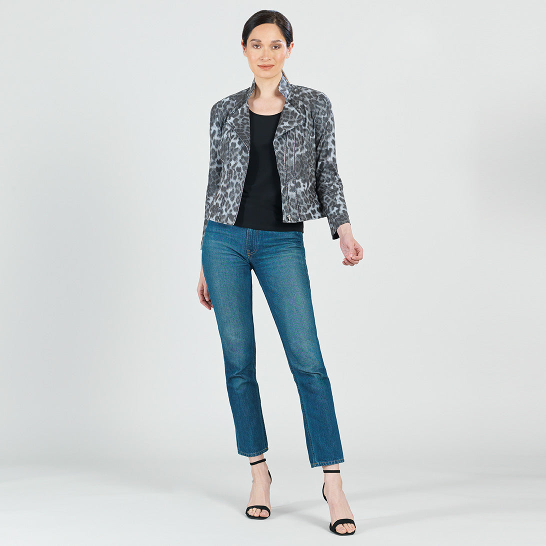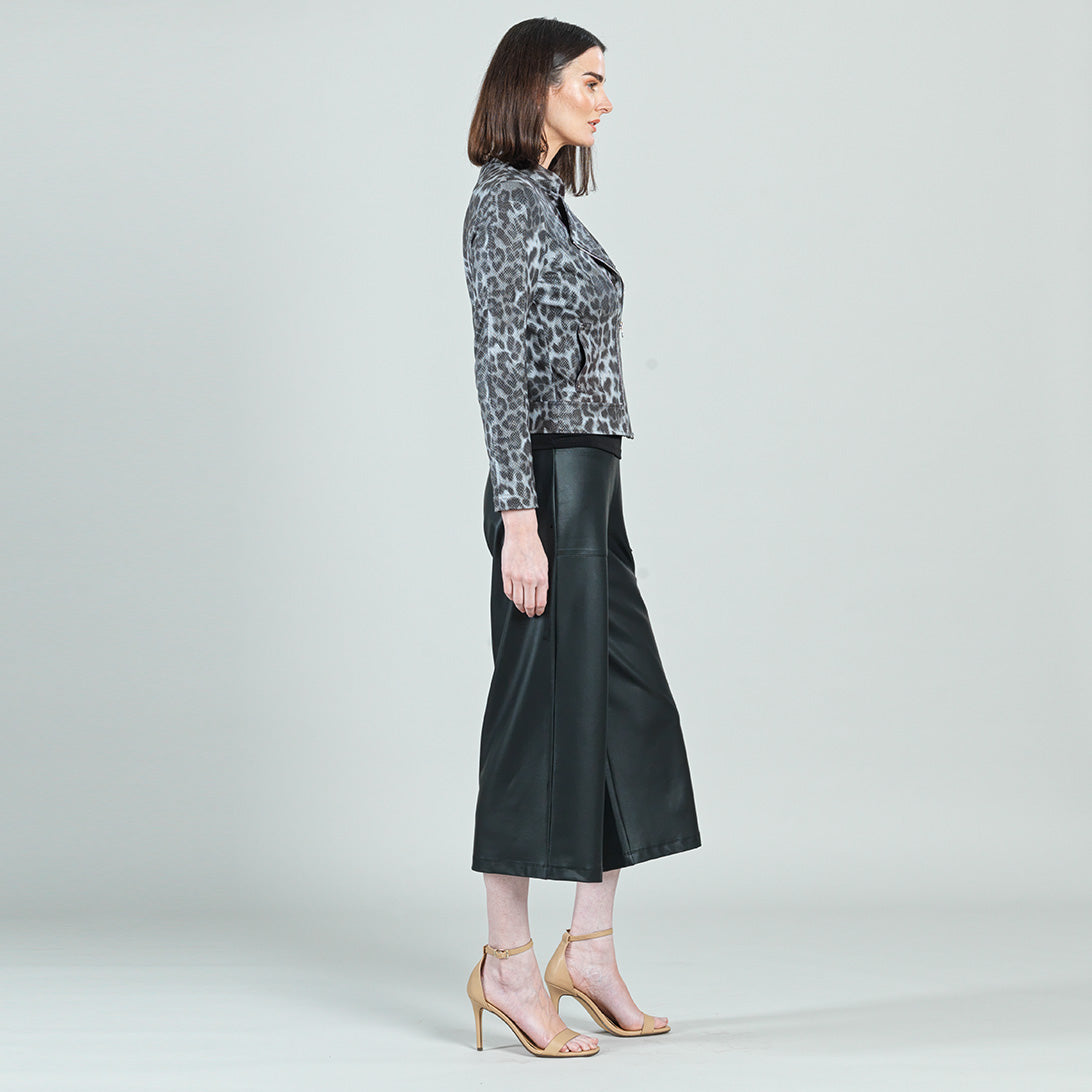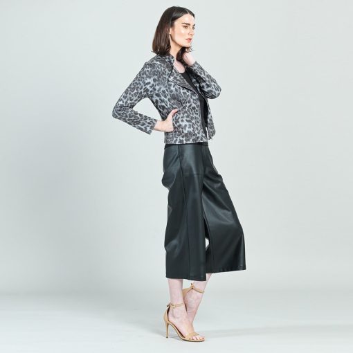 Have all the more reason to be spotted everywhere you go in our Charcoal Cheetah Liquid Leather Textured Double Zip Pocket Jacket! Featuring a notched lapel with an upright collar, silver vertical zip closure with a double zipper detail allowing for a customized silhouette, long sleeves, side pockets with snap details, and beautiful pipe stitching throughout the jacket. Our Charcoal Cheetah print displays a variety of black cheetah spots encompassed by shades of true cool grey and subtle steel blue undertones with a scale-like texture that creates a realistic effect. Made from our beautiful signature stretch knit, extremely lightweight soft “lambskin feel” fabric with a soft matte finish. The interior is made from soft knit giving it the right amount of stretch and providing you with breathable superb wear, best of all it’s vegan-friendly! Clara Sunwoo | Favorite Things from CS on Vimeo. Textured Liquid Leather KnitThis vegan-friendly fabric offers superior comfort and style. Crafted from our signature flexible polyester blend and coated in a faux leather-like scale-like matte finish, it’s cool to the touch, quick-drying, and easy to maintain. Enjoy the look and feel of leather without the guilt.Travel Friendly Ultra Lightweight Soft Knit Fabric – Faux Leather Scale-Like Textured Matte FinishDouble Zip Detail Vegan Friendly!