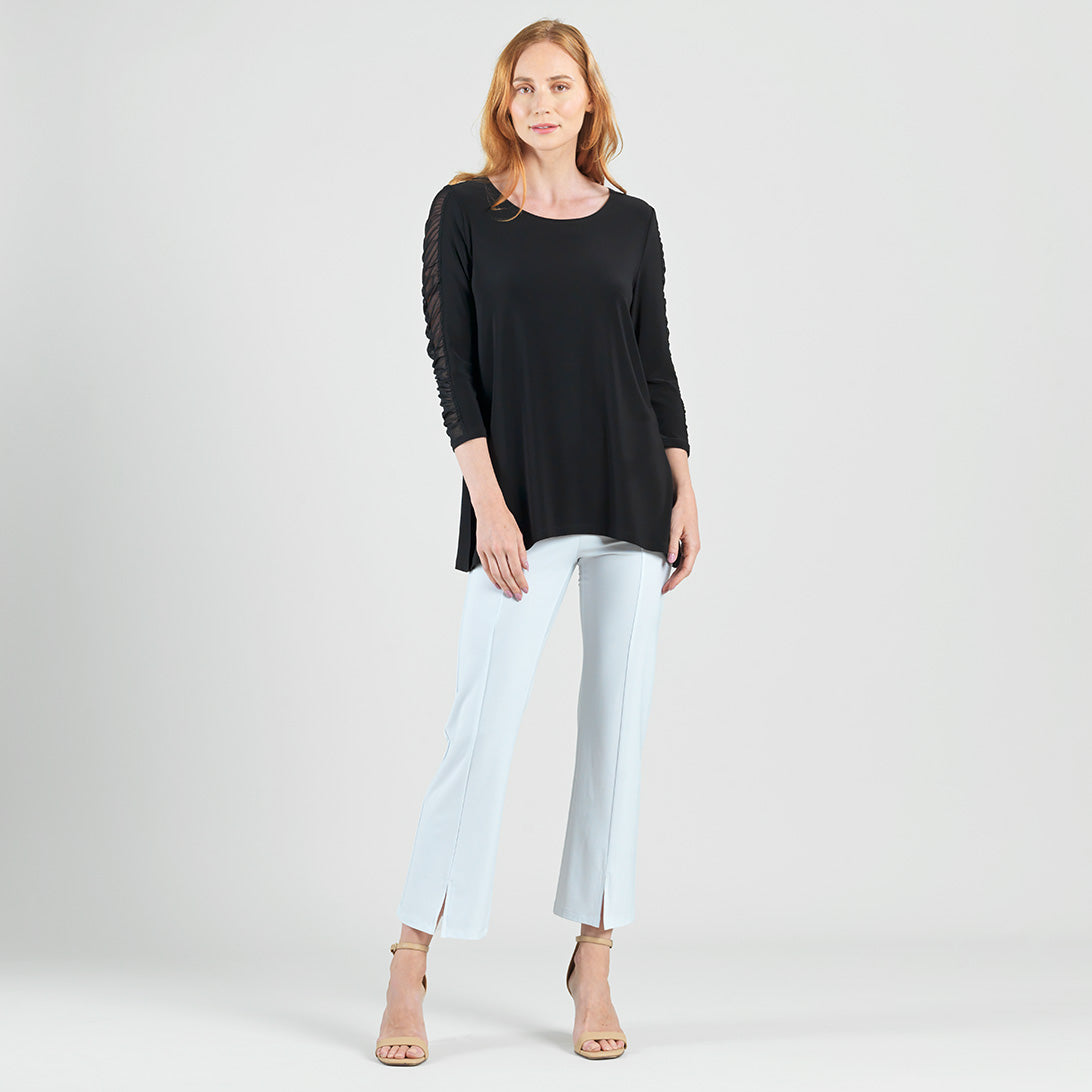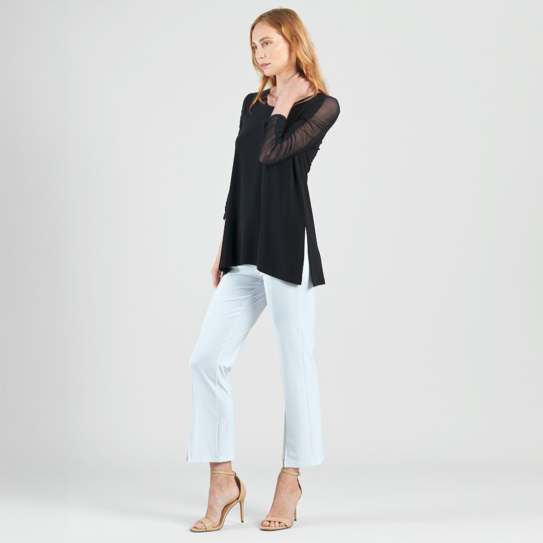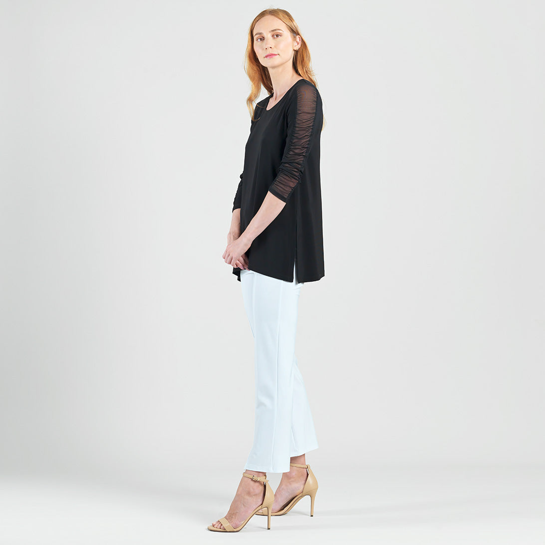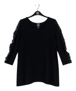 Amp up your style and experience sheer magic in our Mesh Panel Sleeve Side Vent Tunic! This tunic features a scoop neckline, 3/4 length ruched mesh panel sleeves, and a shark bite hemline with 8.5″ dual side vents that create a flattering silhouette. Carefree Travel Fabric – Soft Silky Knit Our signature poly blend fibers offer luxurious softness with lightweight, wrinkle-free comfort. This easy-care fabric is quick drying and cooler than linen or cotton, making it perfect for on-the-go wear.Mesh Panel Sleeves 8.5″ Side Vents Wrinkle Free Travel Friendly Ultra Lightweight Soft Knit Fabric Breathable Jersey-Like Feel