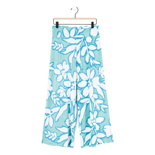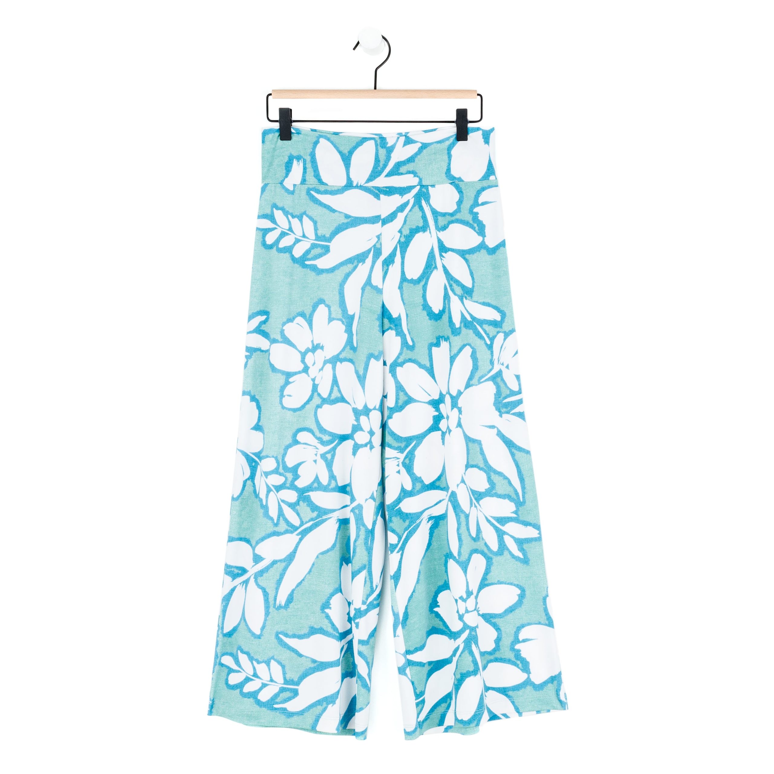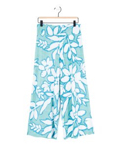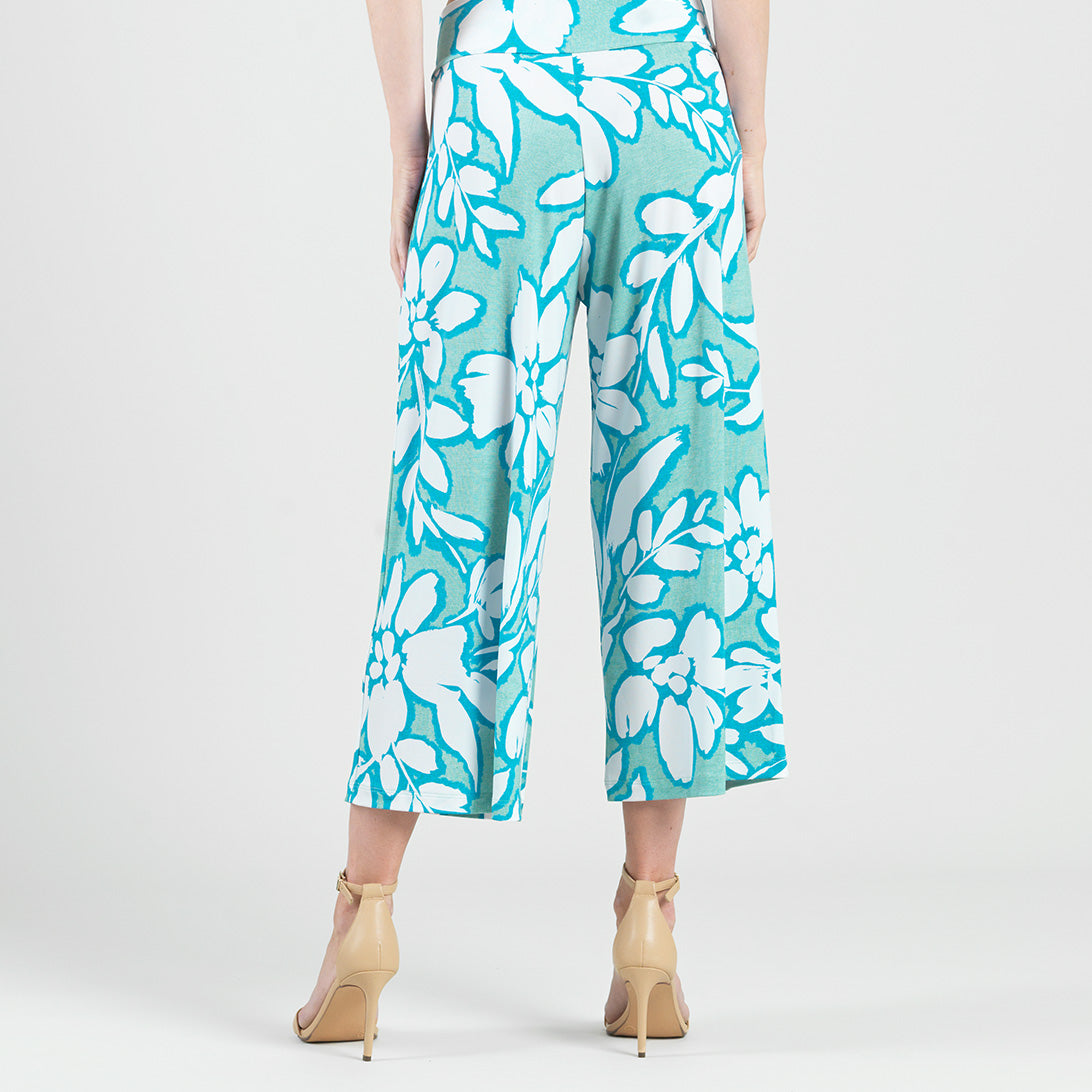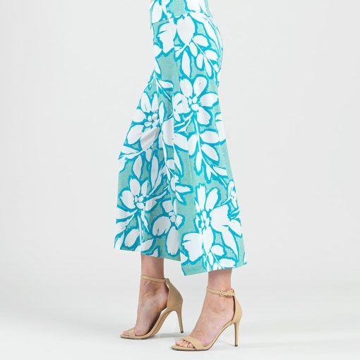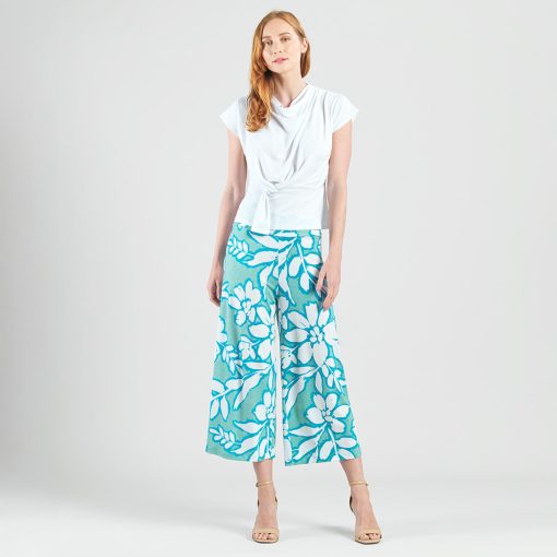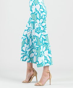 Bloom where the tropical breeze takes you in our Paradise Petal Modern Gaucho Pant! Featuring a 3” pull-on soft waistband, flattering wide-leg cropped hem with a calf-length, designed to naturally flow against the body. A refreshing print featuring large-scale flowers in white, encompassed by vibrant aqua-blue outlines against a mint background, that creates a tropical feel reminiscent of a paradise island. ♥ Each piece is a unique, one-of-a-kind print and print placement will vary. Carefree Travel Fabric – Soft Silky Knit Our signature poly blend fibers offer luxurious softness with lightweight, wrinkle-free comfort. This easy-care fabric is quick drying and cooler than linen or cotton, making it perfect for on-the-go wear.3″ Soft Waistband Wrinkle Free Travel Friendly Ultra Lightweight Soft Knit Fabric Breathable Jersey-Like Feel