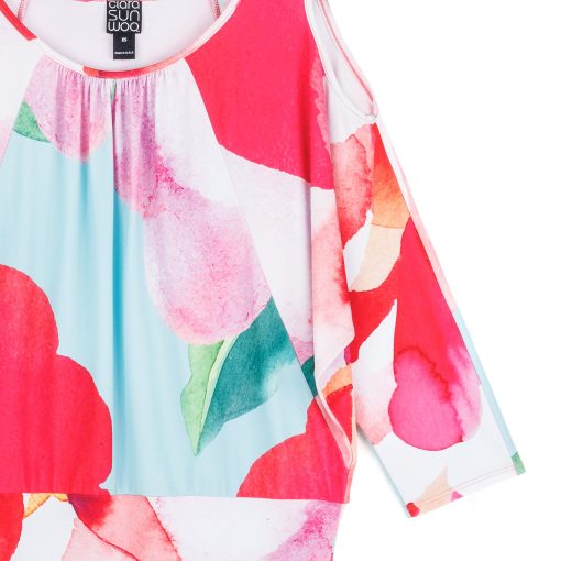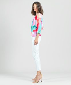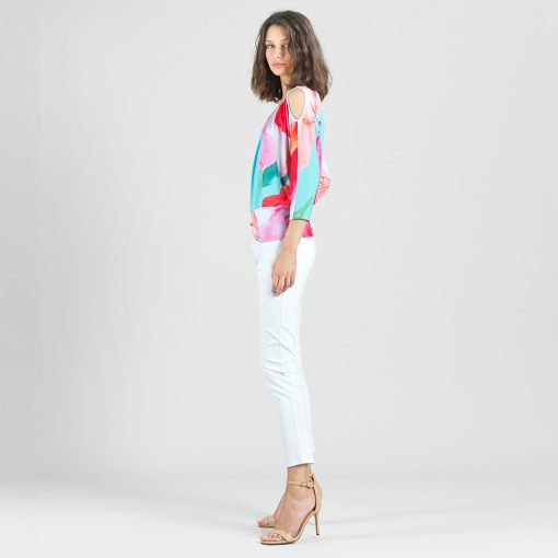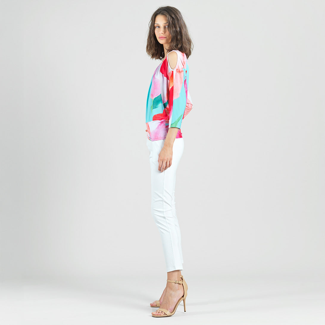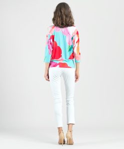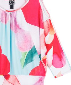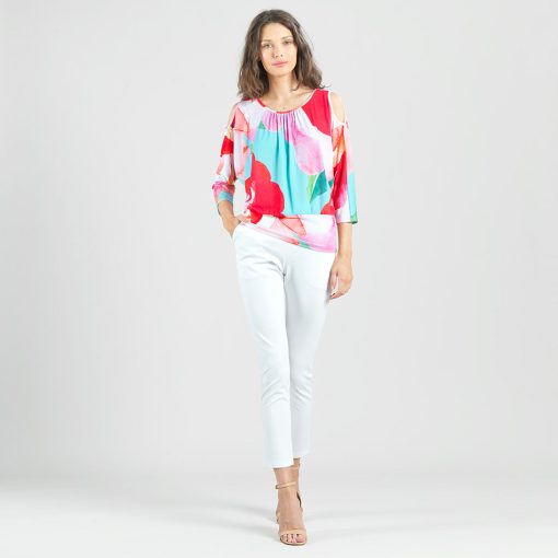 No water is required to bloom in style when you wear our Petal Watercolor Open Shoulder Blouson Waist Top! Featuring an open shoulder with 3/4 length dolman sleeves, a scoop neckline with a gathered detail that creates beautiful soft pleats, front and back side diagonal princess seams, and a waist-hugging hemline, that displays an elegant blouson silhouette. A charming print comprised of blending oversized petals in shades of red, pink, turquoise, orange, green, and white with subtle maroon lines that melt into each other to create a dreamy watercolor effect. ♥ Each piece is a unique, one-of-a-kind print and print placement will vary.Carefree Travel Fabric – Soft Silky Knit Our signature poly blend fibers offer luxurious softness with lightweight, wrinkle-free comfort. This easy-care fabric is quick drying and cooler than linen or cotton, making it perfect for on-the-go wear.Open Shoulder Wrinkle Free Travel Friendly Ultra Lightweight Soft Knit Fabric Breathable Jersey-Like Feel