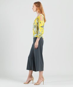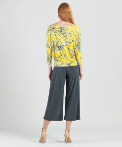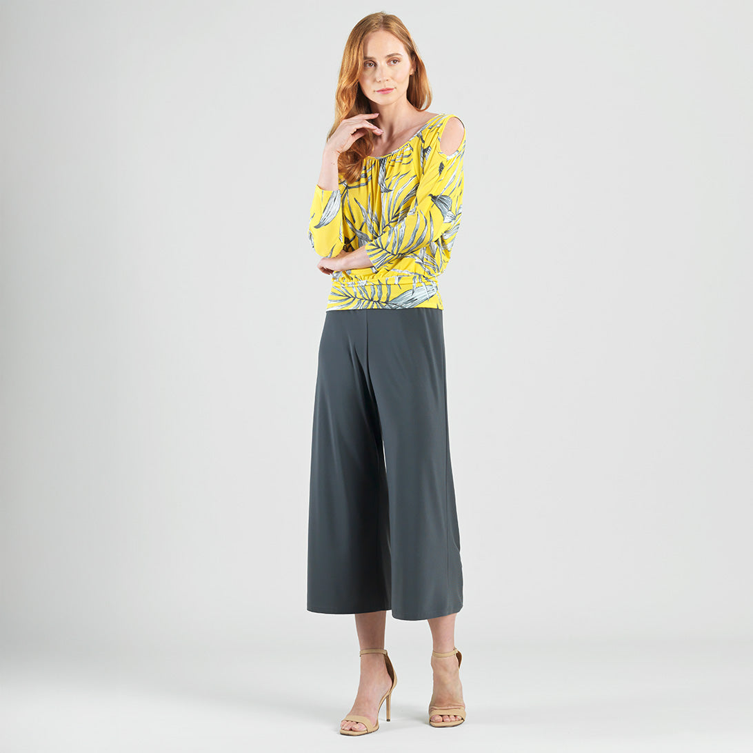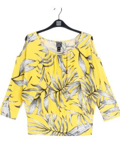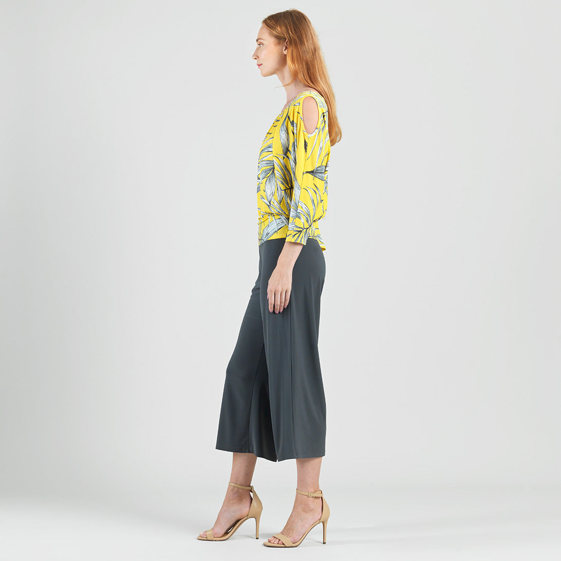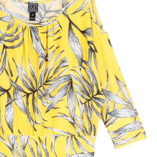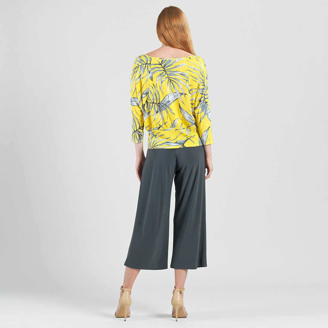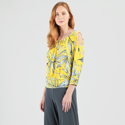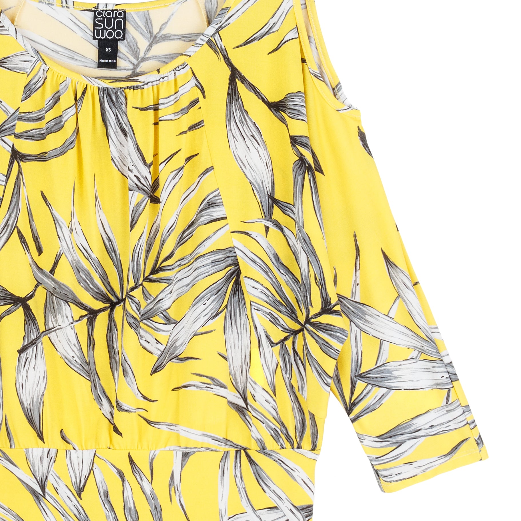 Shine bright as you bask in our Sunlit Palm Open Shoulder Blouson Waist Top! Featuring an open shoulder with 3/4 length dolman sleeves, a scoop neckline with a gathered detail that creates beautiful soft pleats, front and back side diagonal princess seams, and a waist-hugging hemline, that displays an elegant blouson silhouette. A visually appealing print featuring palm leaves in shades of grey and white against a bright yellow background, inspired by palm branch shadows in the sun. ♥ Each piece is a unique, one-of-a-kind print and print placement will vary.Carefree Travel Fabric – Soft Silky Knit Our signature poly blend fibers offer luxurious softness with lightweight, wrinkle-free comfort. This easy-care fabric is quick drying and cooler than linen or cotton, making it perfect for on-the-go wear.Open Shoulder Wrinkle Free Travel Friendly Ultra Lightweight Soft Knit Fabric Breathable Jersey-Like Feel