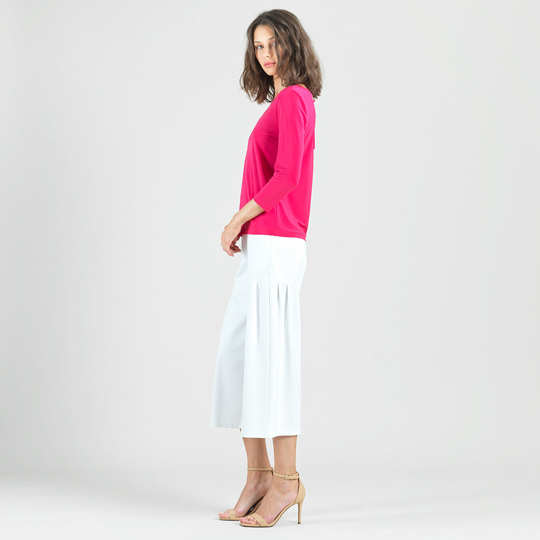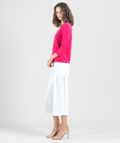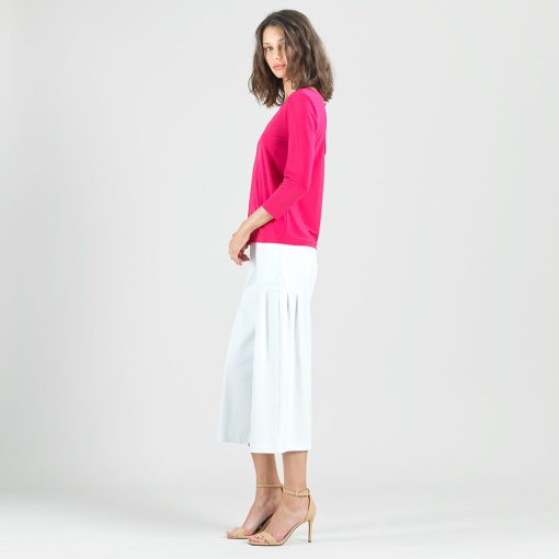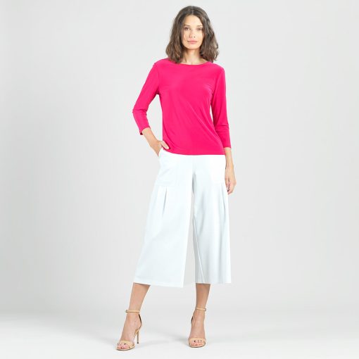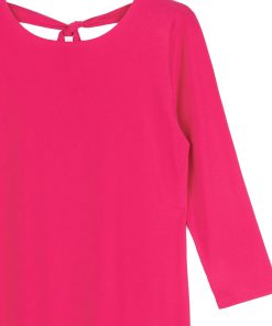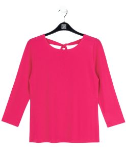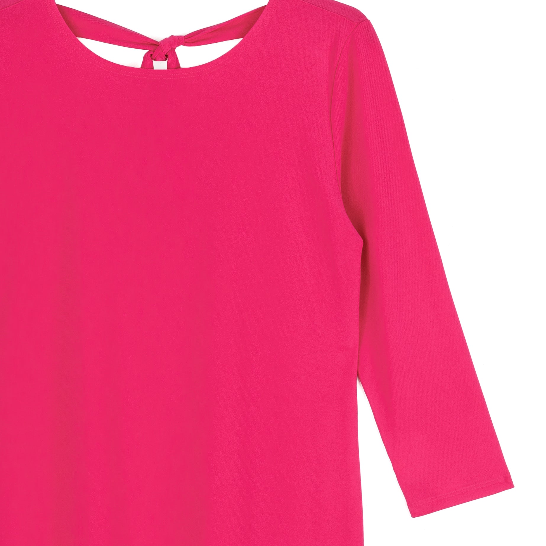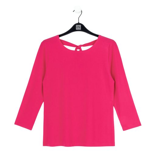 Our Reversible Back Tie Top is a basic silhouette with feminine features! Featuring a round neckline, 3/4 length sleeves, a straight hemline, and a reversible charming back tie detail. ♥ Can also be worn with the back tie in the front for an alternative neckline! Our Hot Pink shade is a warm, vibrant color with magenta undertones.Carefree Travel Fabric – Soft Silky Knit Our signature poly blend fibers offer luxurious softness with lightweight, wrinkle-free comfort. This easy-care fabric is quick drying and cooler than linen or cotton, making it perfect for on-the-go wear.Reversible Back Tie Detail Wrinkle Free Travel Friendly Ultra Lightweight Soft Knit Fabric Breathable Jersey-Like Feel