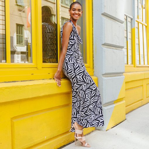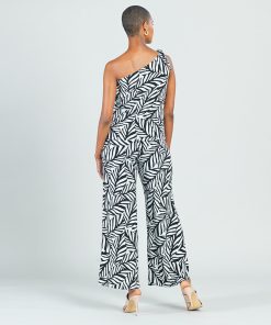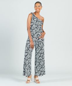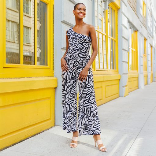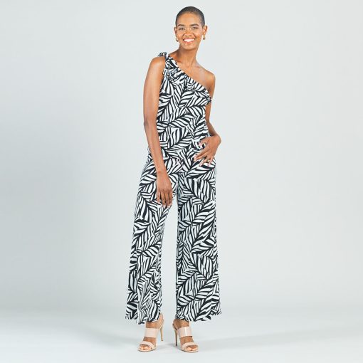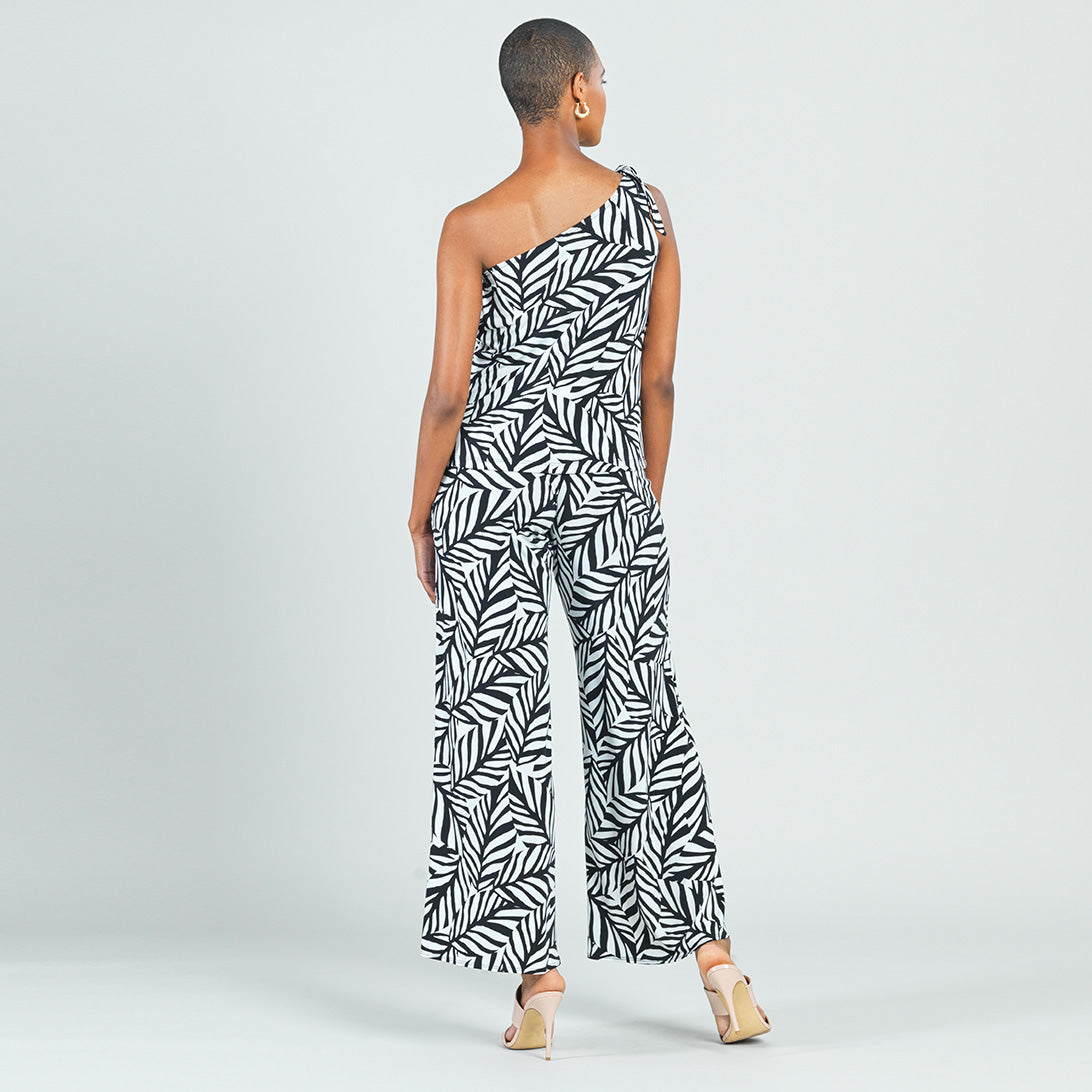 Let our Leaf Stripe Ribbon One Shoulder Ruffle Neckline Top help you to branch out! This style features a ruffled, asymmetrical neckline created by a sleek, one-shoulder, bra-friendly strap which displays a charming, ribbon-tie detail, and a straight hemline. A large-scale leaf print in a stripe-like cluster, comprised of white and black shades. ♥ Each piece is a unique, one-of-a-kind print and print placement will vary. Carefree Travel Fabric – Soft Silky Knit Our signature poly blend fibers offer luxurious softness with lightweight, wrinkle-free comfort. This easy-care fabric is quick drying and cooler than linen or cotton, making it perfect for on-the-go wear.Wrinkle Free Travel Friendly Ultra Lightweight Soft Knit Fabric Breathable Jersey-Like Feel