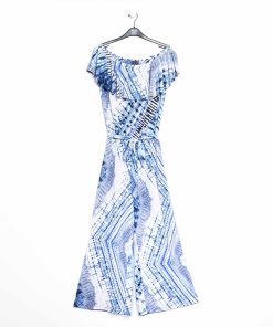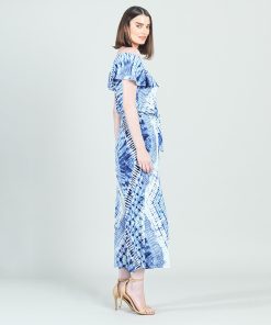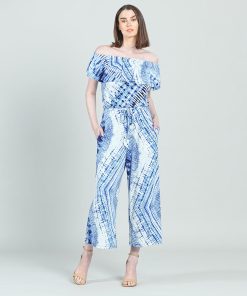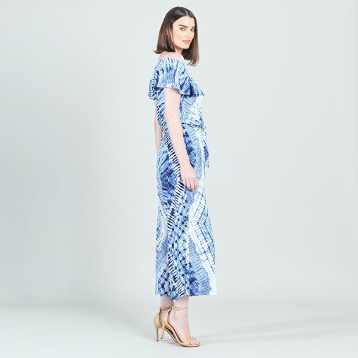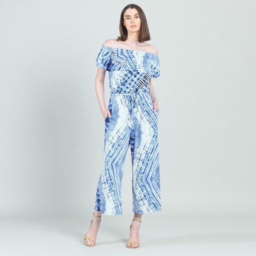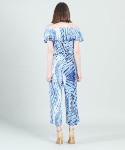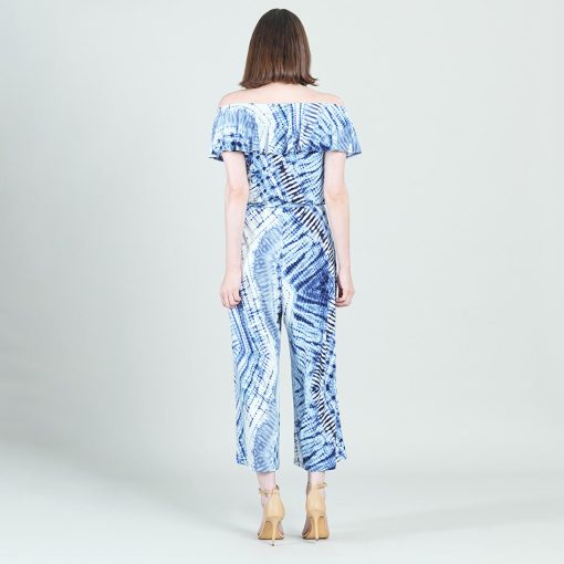 Our Acid Wash Ruffle Off Shoulder Pocket Jumpsuit is to dye for! Featuring a feminine off-shoulder, ruffled overlay neckline, an elastic waistband with tie-waist detail to accentuate your shape, two modern pockets, and a cropped gaucho silhouette. **Can also be worn on the shoulder for an alternative neckline! A stunning acid wash print, comprised of oceanic shades of navy, sky, baby blues, and white, with subtle hints of teal and beige, that display a tie-dye effect, in sunburst shapes. ♥ Each piece is a unique, one-of-a-kind print and print placement will vary. Carefree Travel Fabric – Soft Silky Knit Our signature poly blend fibers offer luxurious softness with lightweight, wrinkle-free comfort. This easy-care fabric is quick drying and cooler than linen or cotton, making it perfect for on-the-go wear.Wrinkle Free Travel Friendly Ultra Lightweight Soft Knit Fabric Breathable Jersey-Like Feel Alternative Neckline