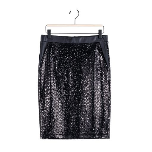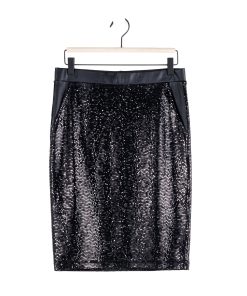 Add some sparkle to your day, by wearing our Sequin Knit Liquid Leather Trim Pencil Skirt! With a classic shape and modernized edge, this skirt features a soft-sheen liquid leather trim detail for a 1.25” pull-on elastic waistband and side pocket insert and is designed with a slender silhouette that accentuates the natural curve of the body. A new alluring fabric, that delivers a consistent and radiant shine with a luxurious texture. Adorned with an elegant array of small reflective sequins that are evenly distributed, and catch the light to create a dynamic sparkle with every movement. Designed with soft comfort, and excellent stretch, this fabric is durable, resilient, and offers superb flexibility. Nylon-Sequin Knit w/ Liquid Leather InsertHigh-quality nylon-sequin blend fibers offer luxurious texture with soft comfort and reflective shine. A fabric elevated by small reflective sequins and trim inserts coated in a vegan-friendly, faux leather-like soft sheen finish. 1.25″ Pull-On Elastic Waistband Side Pockets Travel Friendly Textured Sequin Knit Soft-Sheen Liquid Leather InsertVegan Friendly!