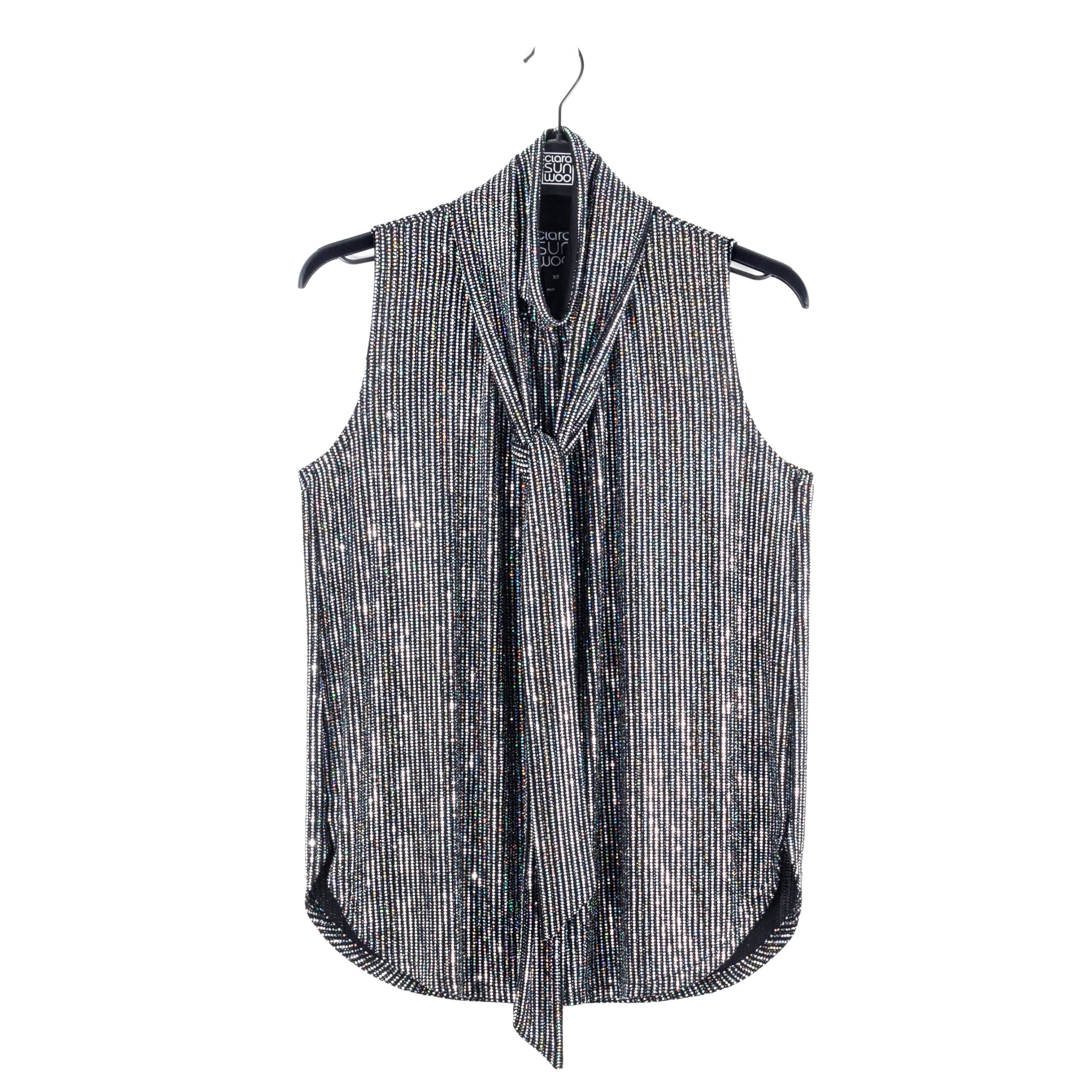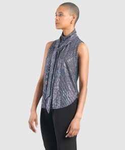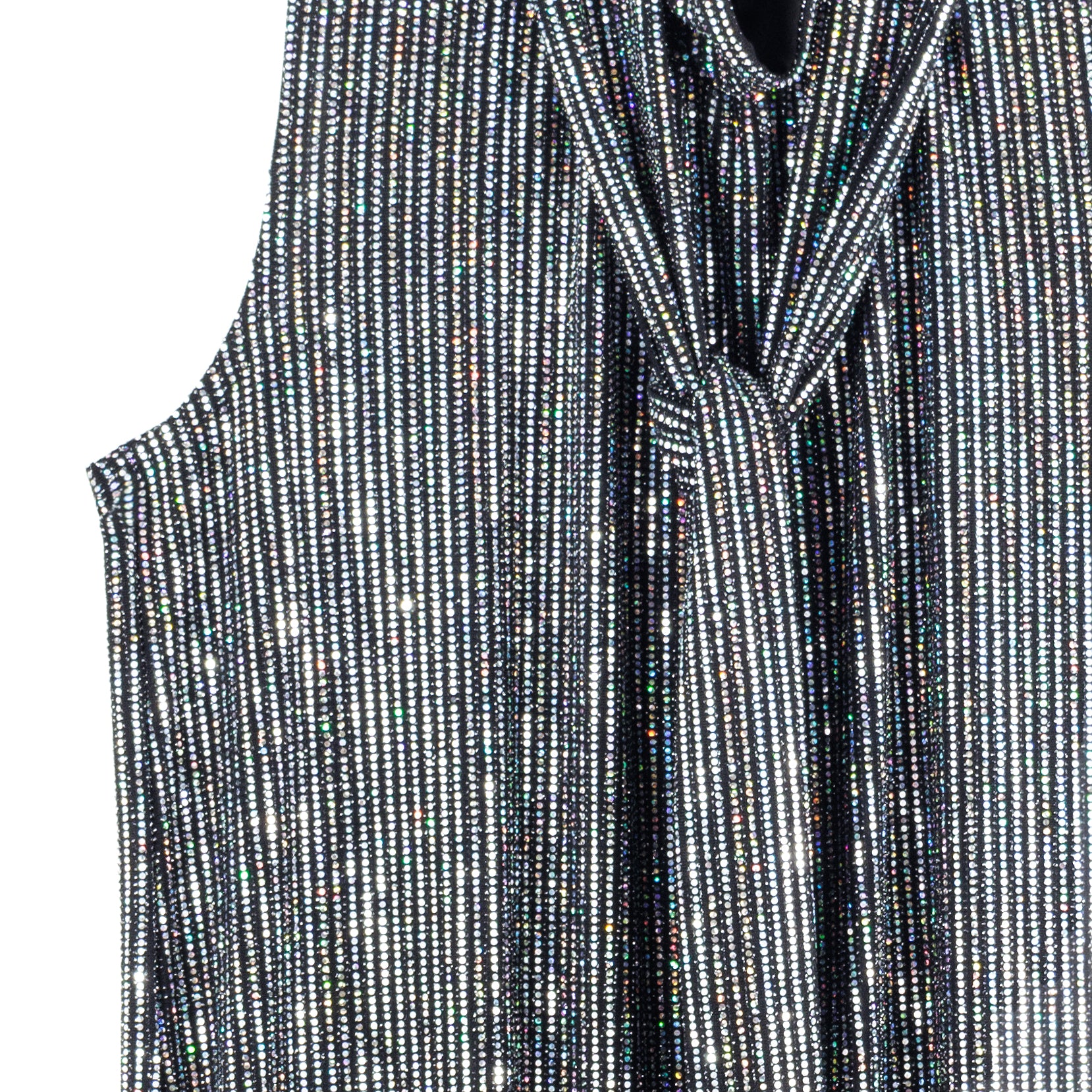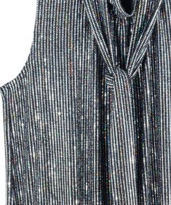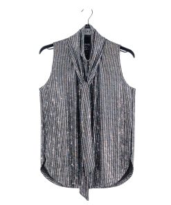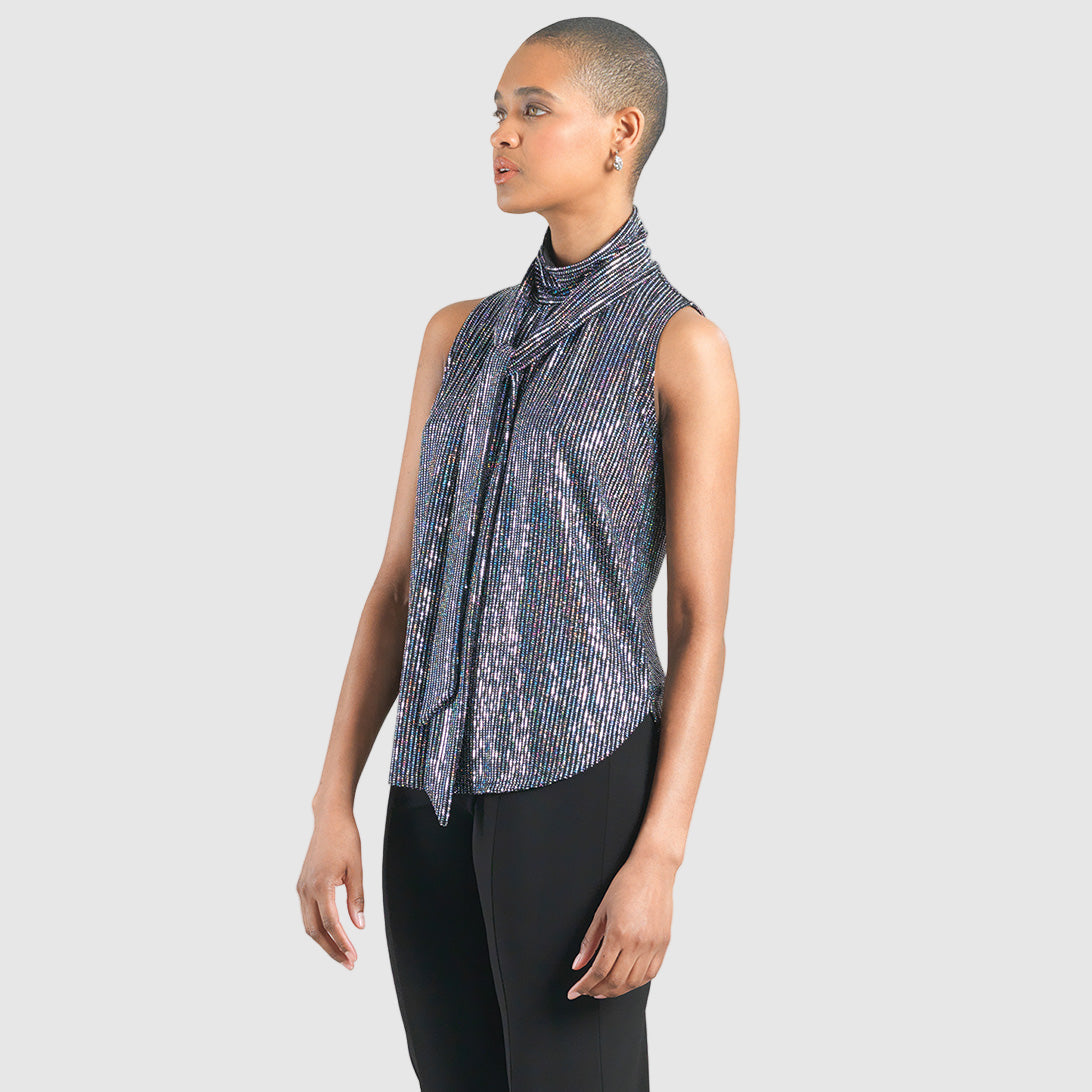 Turn heads while lighting up any room in our Silver Pinstripe Mock Neck-Tie Detail Top! This sleeveless, bra-friendly style features a charming mock neck-tie detail that can be styled multiple ways, and feminine micro-pleats that begin at the neck and transition to a soft-draped body, with a 3″ side-vented scallop hemline. A new intricately delicate fabric, inspired by art-deco glamour. A lustrous formation of pinstripes created by mini textured silver holographic sequins that showcase an enchanting spectrum of rainbow colors. Designed with a mid-weight finish, fluid drape, and structured flexibility, offering unparalleled longevity. **Please Note: Due to the textured nature of this fabric, we suggest refraining from pairing this item with delicate materials to avoid the risk of pilling. Carefree Travel Fabric – Soft Silky Knit w/ Shimmer Sequin Texture Our signature poly blend fibers offer luxurious softness with lightweight, wrinkle-free comfort. A fabric elevated by delicately textured silver holographic sequins. This easy-care fabric is quick drying and cooler than linen or cotton, making it perfect for on-the-go wear. Wrinkle Free Travel Friendly Mid-Weight Fabric Breathable Jersey-Knit Base Shimmer Sequin Textured Delicate Finish, Lightly-Lined