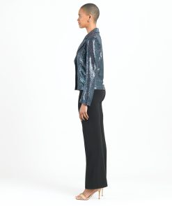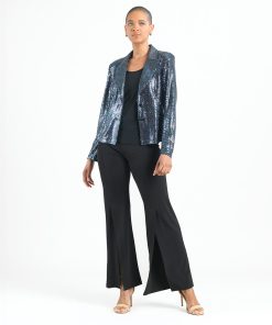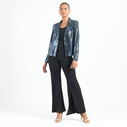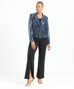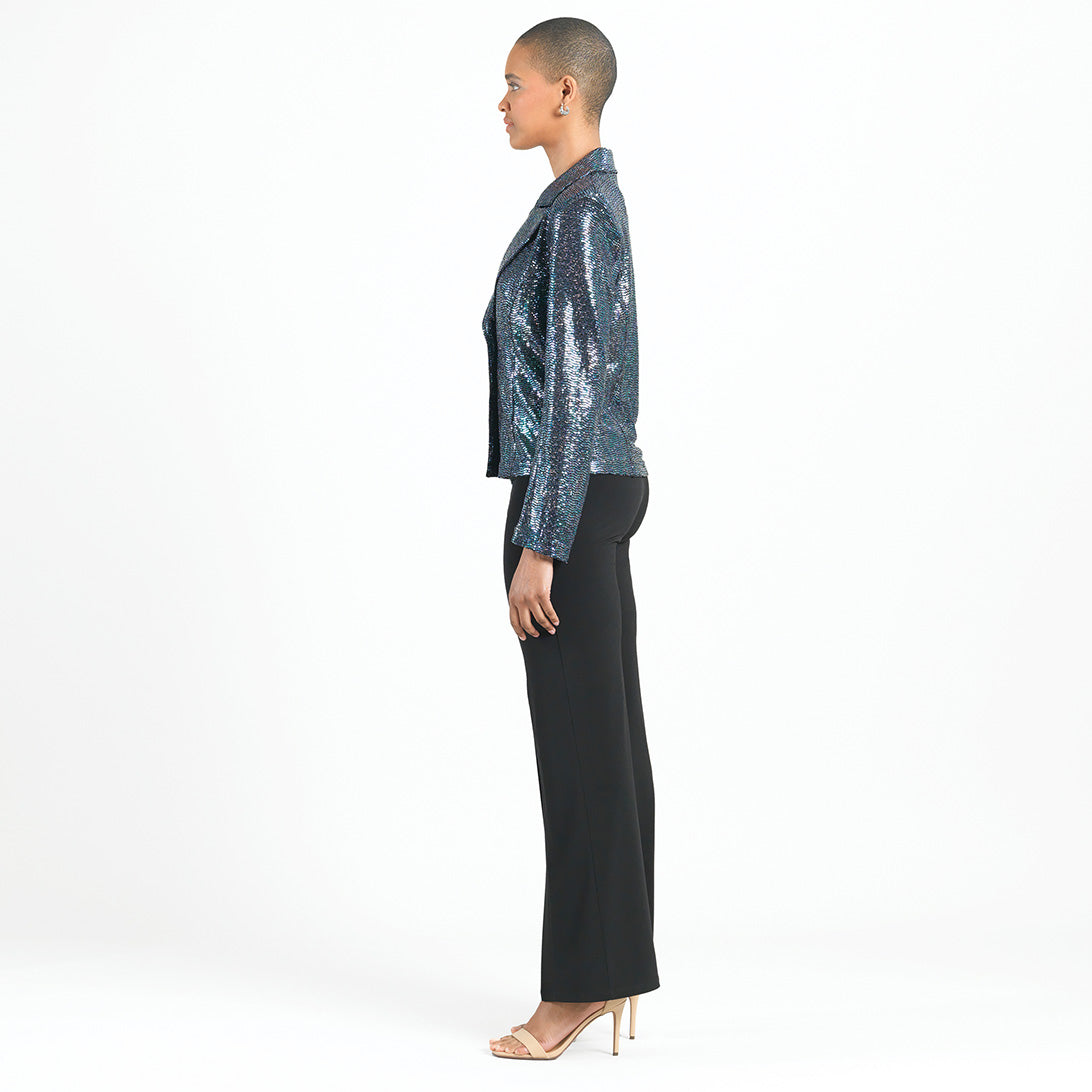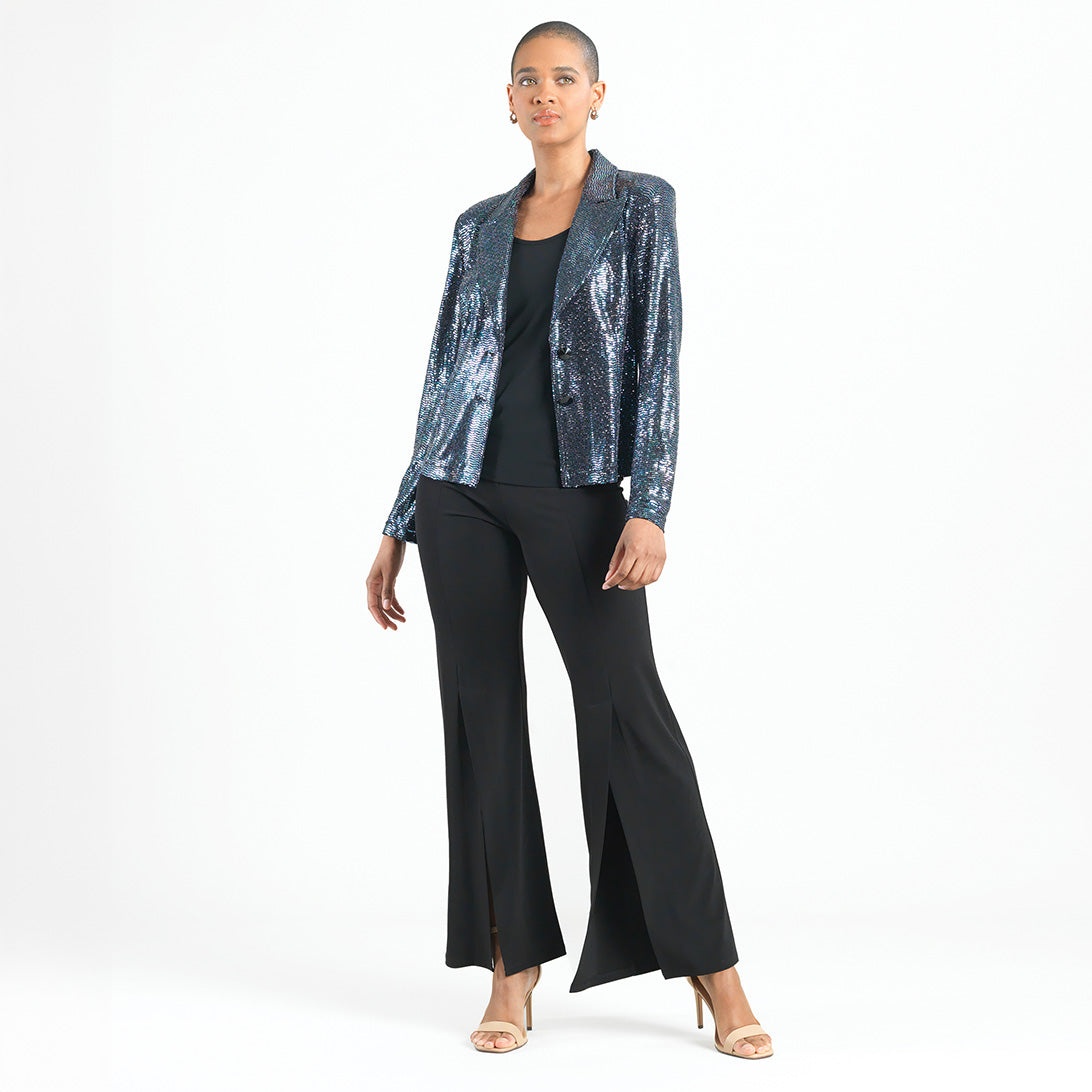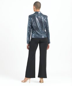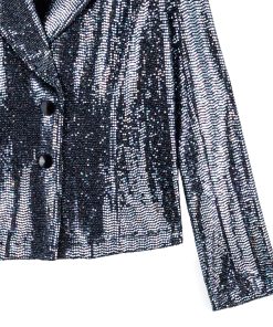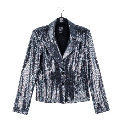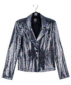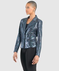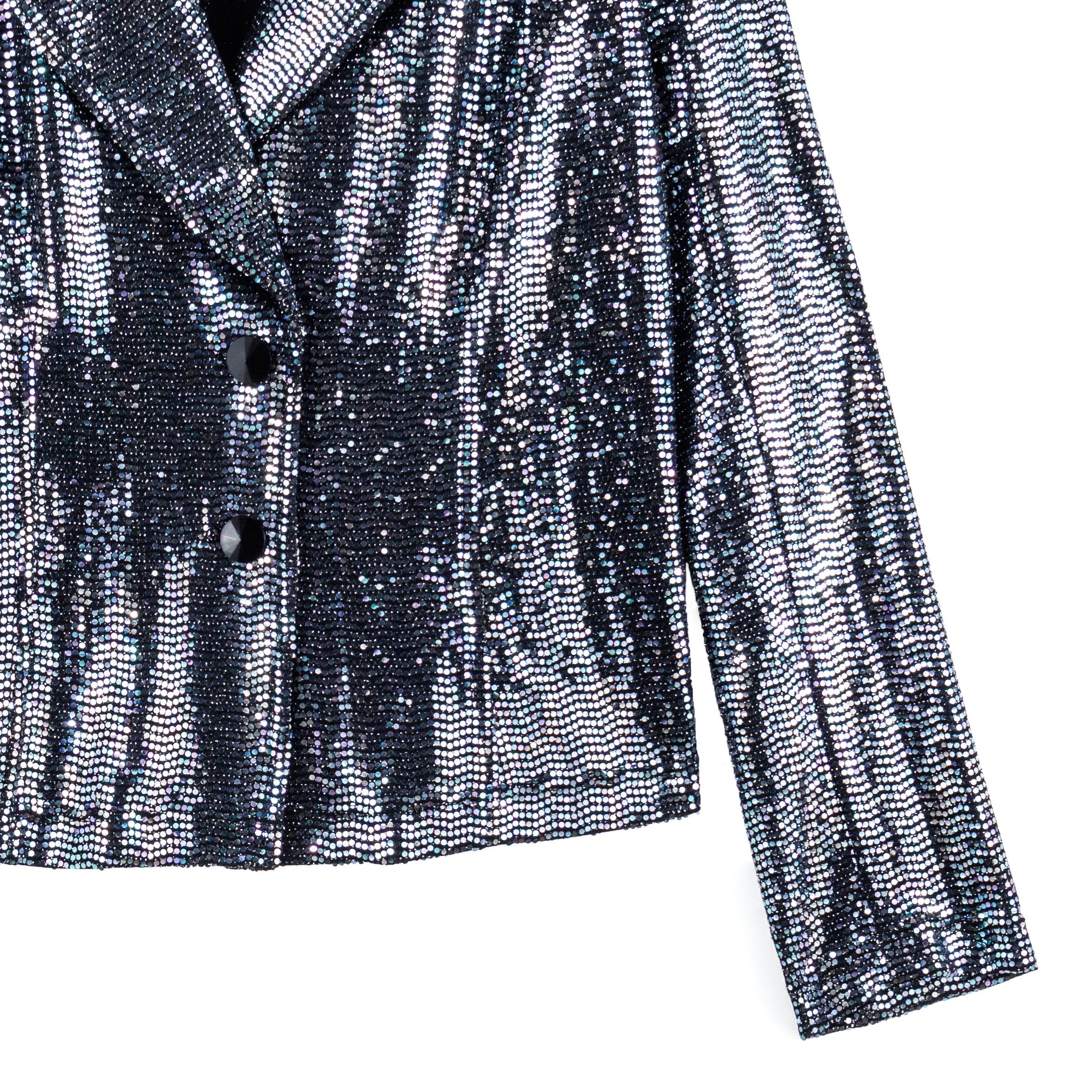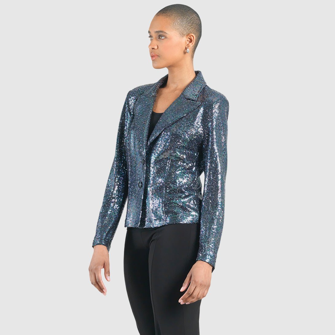 Blaze a new fashion trail and leave a little sparkle behind in our Sequin Knit Modern Button Blazer! This beautiful blazer features a standard collar with a peak lapel, inner shoulder pads, long sleeves, single-breasted-diamond-shaped shiny black 2-button closure, and bodice princess seaming. Our Gunmetal shimmer sequin is a dark silver chrome that creates a galactic coloration comprised of blue and purple undertones. A new intricately delicate fabric, inspired by art-deco glamour. A lustrous formation of shimmer created by mini textured holographic sequins that showcase an enchanting spectrum of colors. Designed with a mid-weight finish, fluid drape, and structured flexibility, offering unparalleled longevity. **Please Note: Due to the textured nature of this fabric, we suggest refraining from pairing this item with delicate materials to avoid the risk of pilling. Nylon-Shimmer Sequin Texture KnitHigh-quality nylon-sequin blend fibers offer luxurious texture with soft comfort and reflective shine. A fabric elevated by small reflective sequins that coat a lightly lined jersey knit base. Single Breasted, 2-Button ClosureTextured Sequin Knit Breathable Jersey-Knit BaseDelicate Finish, Lightly-LinedTravel Friendly