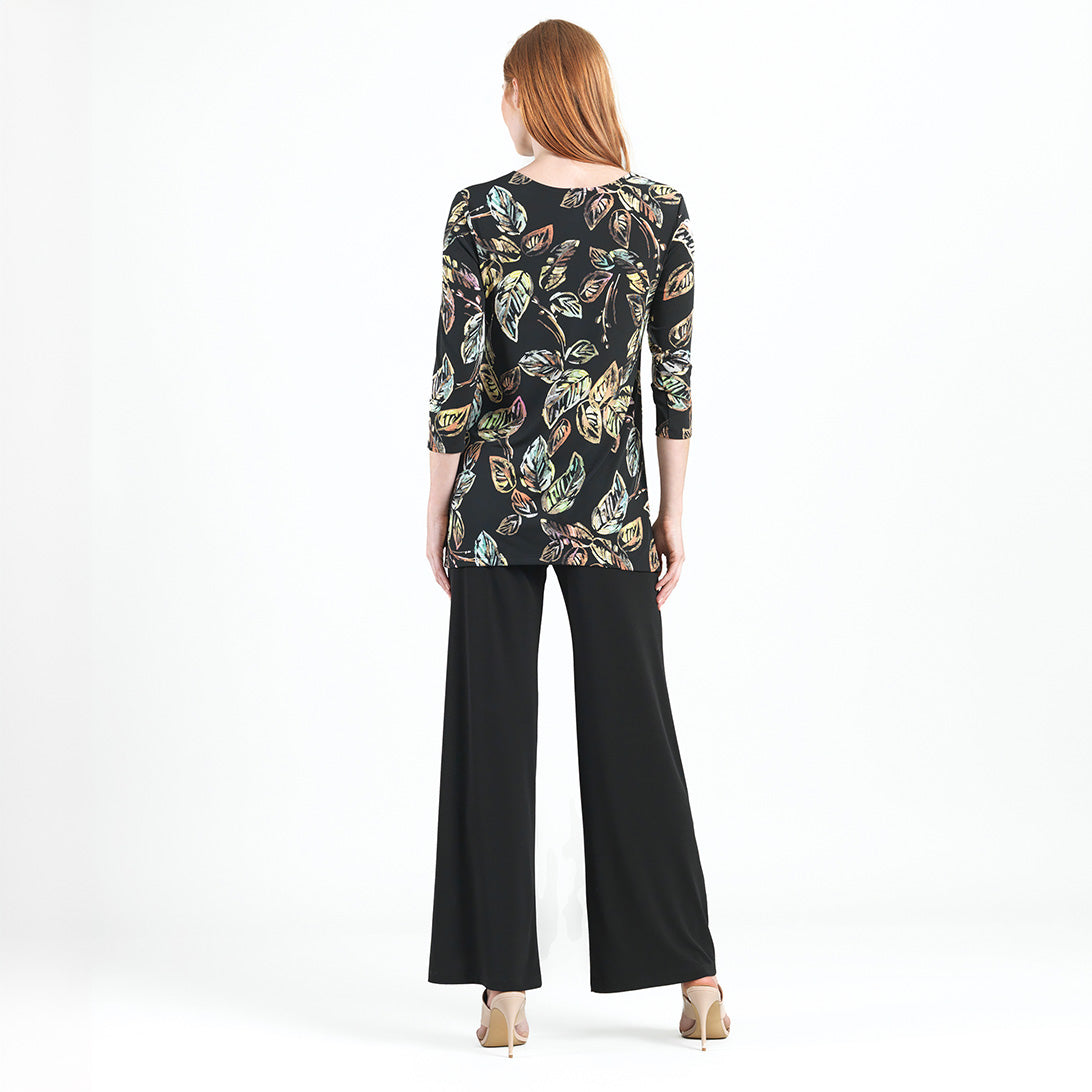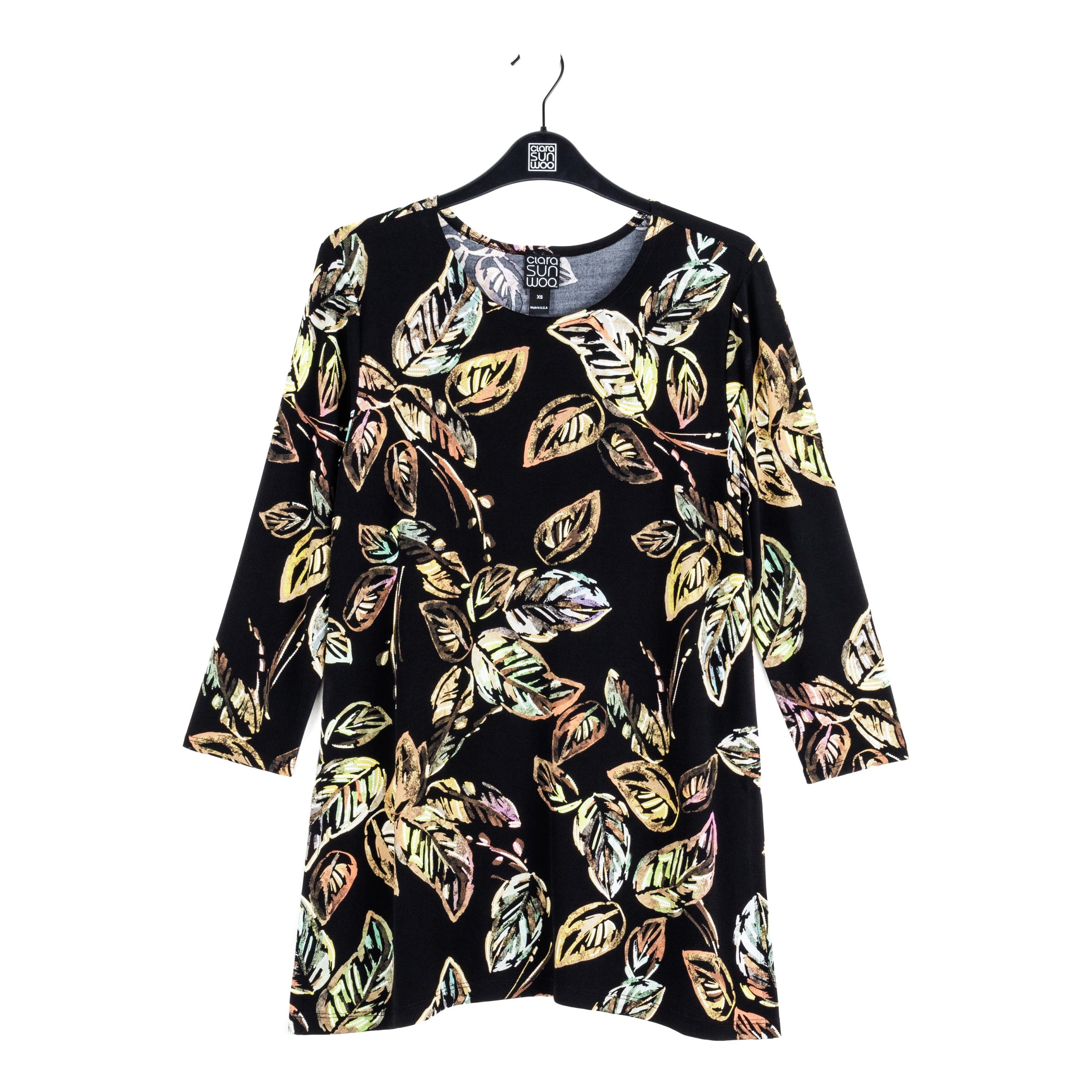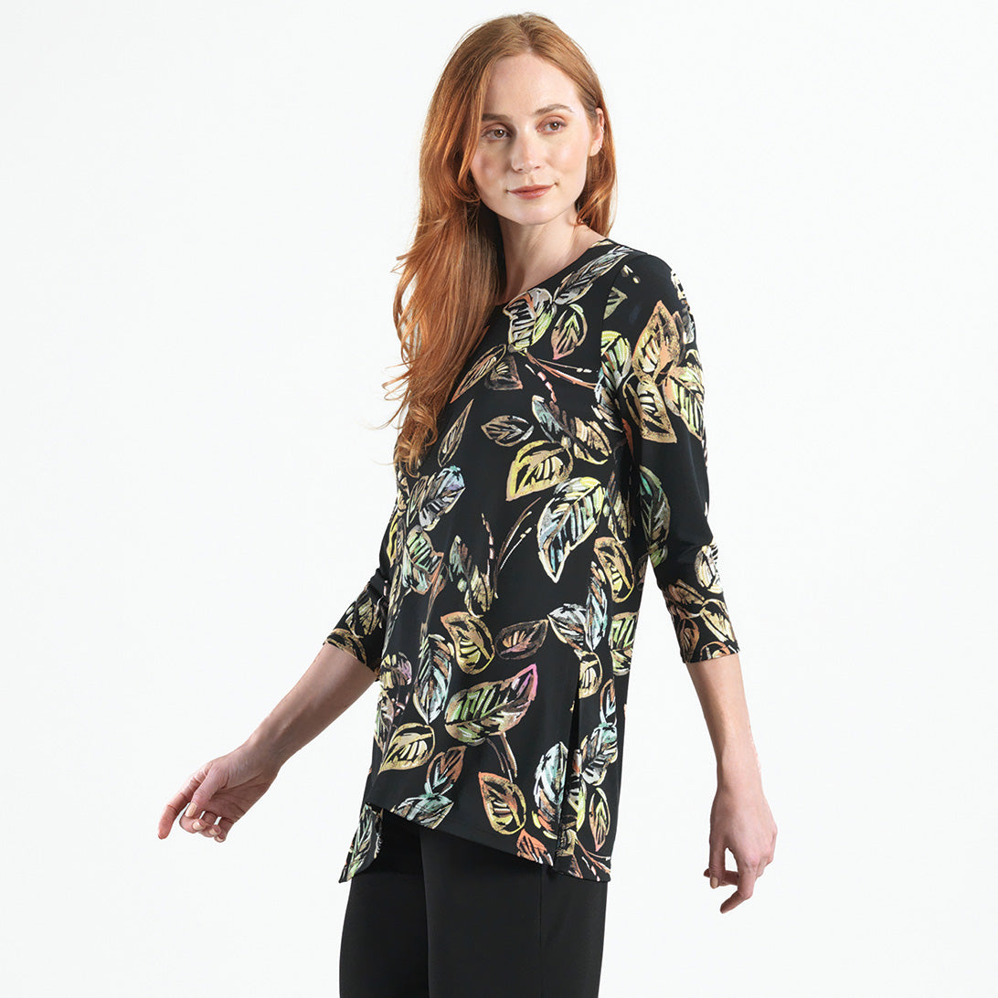 Embrace the beauty of nature and branch out in style with our Leaf Colorburst Side Vent Kerchief Hem Tunic! This tunic features a round neckline, 3/4 length sleeves, and a kerchief hemline with dual side vents that create a flattering silhouette. A serene print featuring leaves and branches that blend rust, soft yellows, lilacs, greens, blues, and white textured embossed-like threading against a black background to create a gentle symphony of tranquil color. ♥ Each piece is a unique, one-of-a-kind print and print placement will vary. Carefree Travel Fabric – Soft Silky Knit Our signature poly blend fibers offer luxurious softness with lightweight, wrinkle-free comfort. This easy-care fabric is quick drying and cooler than linen or cotton, making it perfect for on-the-go wear.Wrinkle Free Travel Friendly Ultra Lightweight Soft Knit Fabric Breathable Jersey-Like Feel