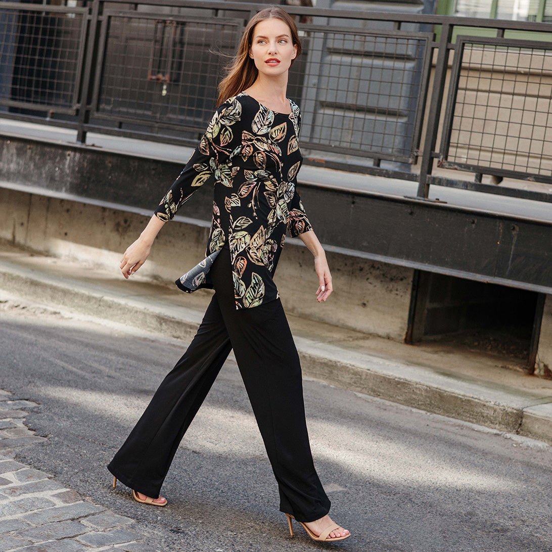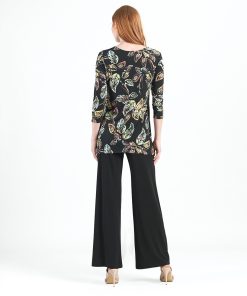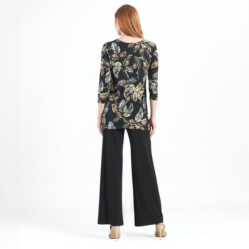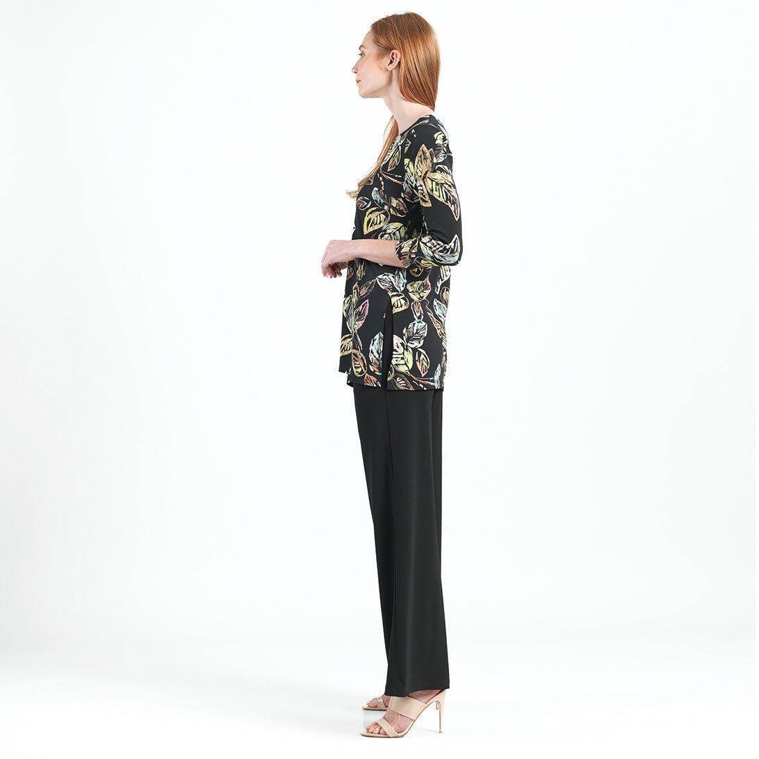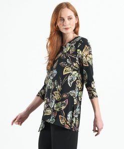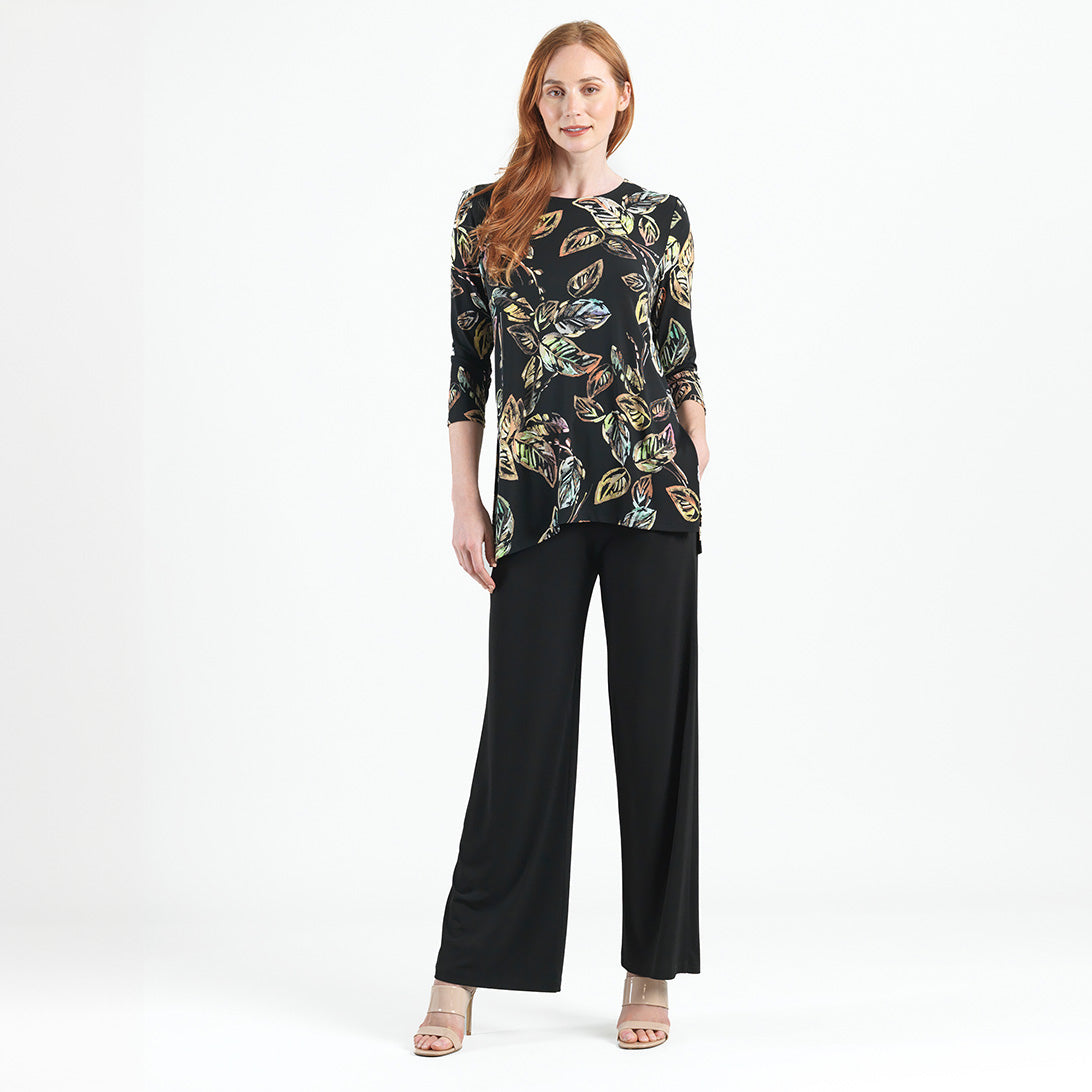 Embrace the beauty of nature and branch out in style with our Leaf Colorburst Side Vent Kerchief Hem Tunic! This tunic features a round neckline, 3/4 length sleeves, and a kerchief hemline with dual side vents that create a flattering silhouette. A serene print featuring leaves and branches that blend rust, soft yellows, lilacs, greens, blues, and white textured embossed-like threading against a black background to create a gentle symphony of tranquil color. ♥ Each piece is a unique, one-of-a-kind print and print placement will vary. Carefree Travel Fabric – Soft Silky Knit Our signature poly blend fibers offer luxurious softness with lightweight, wrinkle-free comfort. This easy-care fabric is quick drying and cooler than linen or cotton, making it perfect for on-the-go wear.Wrinkle Free Travel Friendly Ultra Lightweight Soft Knit Fabric Breathable Jersey-Like Feel