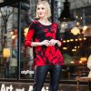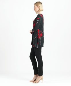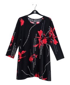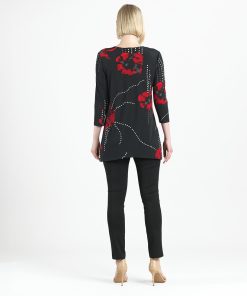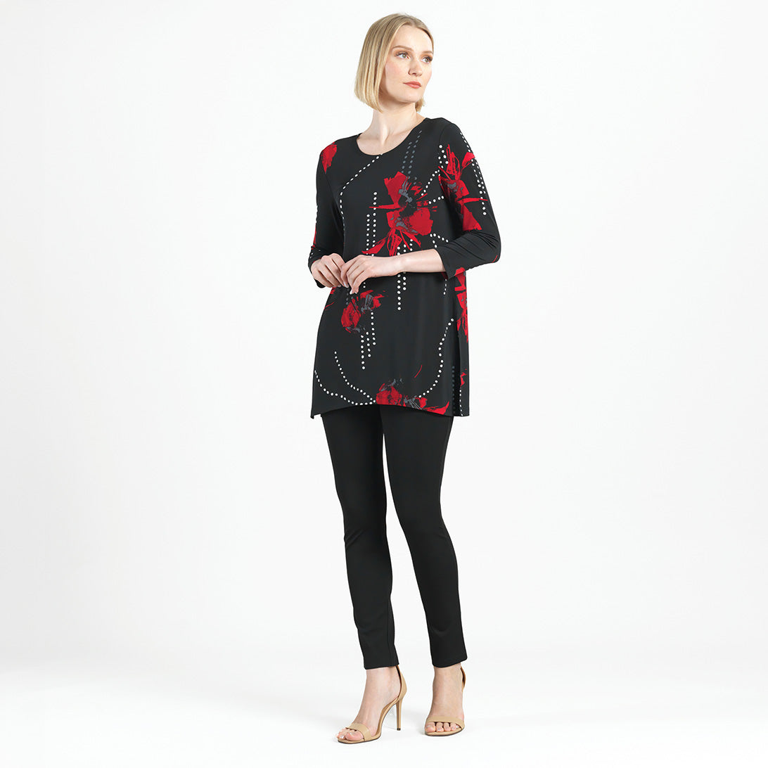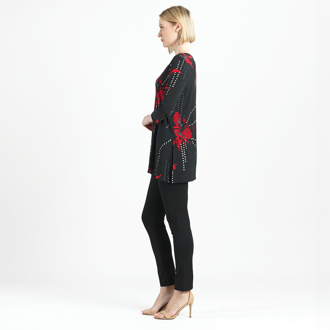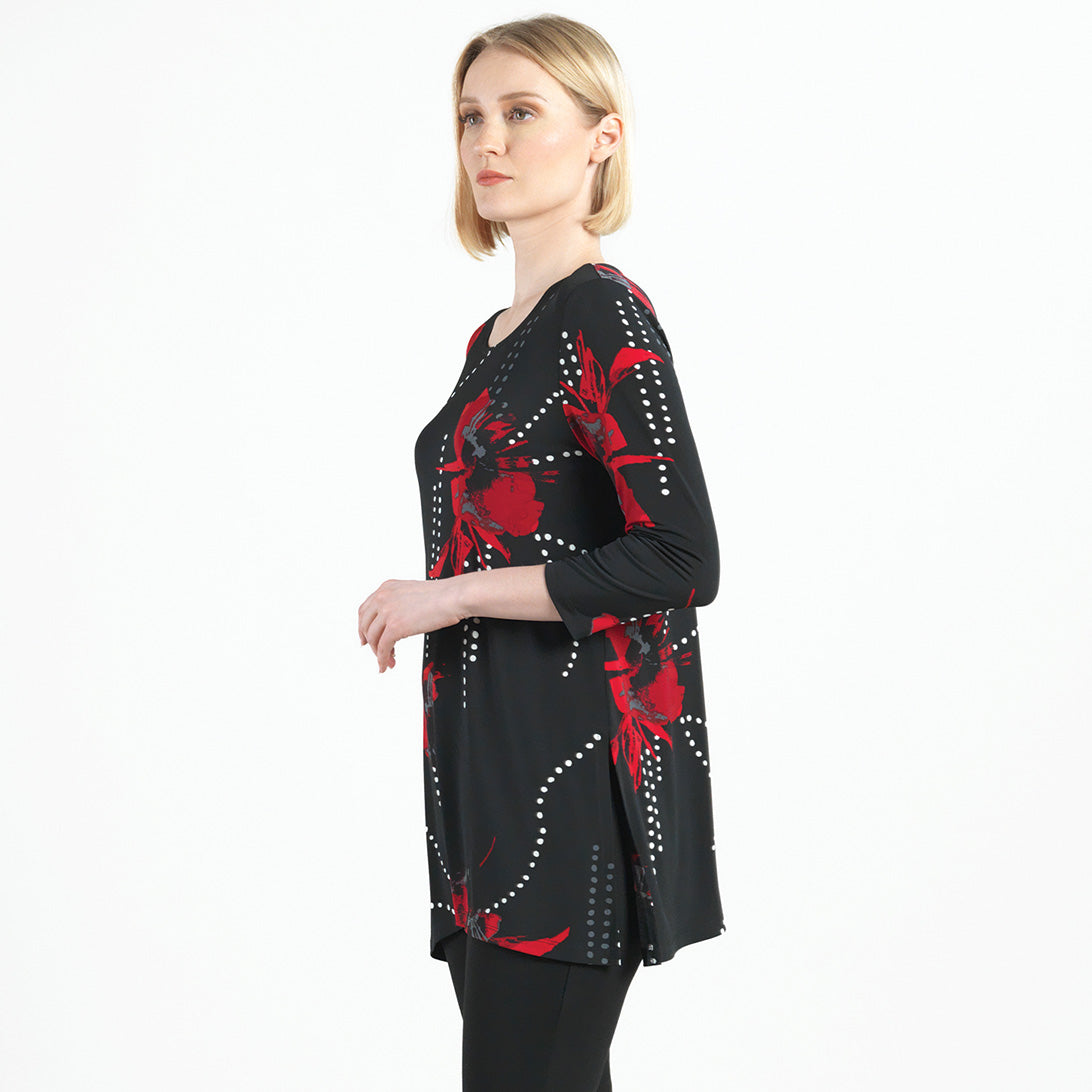 Connect the fashion dots and allow your wardrobe to blossom in our Polka Poppy Side Vent Kerchief Hem Tunic! This tunic features a round neckline, 3/4 length sleeves, and a kerchief hemline with dual side vents that create a flattering silhouette. A striking print that displays a motif of poppy blossoms in shades of crimson and ruby red, encompassed by subtle hints of grey, and cascading white and grey polka dots that infuse a playful and modern twist. ♥ Each piece is a unique, one-of-a-kind print and print placement will vary. Carefree Travel Fabric – Soft Silky Knit Our signature poly blend fibers offer luxurious softness with lightweight, wrinkle-free comfort. This easy-care fabric is quick drying and cooler than linen or cotton, making it perfect for on-the-go wear.Wrinkle Free Travel Friendly Ultra Lightweight Soft Knit Fabric Breathable Jersey-Like Feel