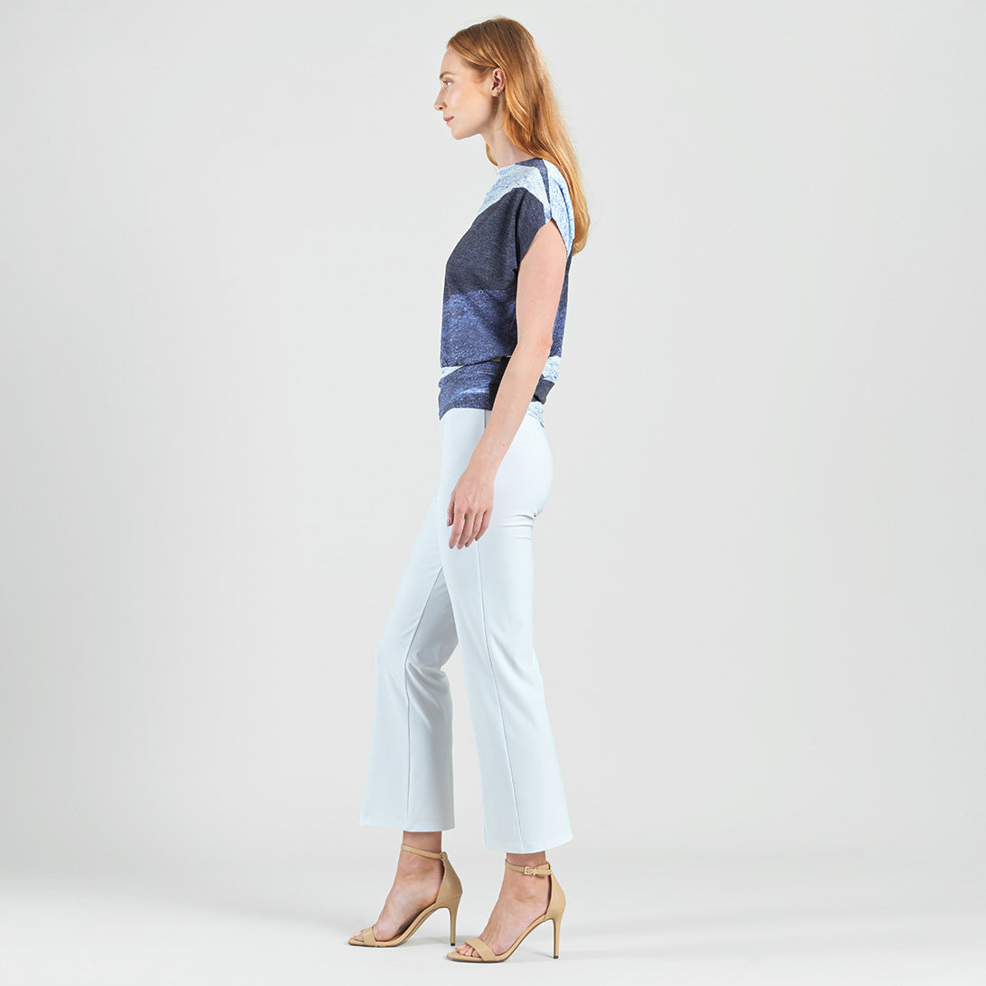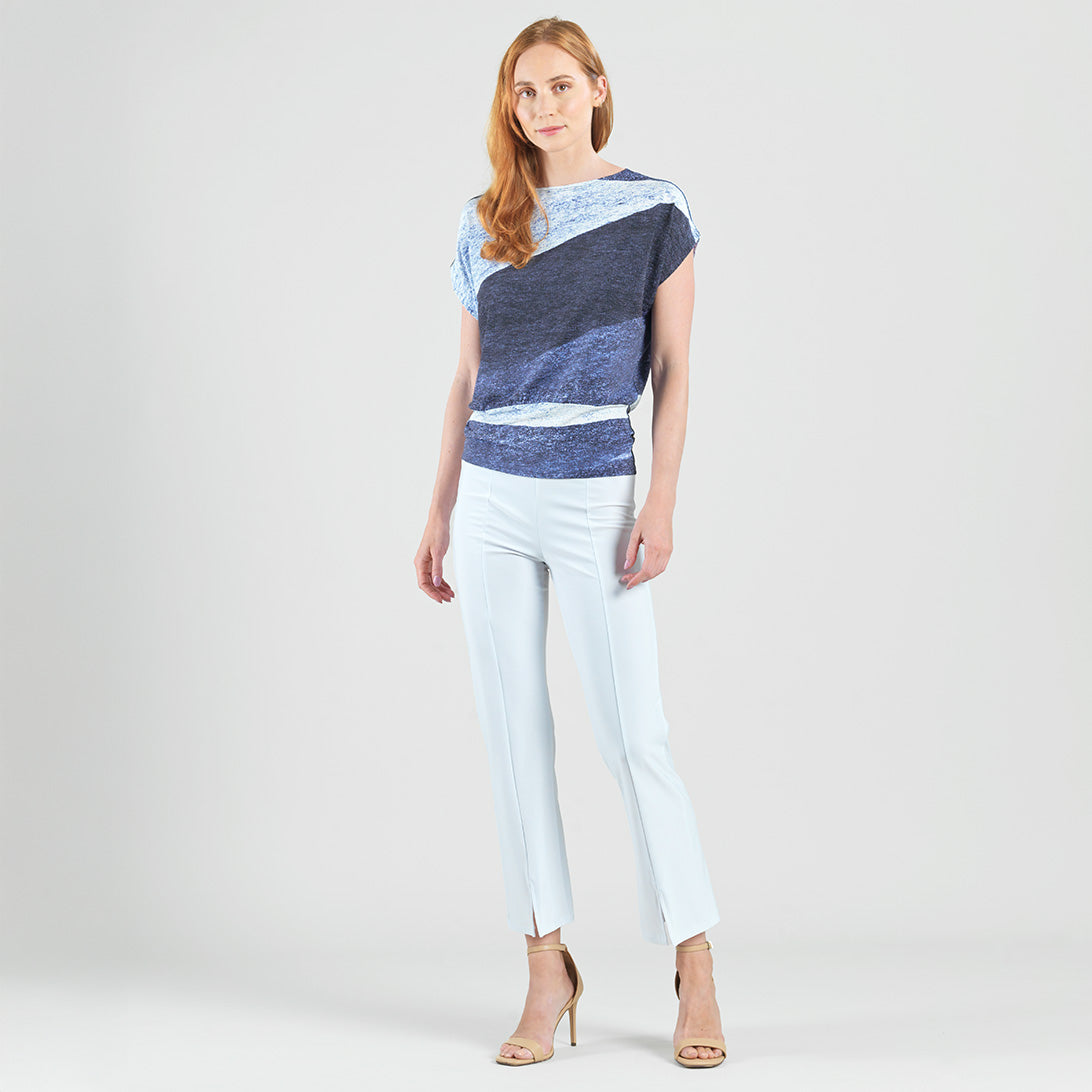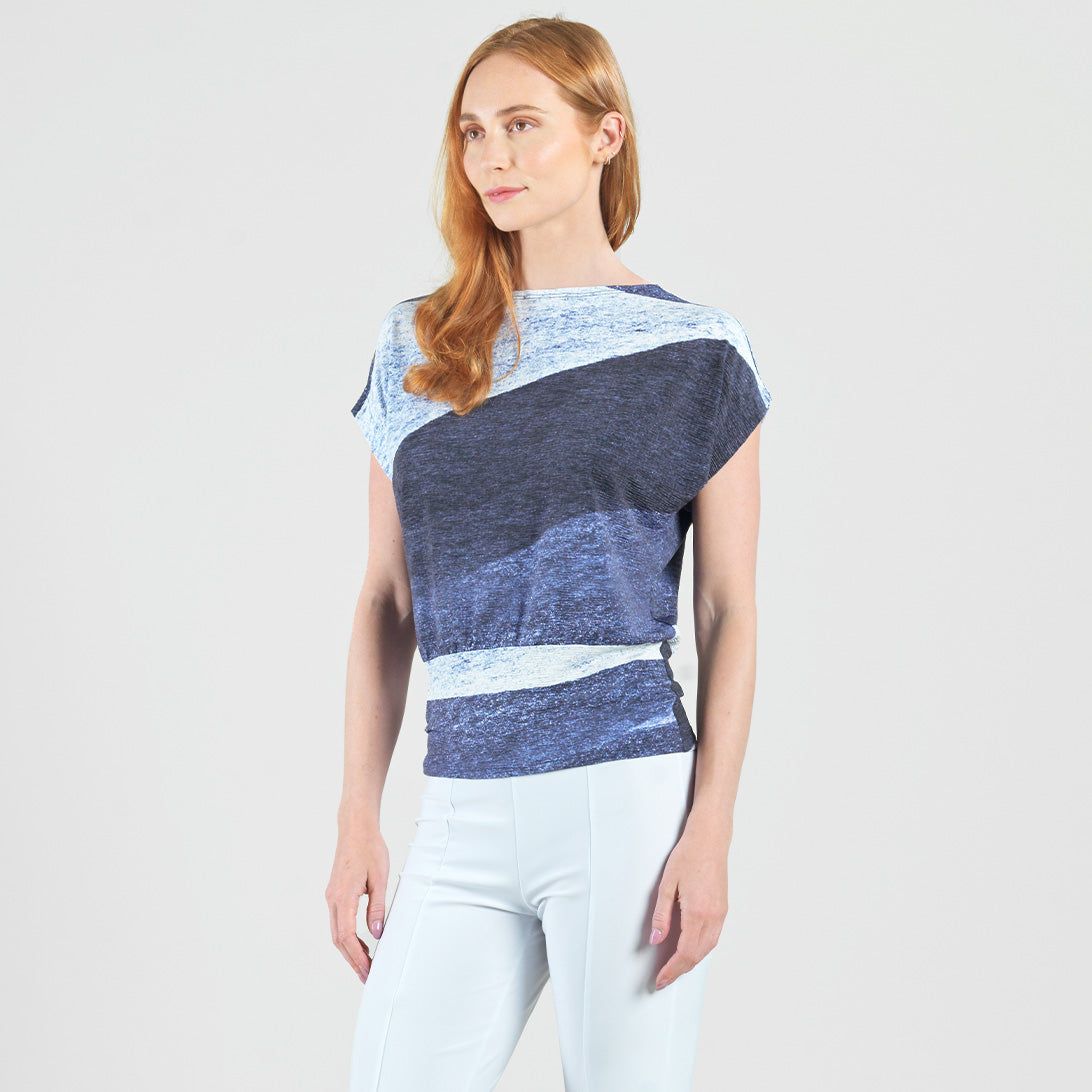 Shine beyond the start in our Lunar Stripe Silky Pleat Dolman Short Sleeve Top! This style features a wide neckline, short dolman sleeves, and a waist-hugging hemline that displays an elegant blouson silhouette. A print that beautifully captures the essence of a moonlit night, featuring shades of indigo, soft black, deep blue specks, and white in scattered stripe-like formations that create a contrast of light and shadow for an ethereal effect. ♥ Each piece is a unique, one-of-a-kind print and print placement will vary. A new, elegant jersey knit fabric, inspired by micro pleated silks. Designed with a silky, texture combined with finely pleated detailing, giving it a soft drape and modern look. It has a lightweight, airy feel, that is cool to the touch and breathable, with modest stretch. Carefree Travel Fabric – Silky Pleat Knit Our signature poly blend fibers offer a luxurious silky feel with a micro-pleated finish. This fabric is rich in texture while being soft, lightweight, and breathable with quick-drying properties. It is cooler than linen or cotton, making it perfect for on-the-go wear.Wrinkle Free Travel Friendly Micro-Pleated Detailing Silky Texture