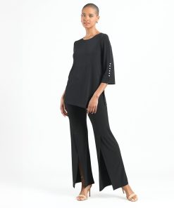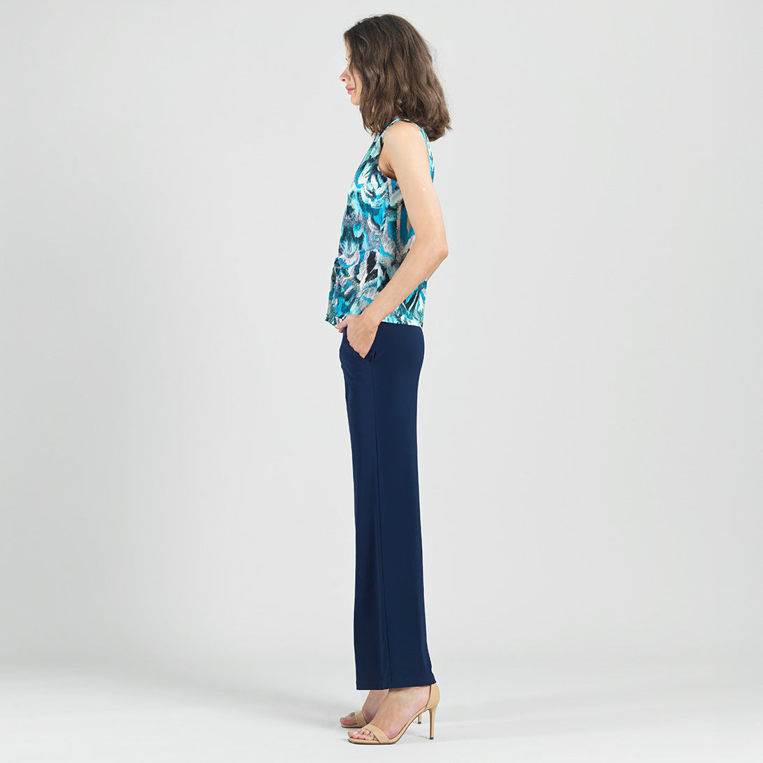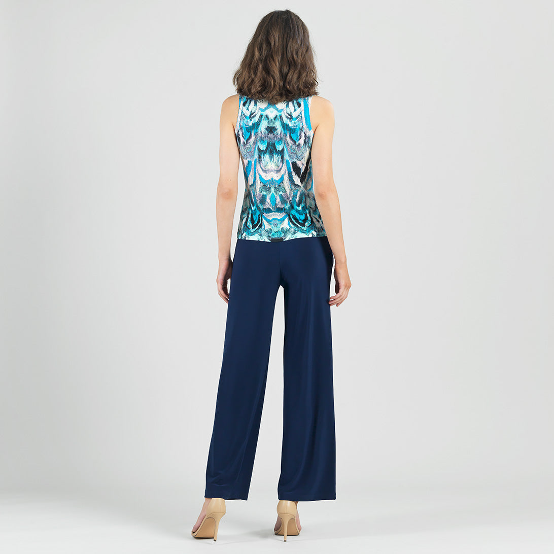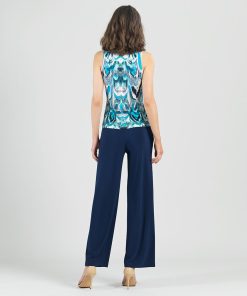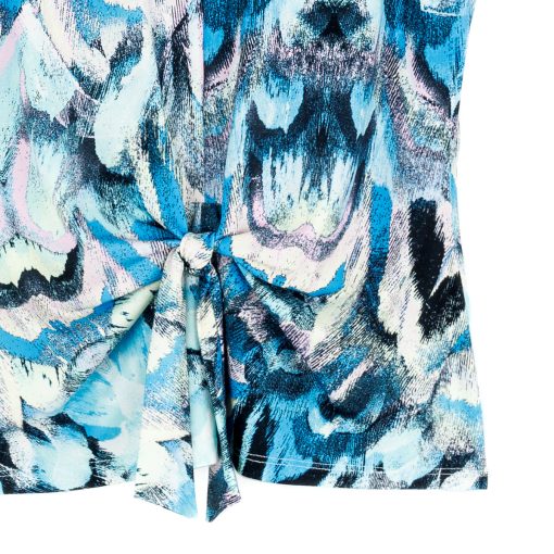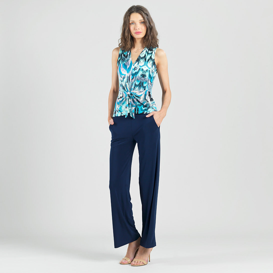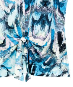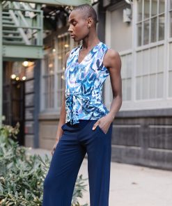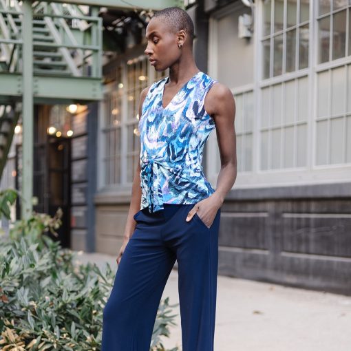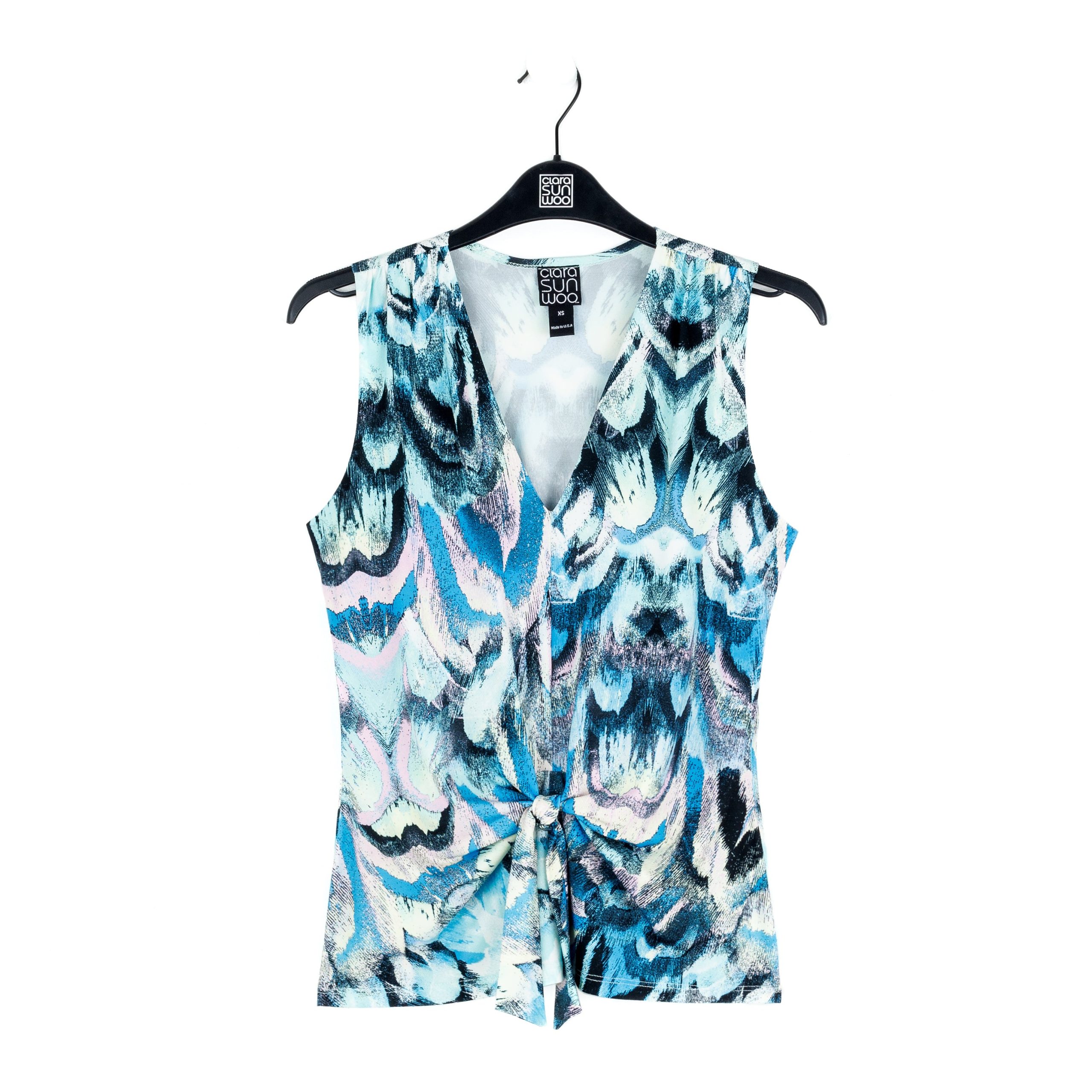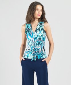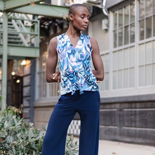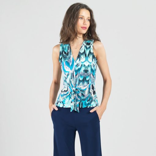 If you’re looking for a style that’s light years ahead, look no further than our Abstract Prism V-Neck Sleeveless Center Front Tie Top! This flattering sleeveless top features a classic v-neckline, pleated shoulder seam, a vertical neck-to-hem center seam, and a front-center waist tie that creates a beautiful draped effect that accentuates your natural figure. An abstract pattern comprised of a kaleidoscope of mesmerizing shades of icy blues, soft lavenders, pastel shades of pink and yellow, and contrasting black lines that blend harmoniously to create a print reminiscent of light through a prism. ♥ Each piece is a unique, one-of-a-kind print and print placement will vary. Carefree Travel Fabric – Soft Silky Knit Our signature poly blend fibers offer luxurious softness with lightweight, wrinkle-free comfort. This easy-care fabric is quick drying and cooler than linen or cotton, making it perfect for on-the-go wear.Wrinkle Free Travel Friendly Ultra Lightweight Soft Knit Fabric Breathable Jersey-Like Feel