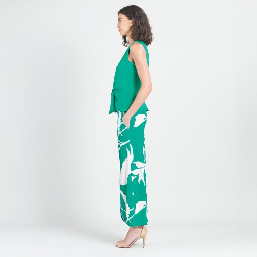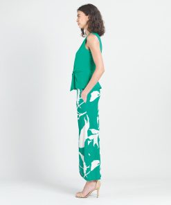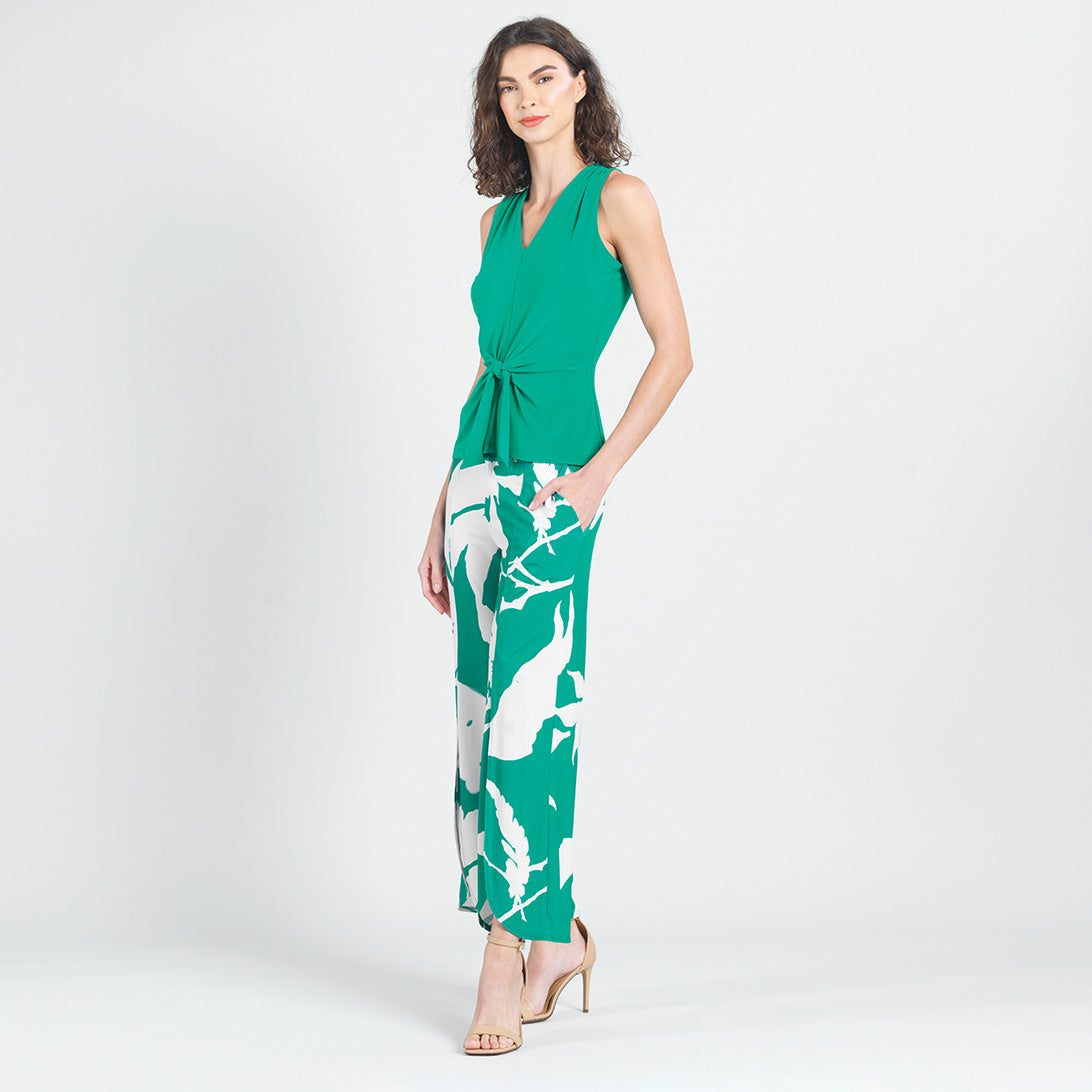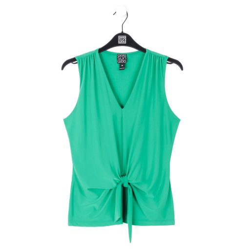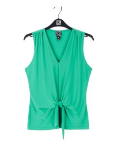 Our Sleeveless V-Neck Center Front Tie Top combines minimalist fashion with a modern twist! This flattering sleeveless top features a classic v-neckline, pleated shoulder seam, a vertical neck-to-hem center seam, and a front-center waist tie that creates a beautiful draped effect that accentuates your natural figure. Our Emerald shade is a vibrant, mid-tone color, with kelly green undertones. Carefree Travel Fabric – Soft Silky Knit Our signature poly blend fibers offer luxurious softness with lightweight, wrinkle-free comfort. This easy-care fabric is quick drying and cooler than linen or cotton, making it perfect for on-the-go wear.Wrinkle Free Travel Friendly Ultra Lightweight Soft Knit Fabric Breathable Jersey-Like Feel