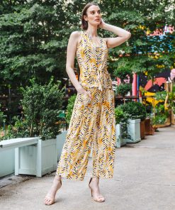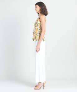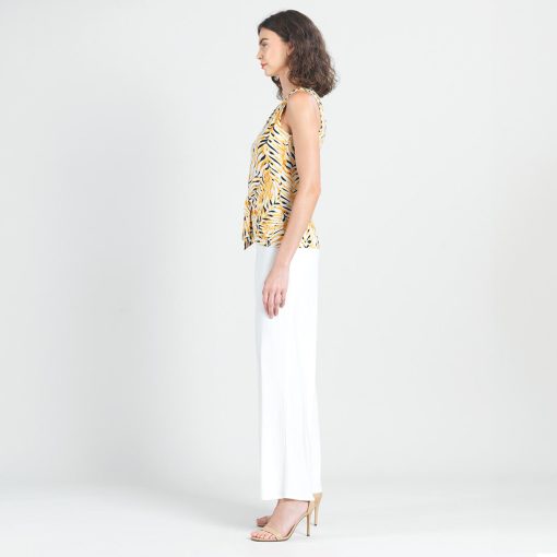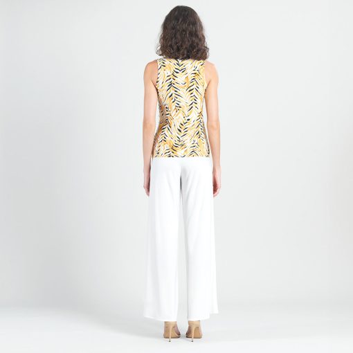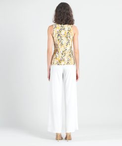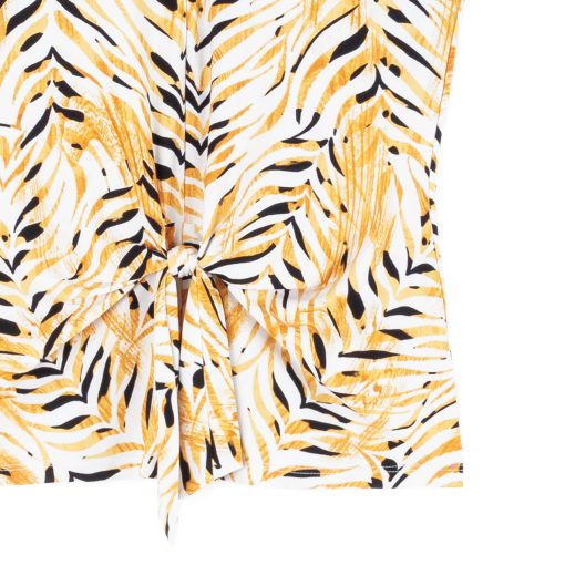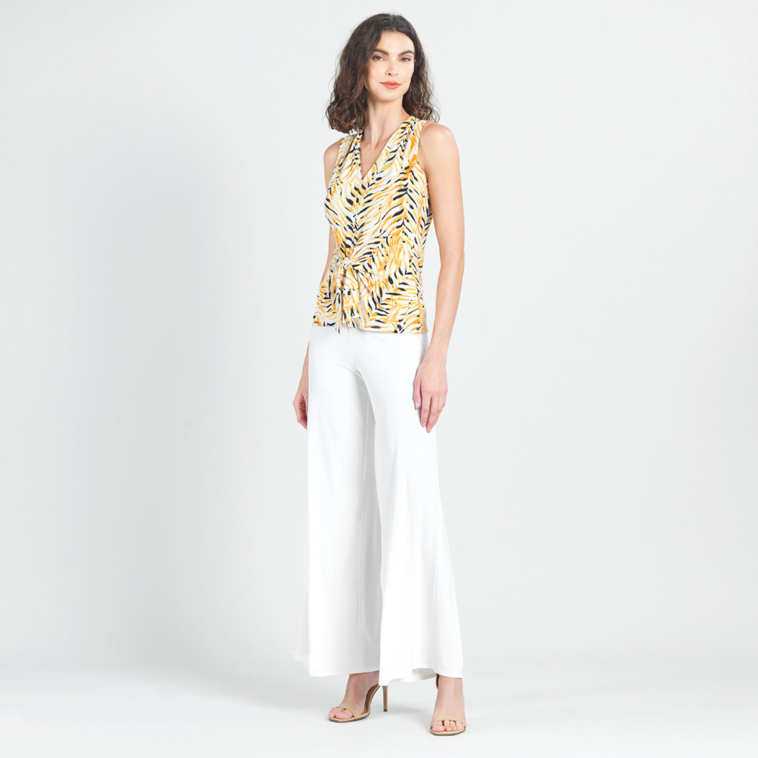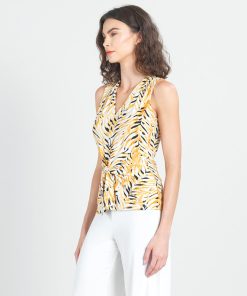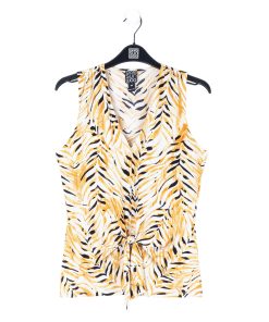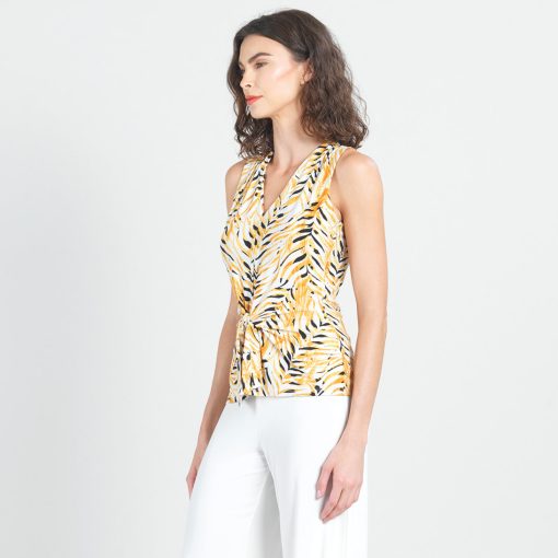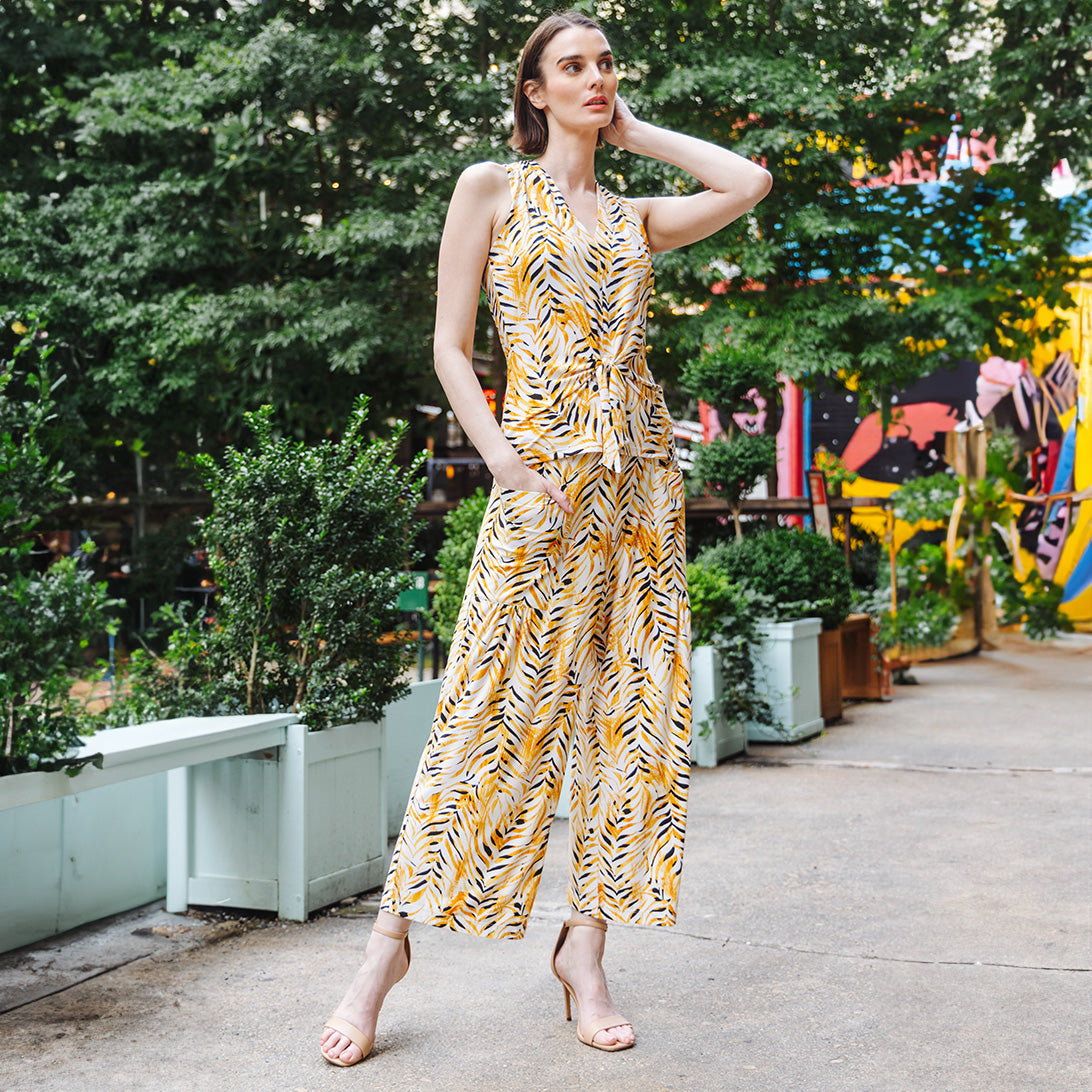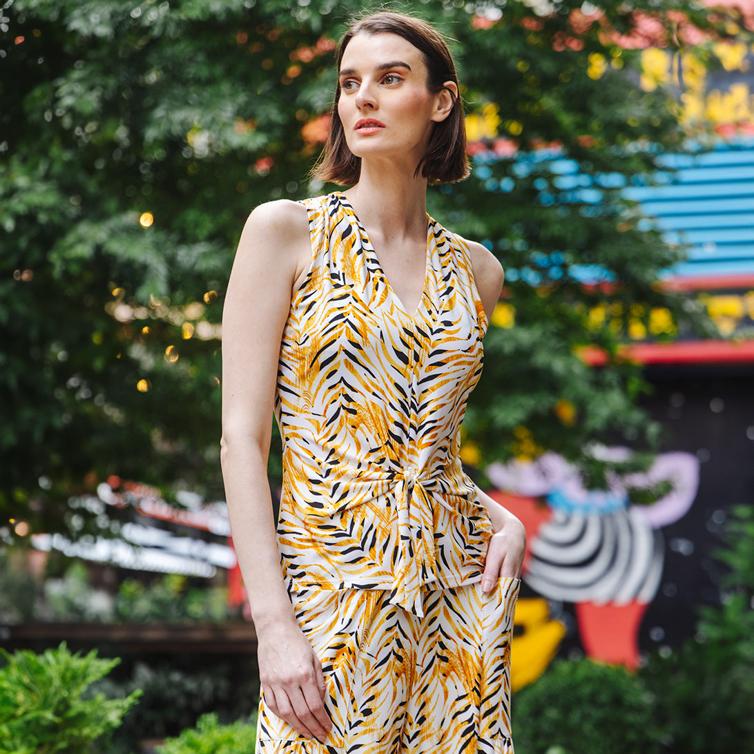 Wander aimlessly because you were born to be seen in our Wild Leaves Sleeveless V-Neck Center Front Tie Top! This flattering sleeveless top features a classic v-neckline, pleated shoulder seam, a vertical neck-to-hem center seam, and a front-center waist tie that creates a beautiful draped effect that accentuates your natural figure. A lively print, displaying a formation of wild leaves in shades of amber, black, and ivory that create striking tiger-like stripes. ♥ Each piece is a unique, one-of-a-kind print and print placement will vary.  Carefree Travel Fabric – Soft Silky Knit Our signature poly blend fibers offer luxurious softness with lightweight, wrinkle-free comfort. This easy-care fabric is quick drying and cooler than linen or cotton, making it perfect for on-the-go wear.Wrinkle Free Travel Friendly Ultra Lightweight Soft Knit Fabric Breathable Jersey-Like Feel