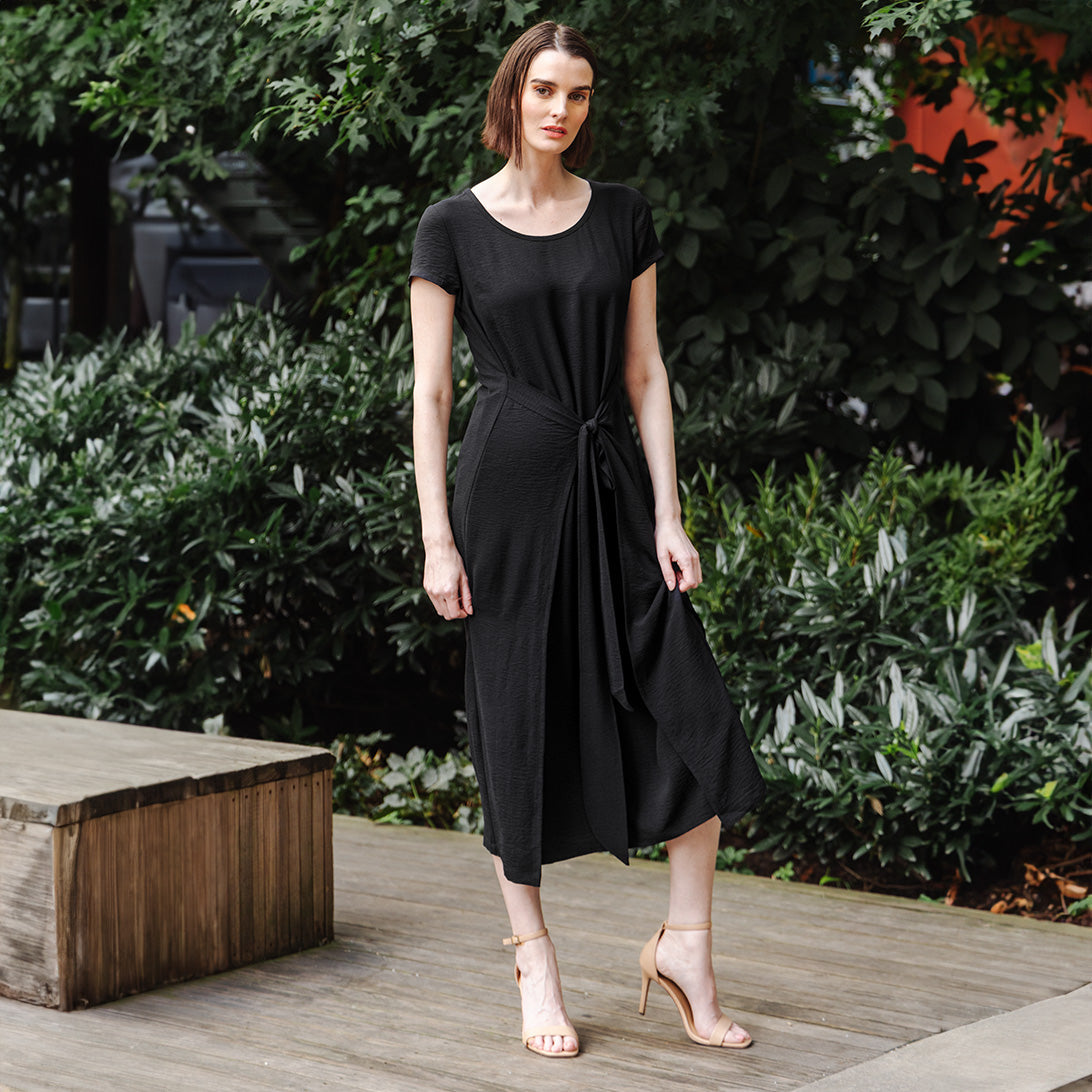 Our Textured Rayon Wrap Overlay Center Tie Midi Dress is just the piece you need if you’re looking to elevate your style! This stunning dress features a scoop neckline, short sleeves, a midi hemline, and a beautiful overlay that wraps around the waist with an adjustable center tie that allows you to accentuate your figure for a flattering silhouette.A new, exclusive-quality matte fabric, inspired by upscale vacation wear. Designed with a soft fluid drape, vintage-like texture, and a light-medium weight finish. It is translucent and durable, allowing it to beautifully retain a luxurious look and eye-catching shape. Carefree Travel Fabric – Soft Textured Rayon Knit Our poly-rayon blend is a substantial light-medium weight fabric, with a soft flowing structure and a crinkle-like texture. This long-lasting fabric is sturdy yet breathable and is easy to maintain. It is thinner than linen, cool to the touch, offers comfortable wear, and is a versatile material so it works for many different occasions!Vintage-Like Texture Travel Friendly Light-Medium Weight Fabric Breathable and Sturdy Finish