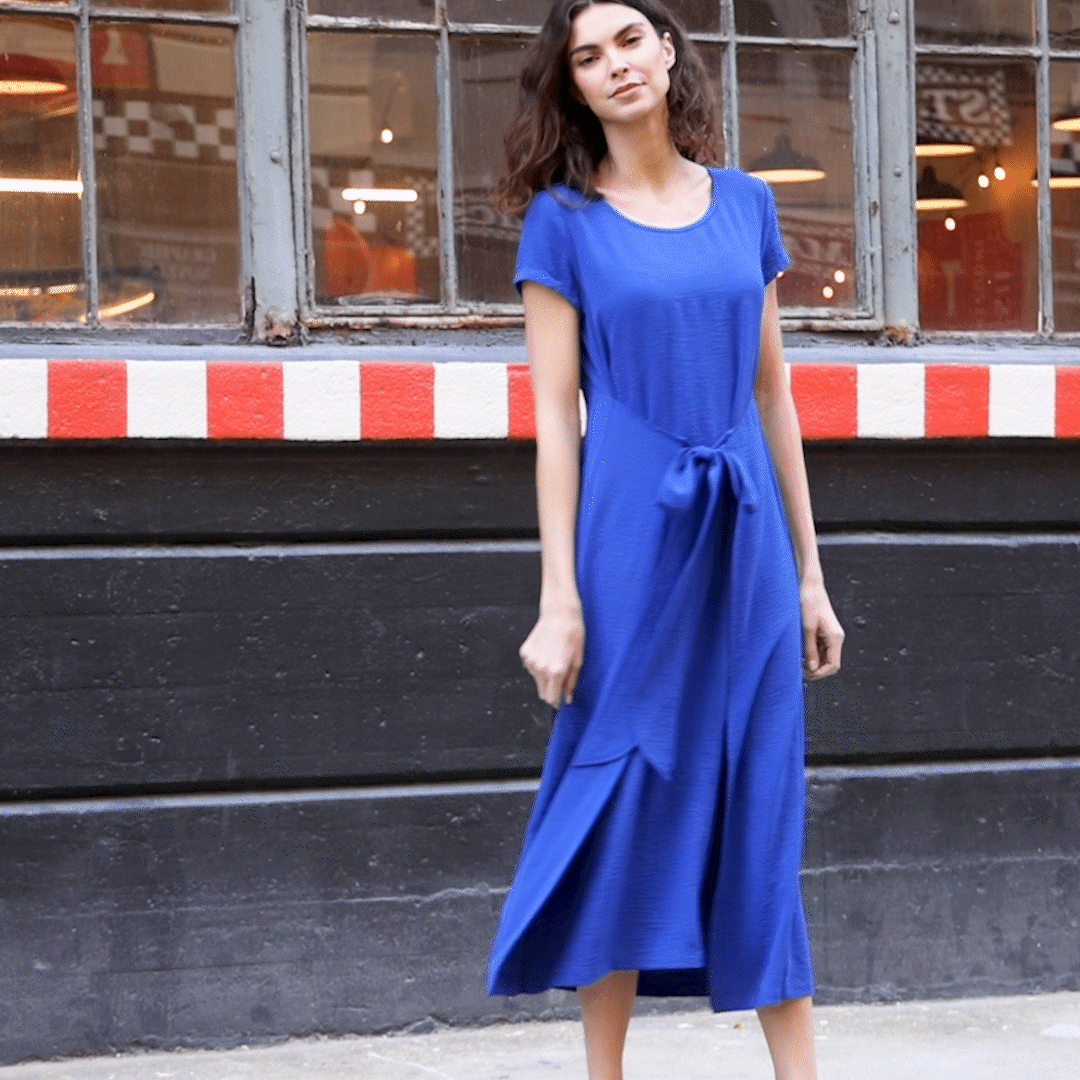 Our Textured Rayon Wrap Overlay Center Tie Midi Dress is just the piece you need if you’re looking to elevate your style! This stunning dress features a scoop neckline, short sleeves, a midi hemline, and a beautiful overlay that wraps around the waist with an adjustable center tie that allows you to accentuate your figure for a flattering silhouette. Our rayon Cobalt shade is a true royal blue color with deep vivid undertones.A new, exclusive-quality matte fabric, inspired by upscale vacation wear. Designed with a soft fluid drape, vintage-like crepe texture, and a light-medium weight finish. It is translucent and durable, allowing it to beautifully retain a luxurious look and eye-catching shape. Carefree Travel Fabric – Soft Textured Rayon Knit Our poly-rayon blend is a substantial light-medium weight fabric, with a soft flowing structure and a crinkle-like texture. This long-lasting fabric is sturdy yet breathable and is easy to maintain. It is thinner than linen, cool to the touch, offers comfortable wear, and is a versatile material so it works for many different occasions!Vintage-Like Texture Travel Friendly Light-Medium Weight Fabric Breathable and Sturdy Finish