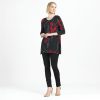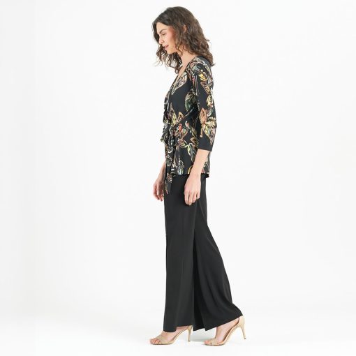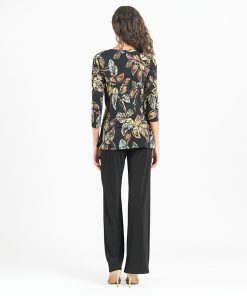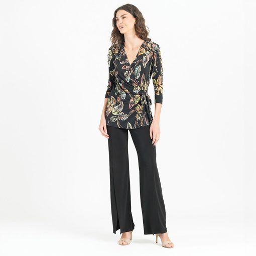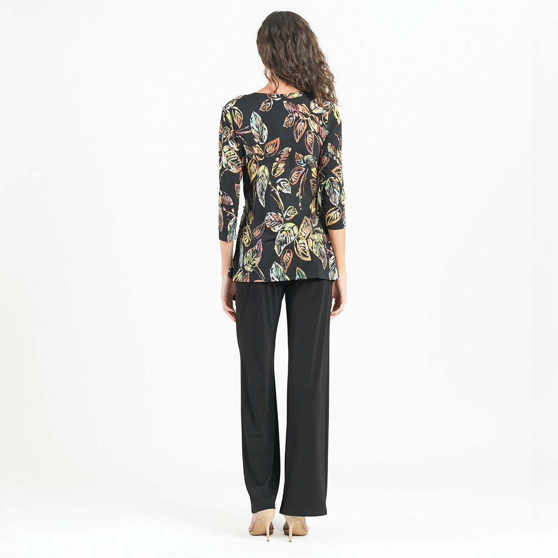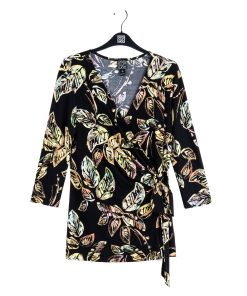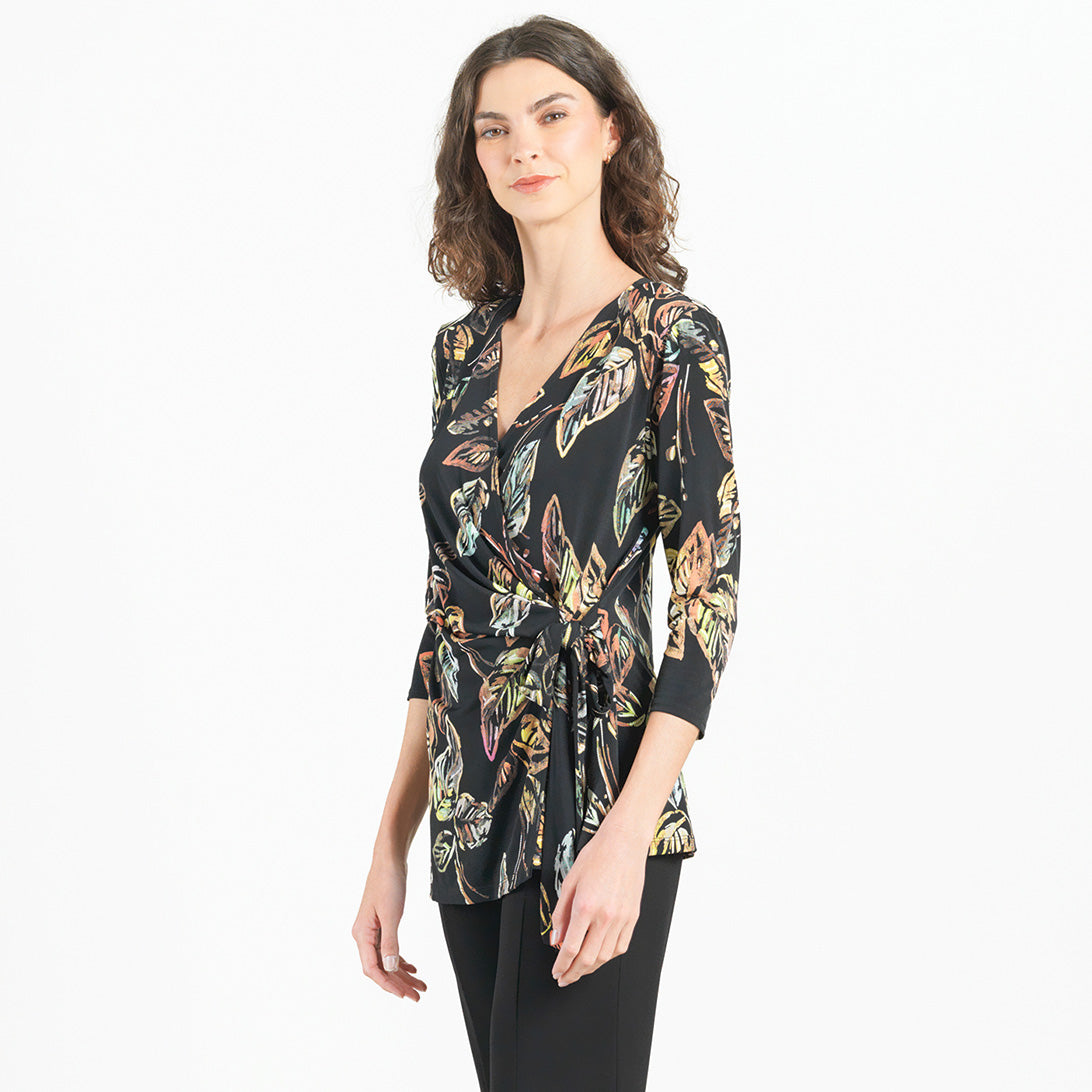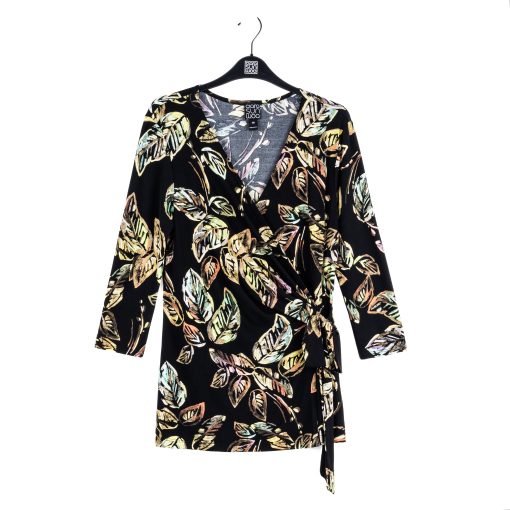 Embrace the beauty of nature and branch out in style with our Leaf Colorburst Surplice Faux Wrap Side Tie Tunic! This tunic features a surplice neckline, 3/4 length sleeves, faux wrap overlay with a side tie detail, and a straight hemline. A serene print featuring leaves and branches that blend rust, soft yellows, lilacs, greens, blues, and white textured embossed-like threading against a black background to create a gentle symphony of tranquil color. ♥ Each piece is a unique, one-of-a-kind print and print placement will vary. Carefree Travel Fabric – Soft Silky Knit Our signature poly blend fibers offer luxurious softness with lightweight, wrinkle-free comfort. This easy-care fabric is quick drying and cooler than linen or cotton, making it perfect for on-the-go wear.Wrinkle Free Travel Friendly Ultra Lightweight Soft Knit Fabric Breathable Jersey-Like Feel