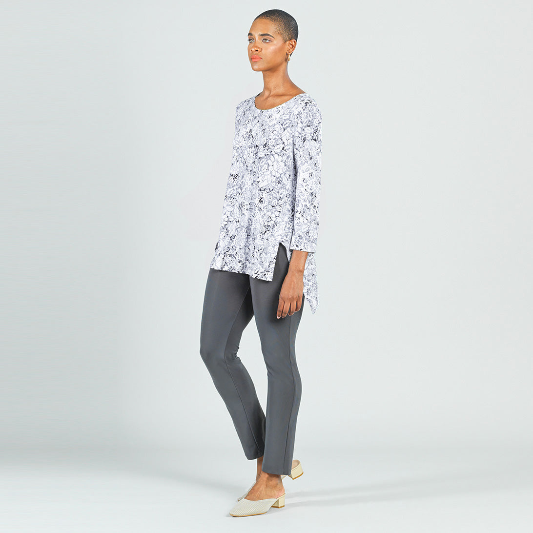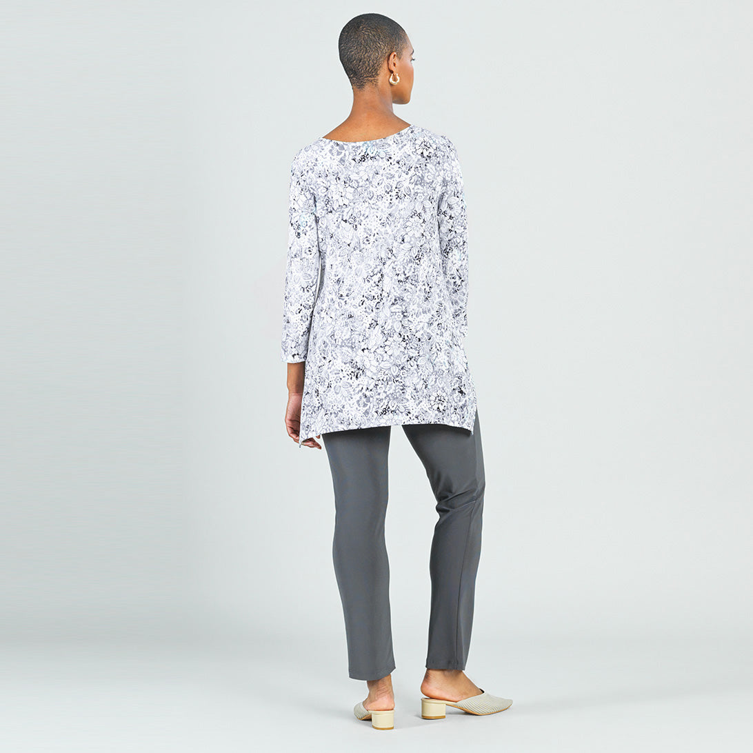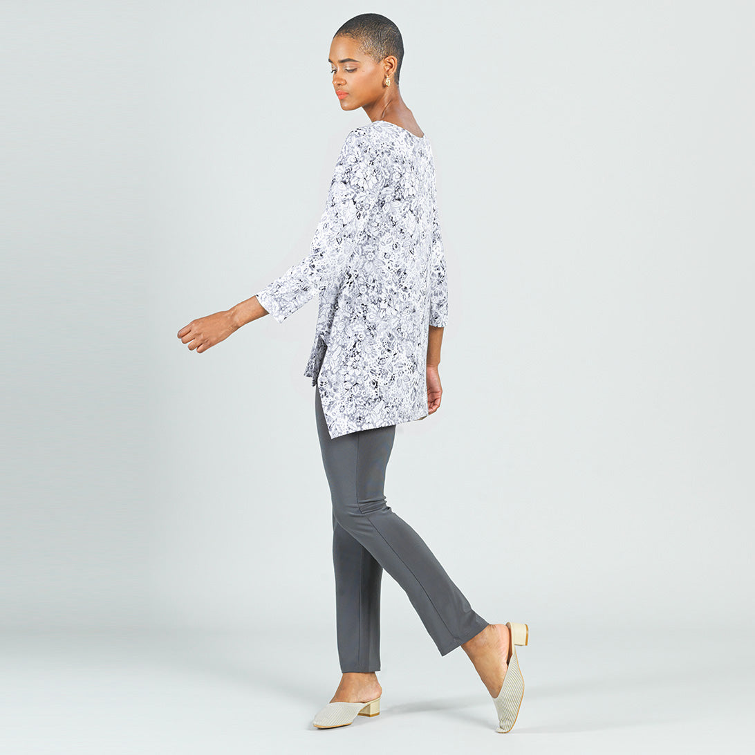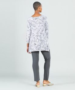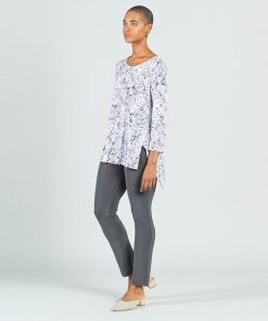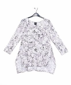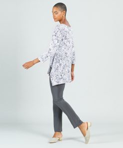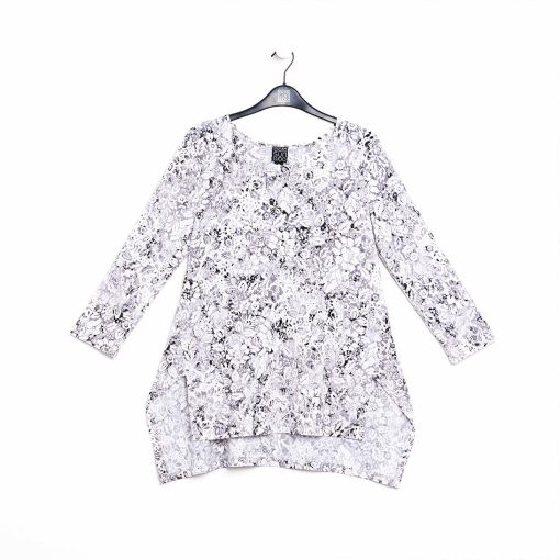 The fashion forecast shows that our Floral Rain Parachute Hem Tunic is sure to brighten any day! Featuring a round neckline, 3/4 length sleeves, and a side vent parachute hemline. An exuberant print, displaying arrangements of mini flowers in various shades of cool grey, and a white embossed texture that creates a dimensional raindrop effect. ♥ Each piece is a unique, one-of-a-kind print and print placement will vary. Carefree Travel Fabric – Soft Silky Knit with Embossed TextureOur signature poly blend fibers feature an embossed texture print. It’s breathable, quick-drying, and wrinkle-free – making it ideal for travel. Cooler than linen or cotton and easy to care for, it provides an unbeatable combination of style andcomfort.Wrinkle Free Travel Friendly Ultra Lightweight Soft Knit Fabric Breathable Jersey-Like Feel Embossed Threading Detail