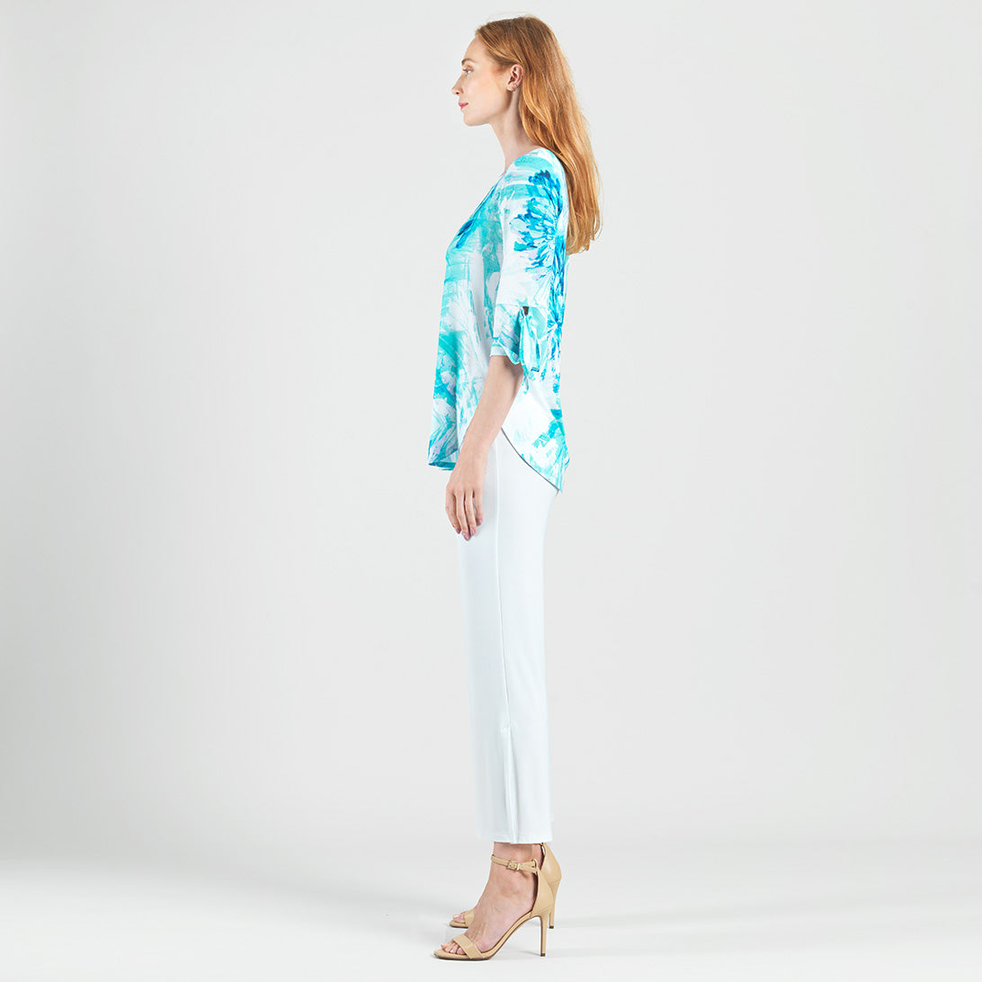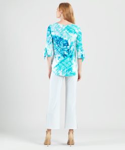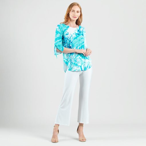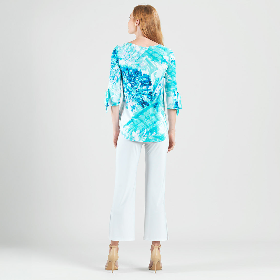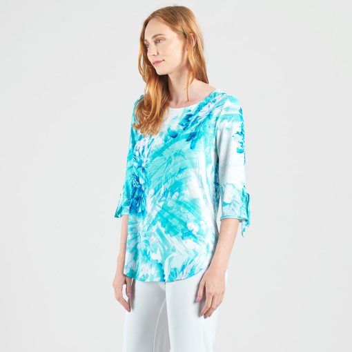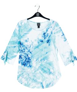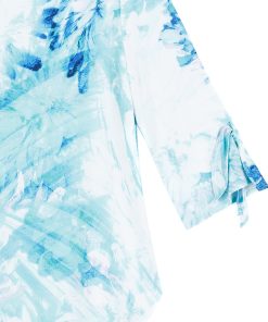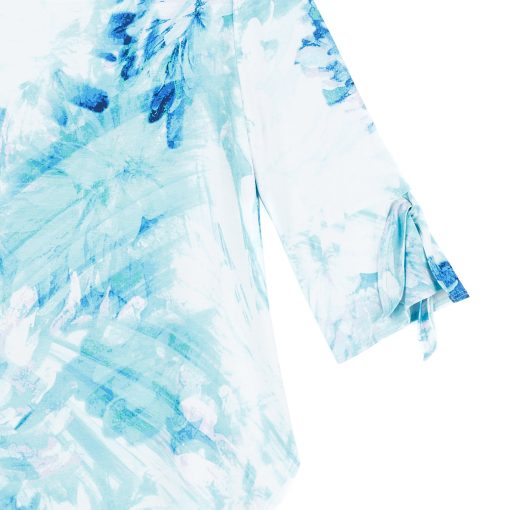 Splash into the fashion scene in our Ocean Petal Tie Cuff Curved Hem Tunic! This stunning tunic features 3/4 length sleeves with charming tie cuff details, a scoop neckline, and a curved hemline that creates dual side vents with a rounded, flowing silhouette.A refreshing print featuring soft floral petals and painterly brushstrokes in vibrant shades of turquoise, seafoam, white, blue, and subtle hints of lilac that blend seamlessly to evoke a tranquil watercolor finish. ♥ Each piece is a unique, one-of-a-kind print and print placement will vary. Carefree Travel Fabric – Soft Silky Knit Our signature poly blend fibers offer luxurious softness with lightweight, wrinkle-free comfort. This easy-care fabric is quick drying and cooler than linen or cotton, making it perfect for on-the-go wear.Wrinkle Free Travel Friendly Ultra Lightweight Soft Knit Fabric Breathable Jersey-Like Feel