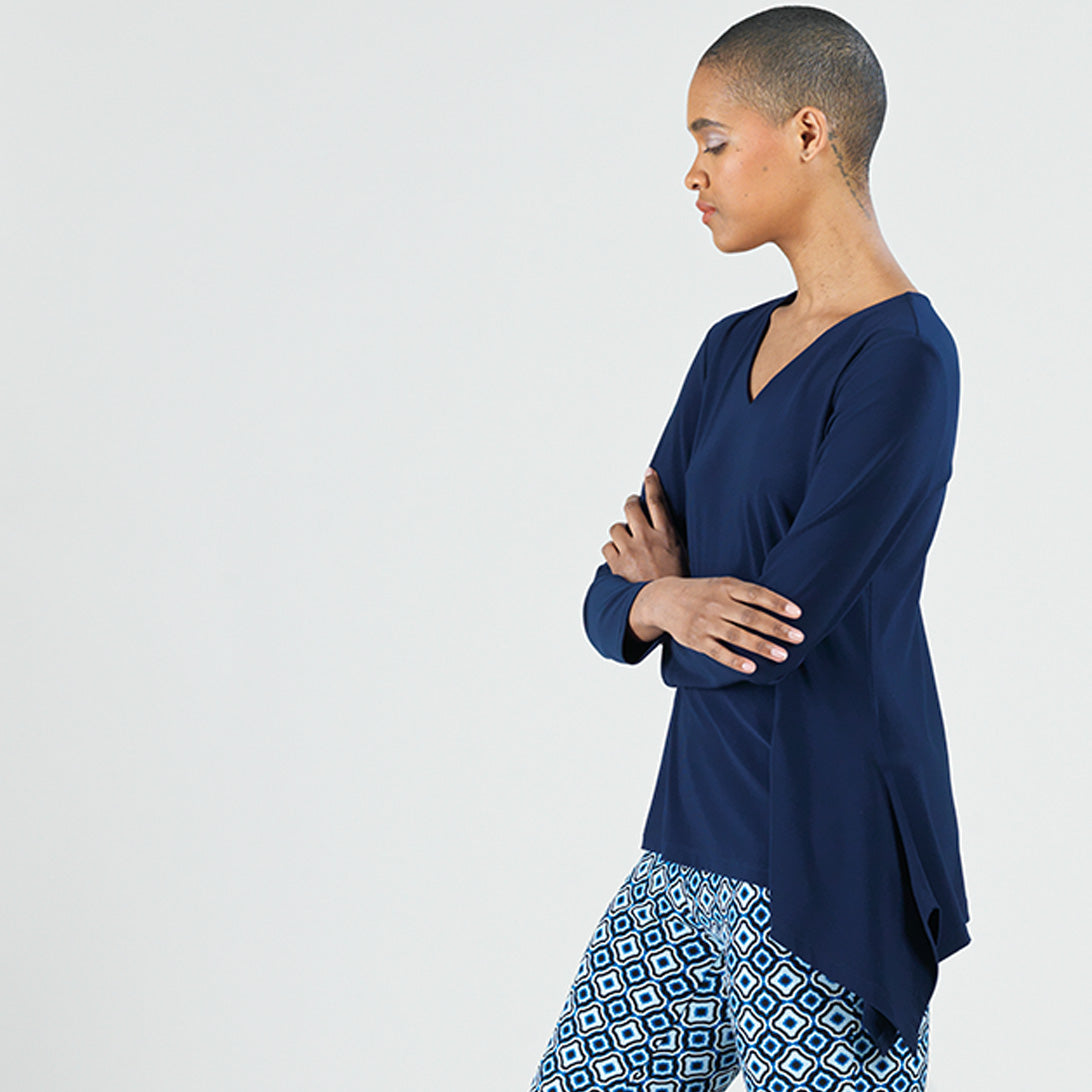 When all else fails, just go with the V-Neck Side Flow Top! Featuring a v-neckline, long sleeves, and an innovative, softly draped side-flowing hemline.Carefree Travel Fabric – Soft Silky Knit Our signature poly blend fibers offer luxurious softness with lightweight, wrinkle-free comfort. This easy-care fabric is quick drying and cooler than linen or cotton, making it perfect for on-the-go wear. Wrinkle Free Travel Friendly Ultra Lightweight Soft Knit Fabric Breathable Jersey Like Feel