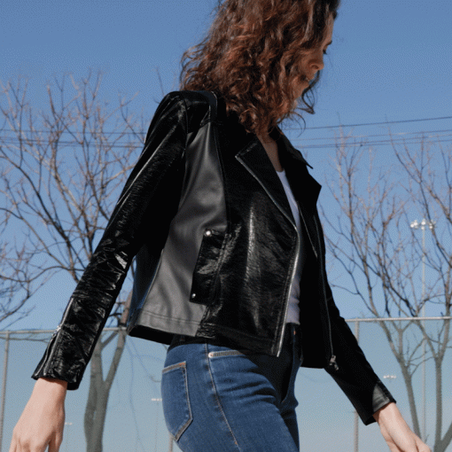 Gloss up your wardrobe and shine through in our Vinyl + Liquid Leather Panel Zip Cuff Pocket Jacket! The first of its kind from Clara Sunwoo features a silver asymmetrical zip closure with a standard collar and notched lapel, satin-like interior lining, long sleeves with zip cuff closures and seam work, side pockets with snap details, and black front and back panels made from our soft-sheen liquid leather fabric for an upscale contrast. **please refer to size recommendation & care guide tabs below Our Black shade is a glossy color, with a shiny, reflective finish. Inspired by the luxurious look of patent leather, this new fabric has a reflective surface and smooth texture. Designed with a high shine and a slick, glossy finish for a contemporary edge that provides a polished, high-end look. It has a stiff drape and structural build, excellent durability, and a water-resistant quality making it easier to clean and maintain. Vinyl-Polyurethane w/ Liquid Leather PanelsMade from a vinyl polyurethane fabric that mimics the look of genuine patent leather. Elevated by an exceptional gloss and reflective vibrancy with contrasting panels coated in a vegan-friendly, faux leather with a soft sheen finish. Crafted with water-resistant properties, which makes it practical and easy to clean, with a durable quality that stands the test of time, ensuring longevity and repeated wear.No-Stretch High-Shine, Glossy Finish Soft-Sheen Liquid Leather Panels Satin-Like Lining Zip ClosureVegan-Friendly